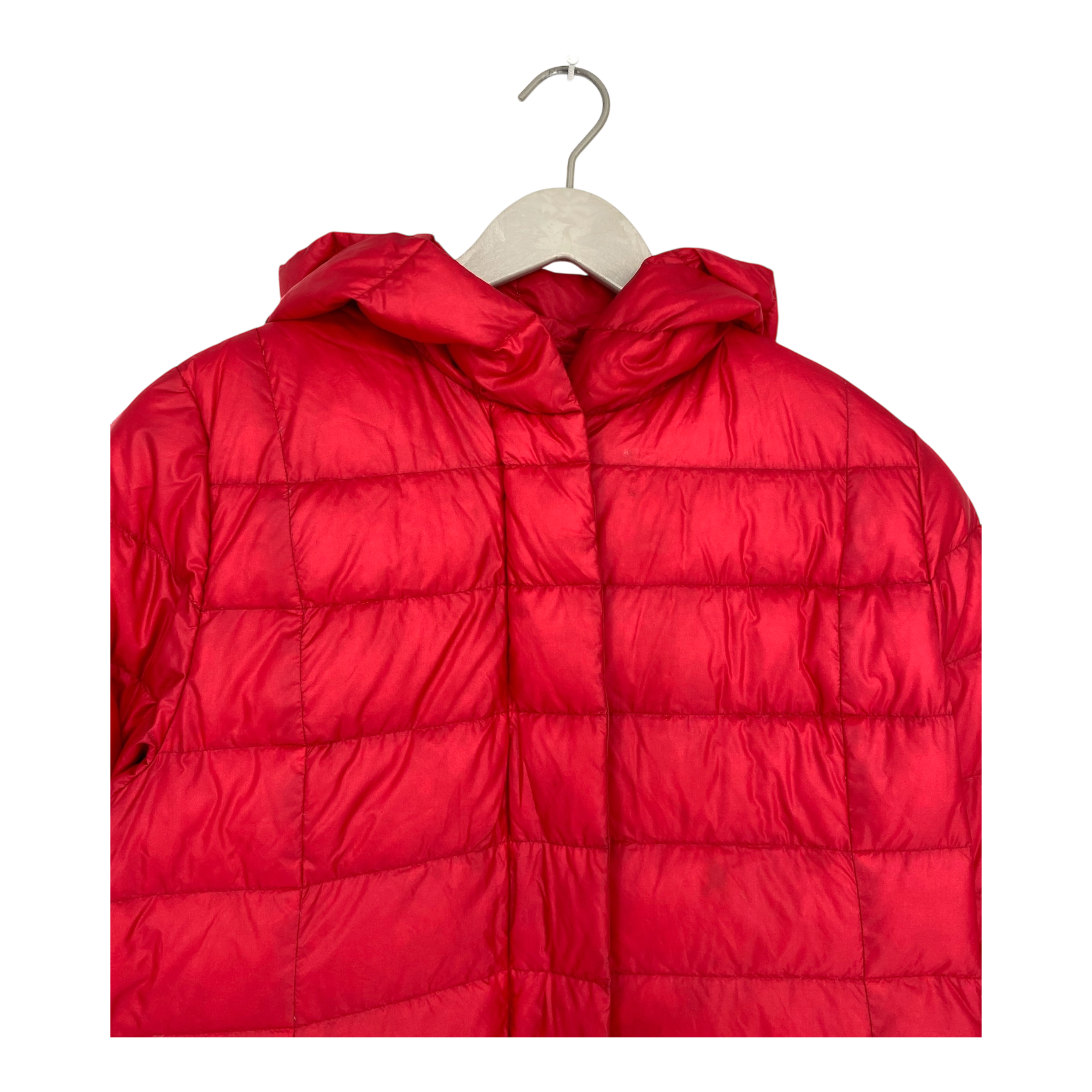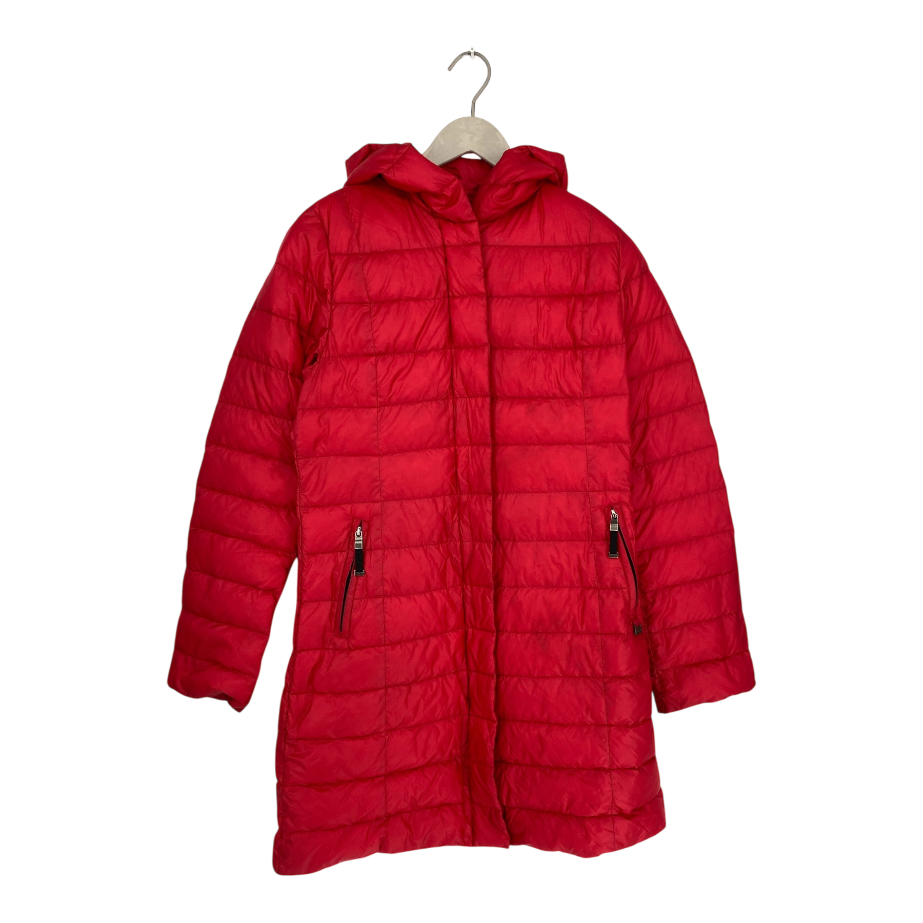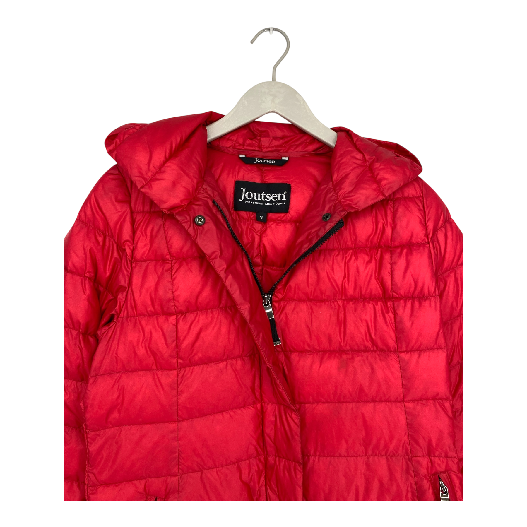 Joutsen Sara jacket is a lightweight down jacket with a horizontal stitching. The jacket has two side pockets and a warm hood that can be worn up or down according to the weather.