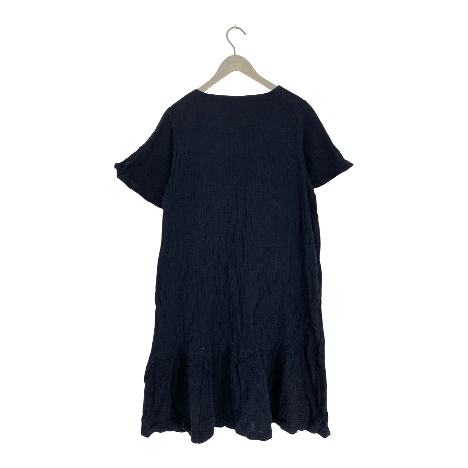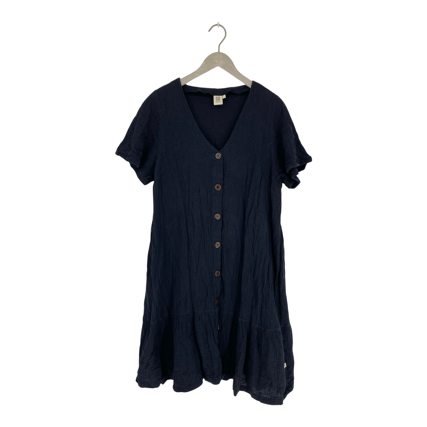 Kaiko women's frill button dress is made from woven organic cotton muslin. Frill button dress has a loose fit, a v-neck and lightly flared sleeves, with a row of buttons down the front. The hem is frilled with a 25cm high frill. The hem is approximately knee-length. No lining.
