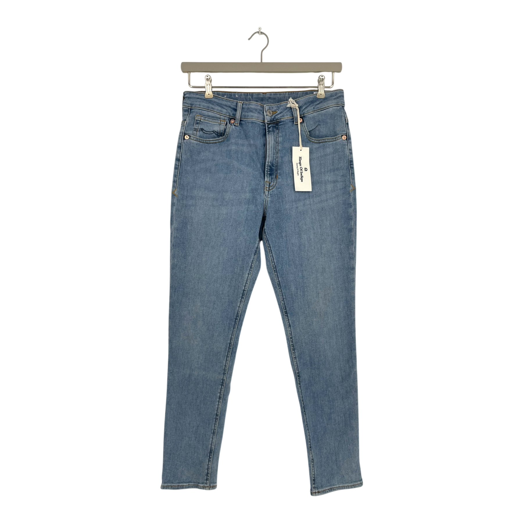 Kings of Indigo christina high-waisted skinny jeans in light blue wash. Features classic five-pocket styling with button fly closure. High-rise waistline with slim fit through leg.