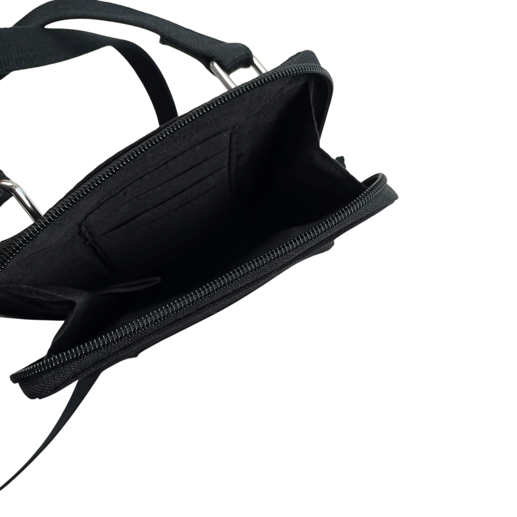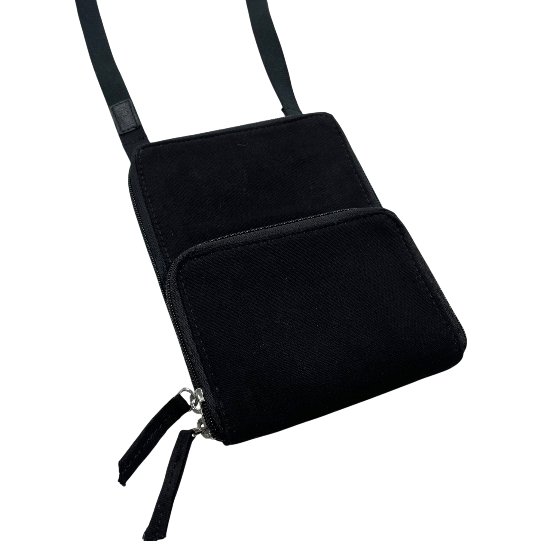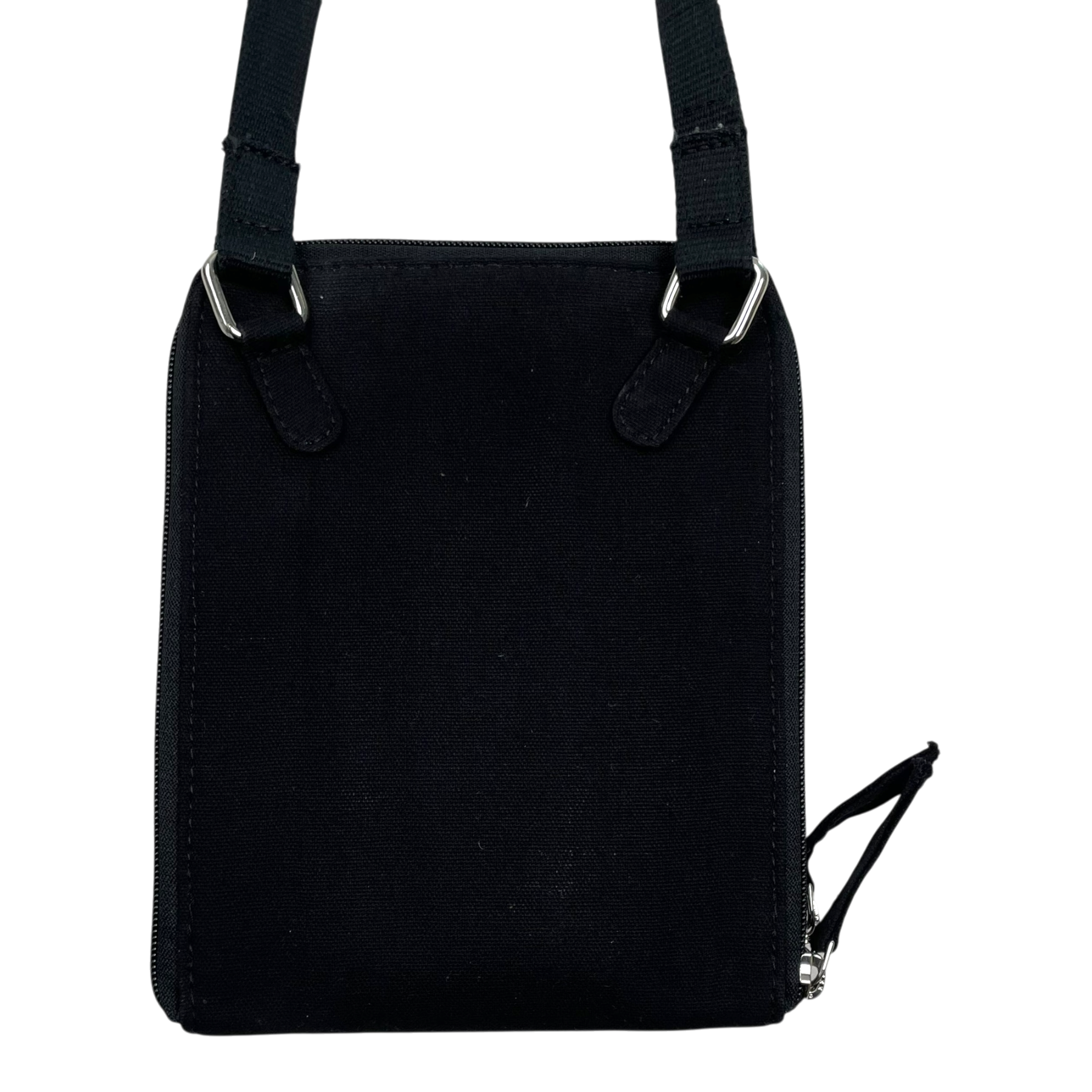 LUMI canvas crossbody bag featuring an adjustable shoulder strap and front zippered pocket. The bag has a structured rectangular shape with rounded corners and zip closure. Includes leather-like trim details and metal hardware.
