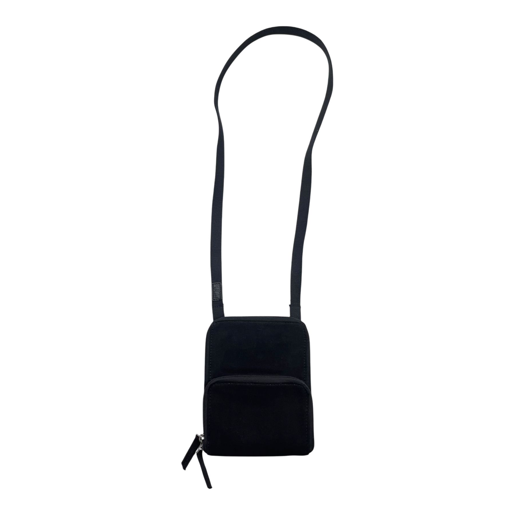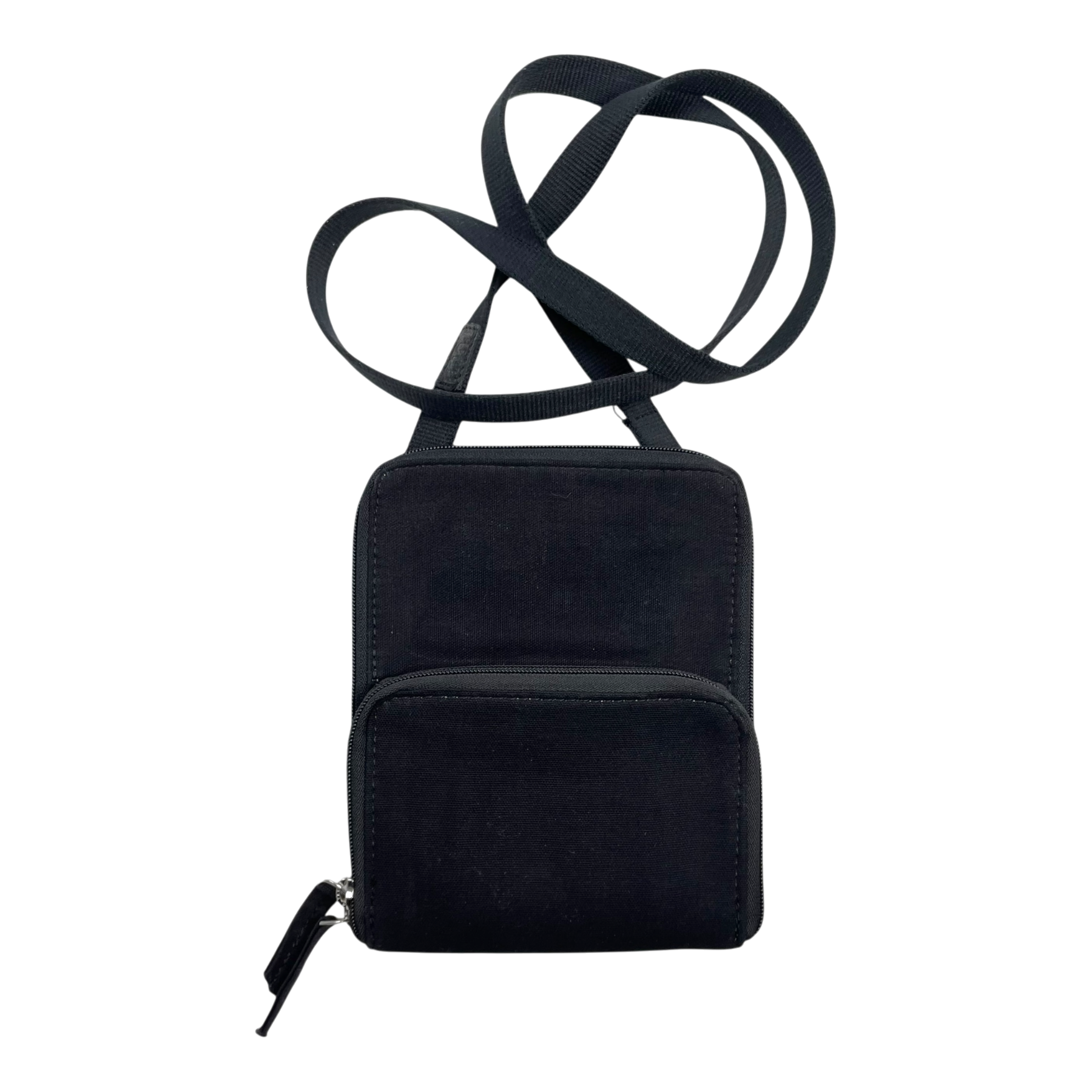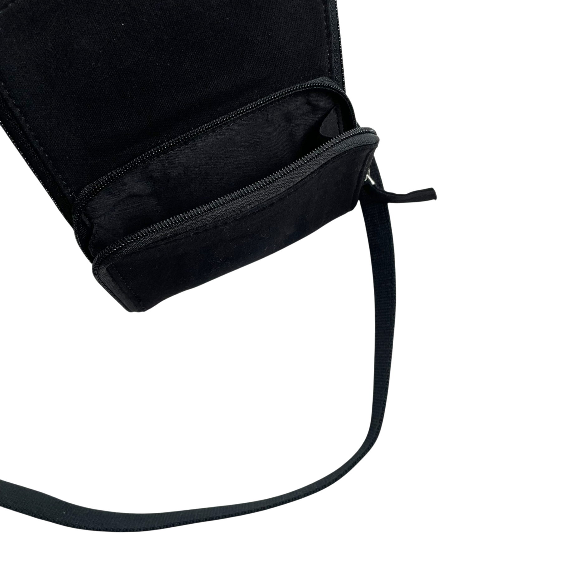 LUMI canvas crossbody bag featuring an adjustable shoulder strap and front zippered pocket. The bag has a structured rectangular shape with rounded corners and zip closure. Includes leather-like trim details and metal hardware.