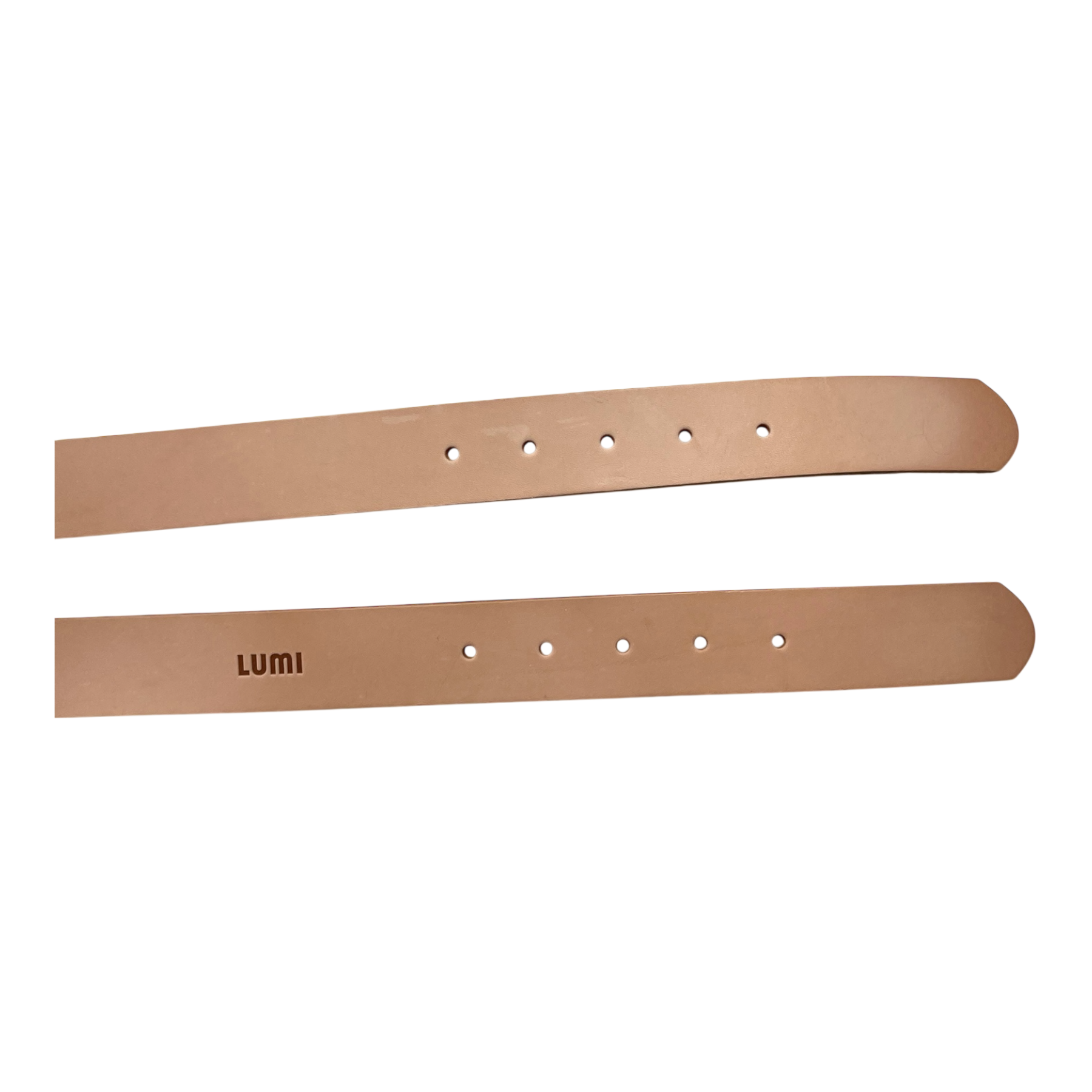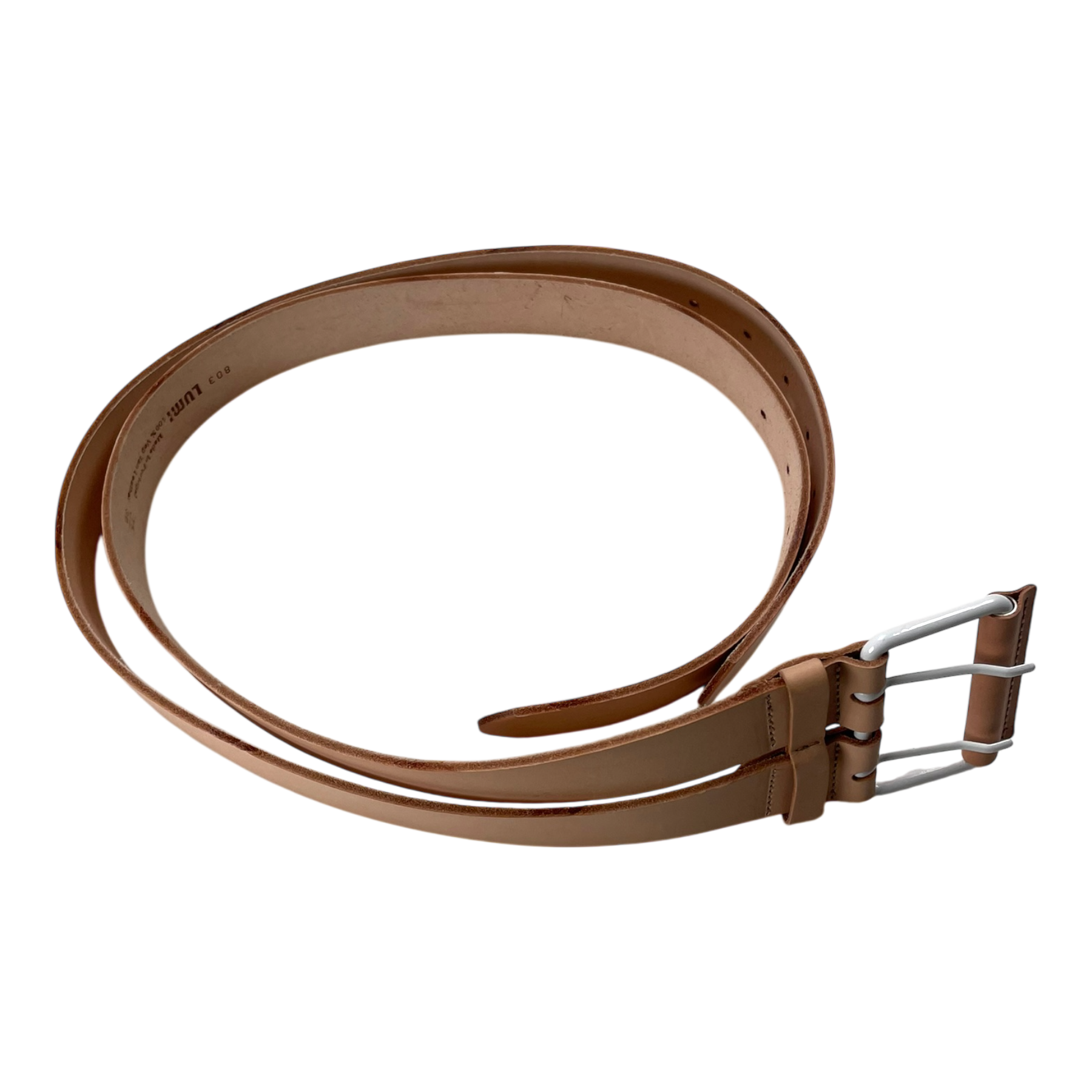 LUMI Double Belt Natural is made from thick vegetable-tanned leather and features a 9 cm white buckle. It can be worn at the waist or hips and is perfect for styling over dresses, shirts, or coats, combining durability with versatile fashion appeal.