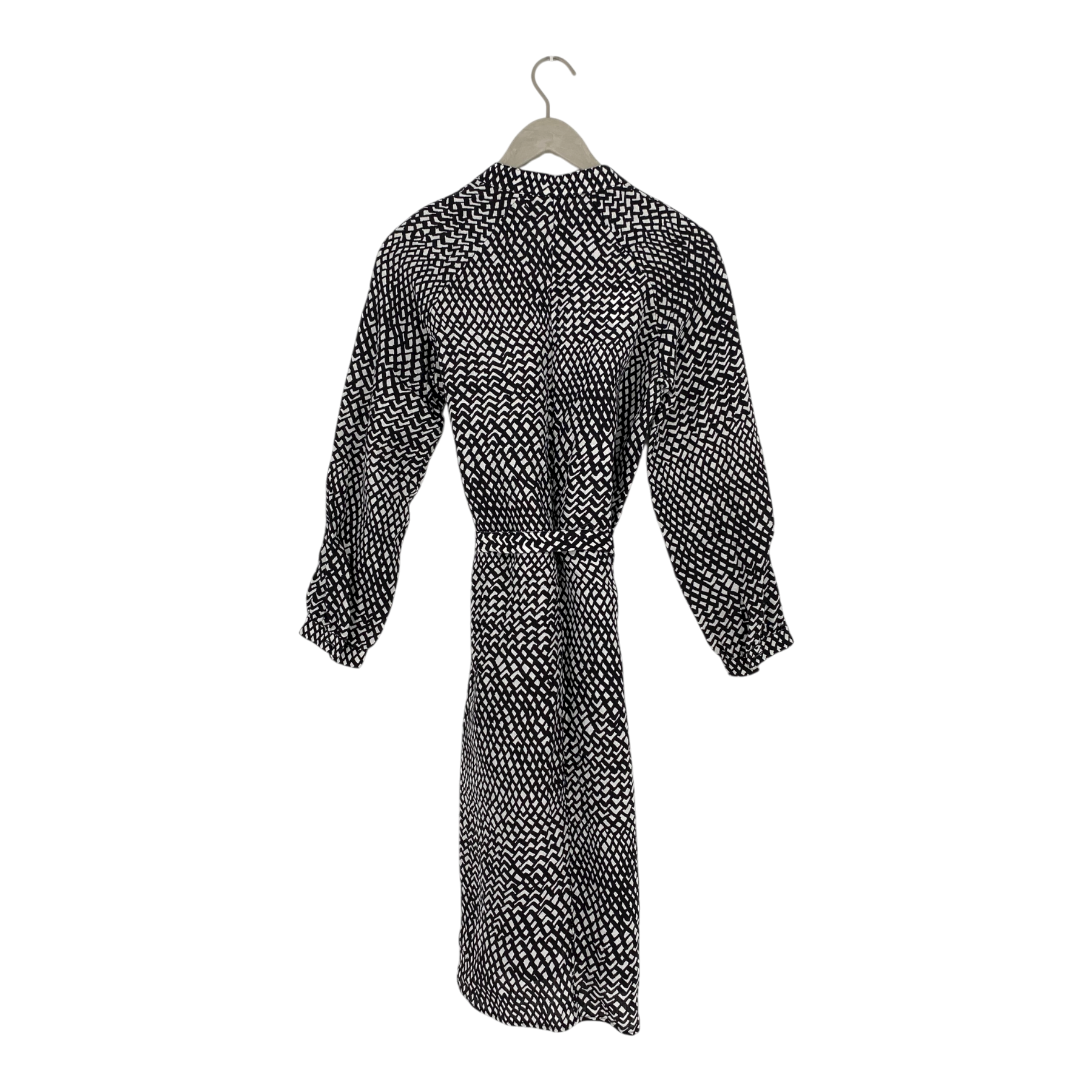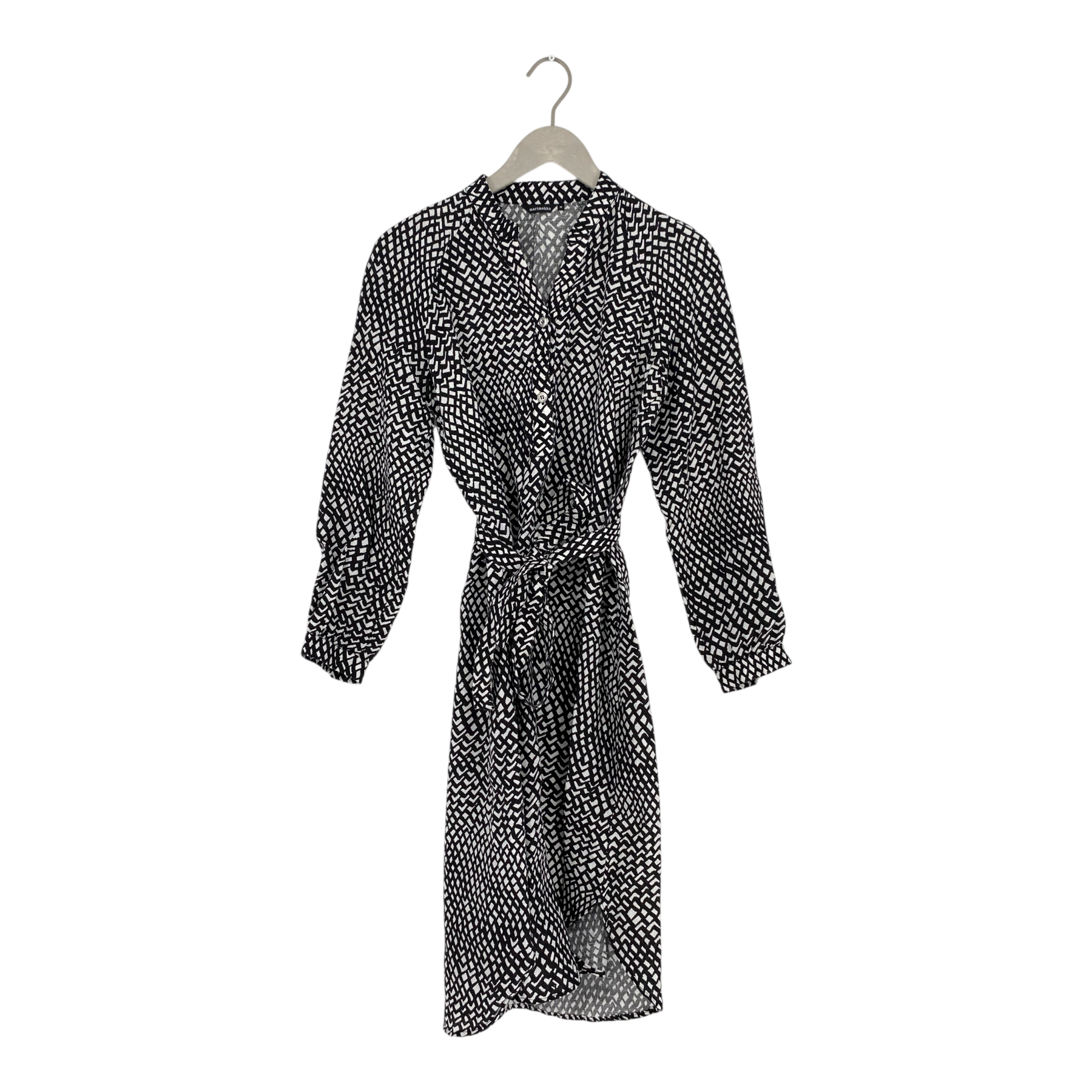 Marimekko Edla linen dress in the Timangi print. The dress has long sleeves and a detachable fabric belt. Most likely fits sizes XS-2XS. The fabric tag is cut and there is some wear on the fabric.