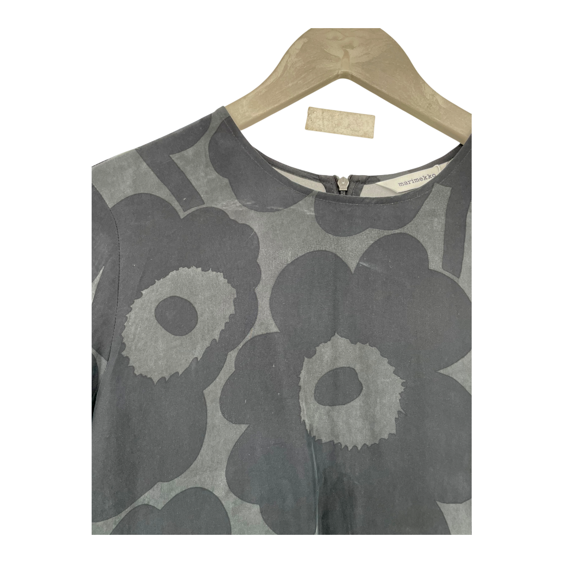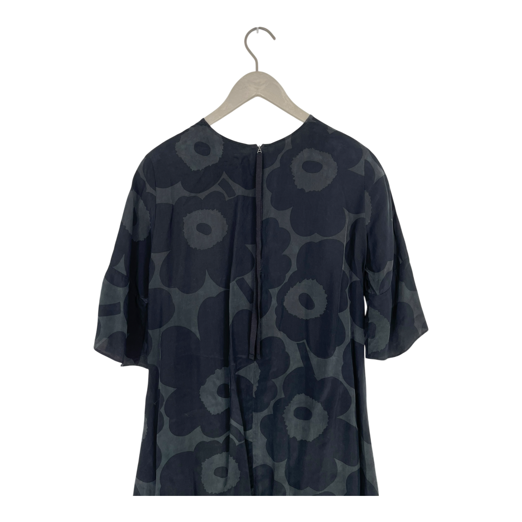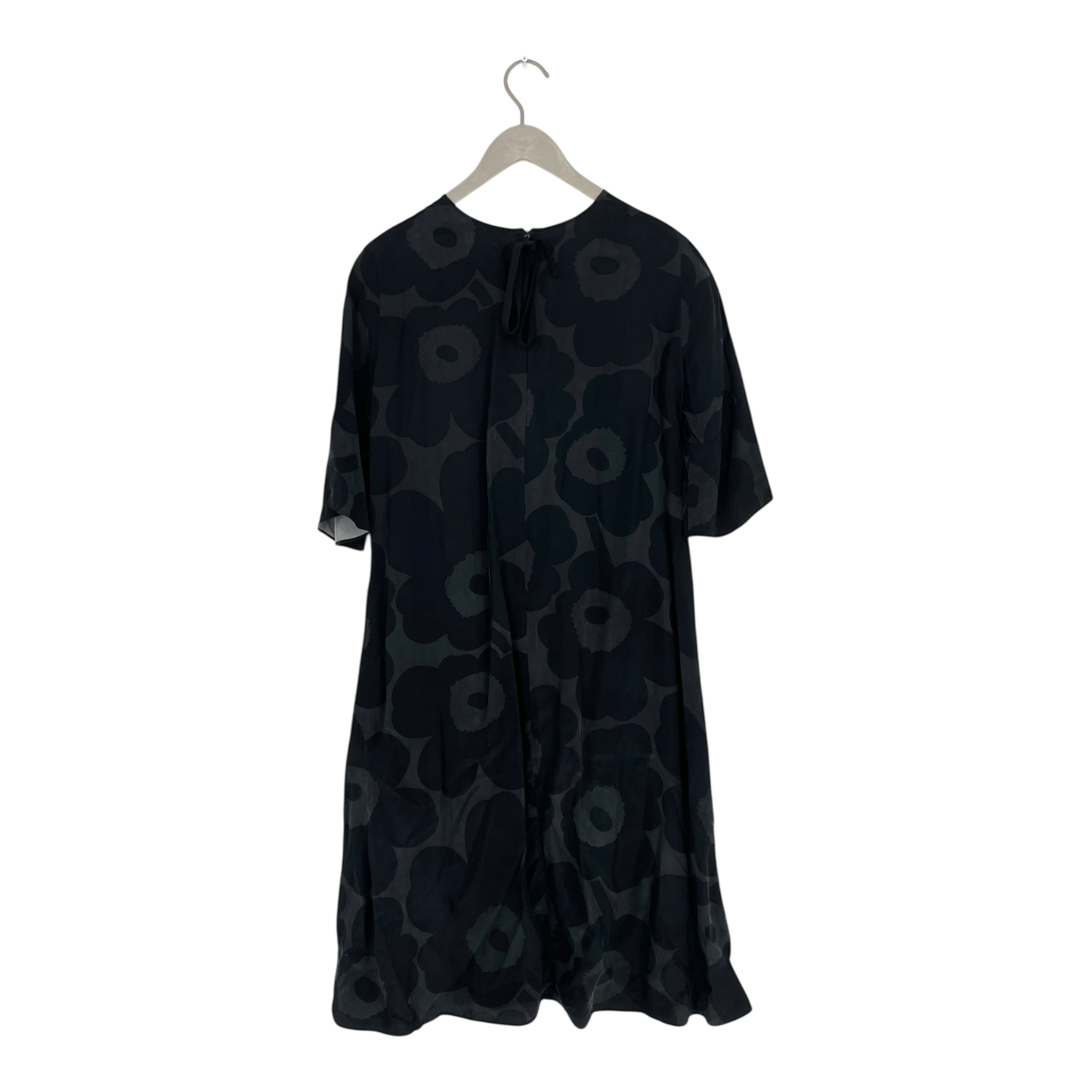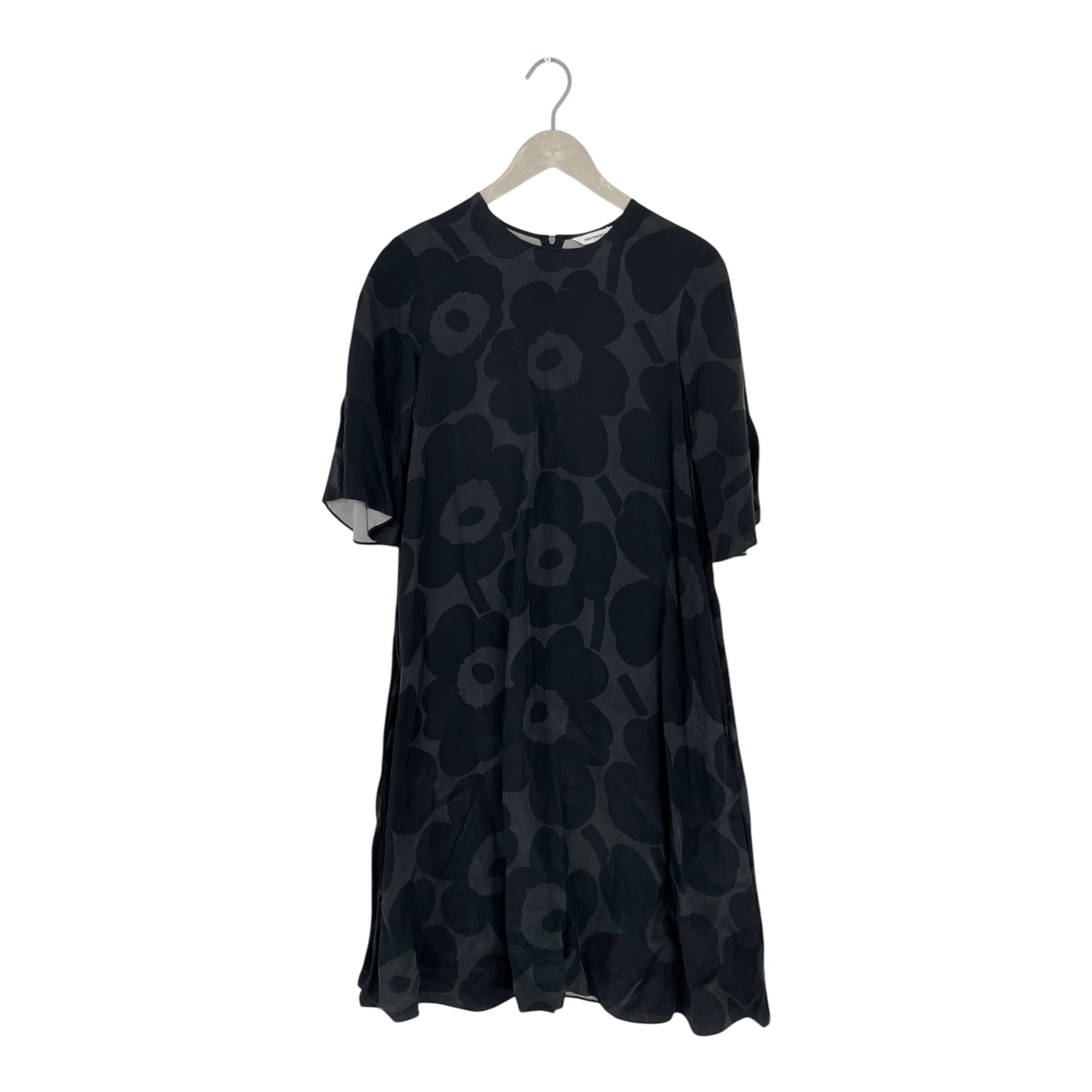 The Marimekko Logn dress has bell-shape half sleeves, sideseam pockets, round neckline and a long ribbon pull on the hidden zipper. The cupro mix fabric has a soft, luxurious feel.