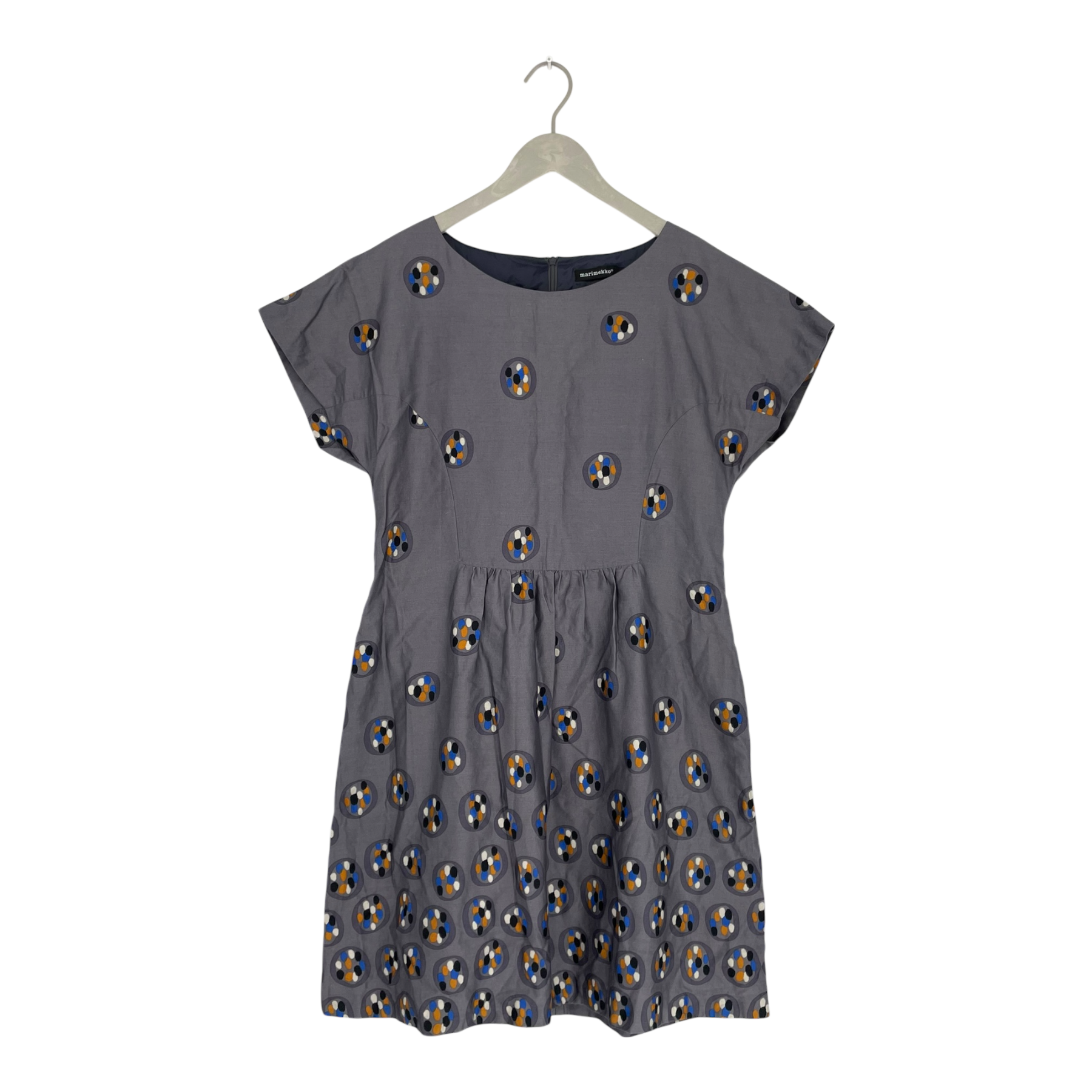 Marimekko woven dress with lining, a zipper on the back and pockets on the sides. Knee length.