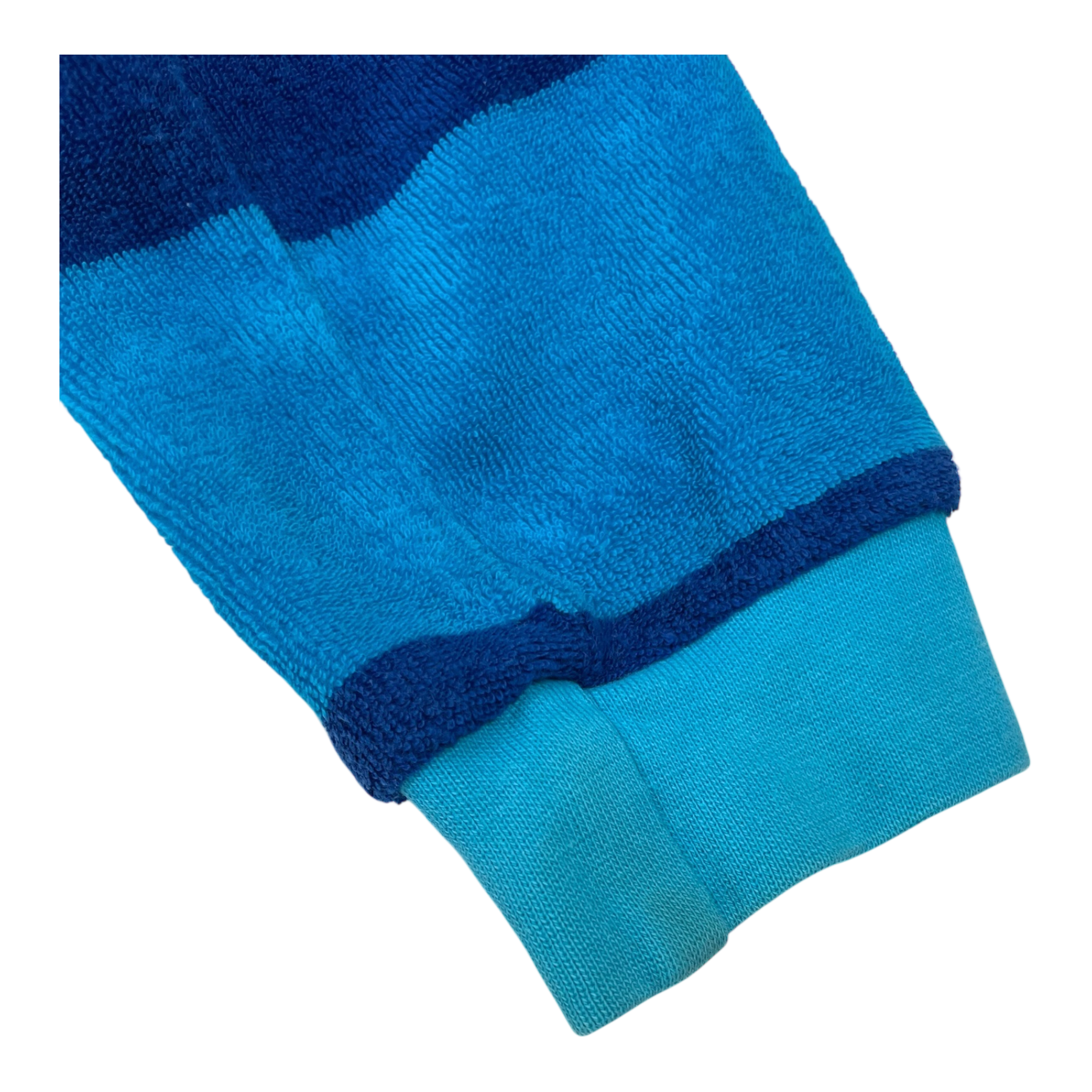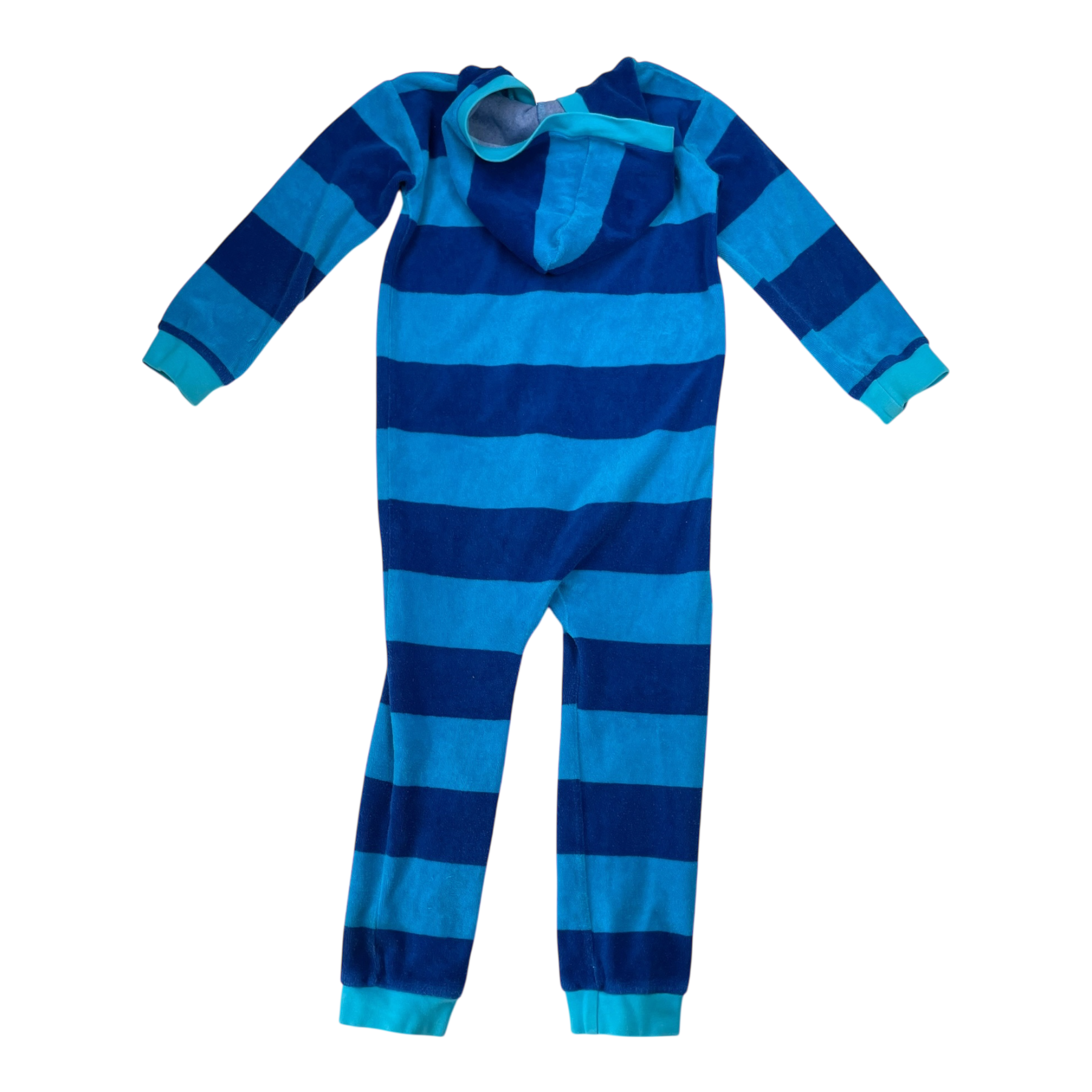 Metsola velour jumpsuit with blue stripes. The jumpsuit has a hood and a zipper.