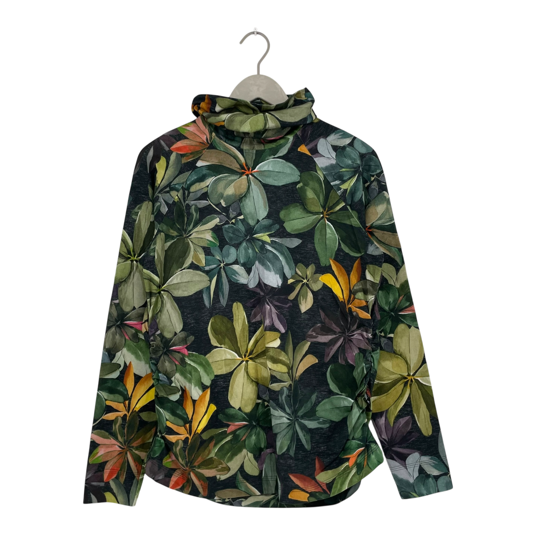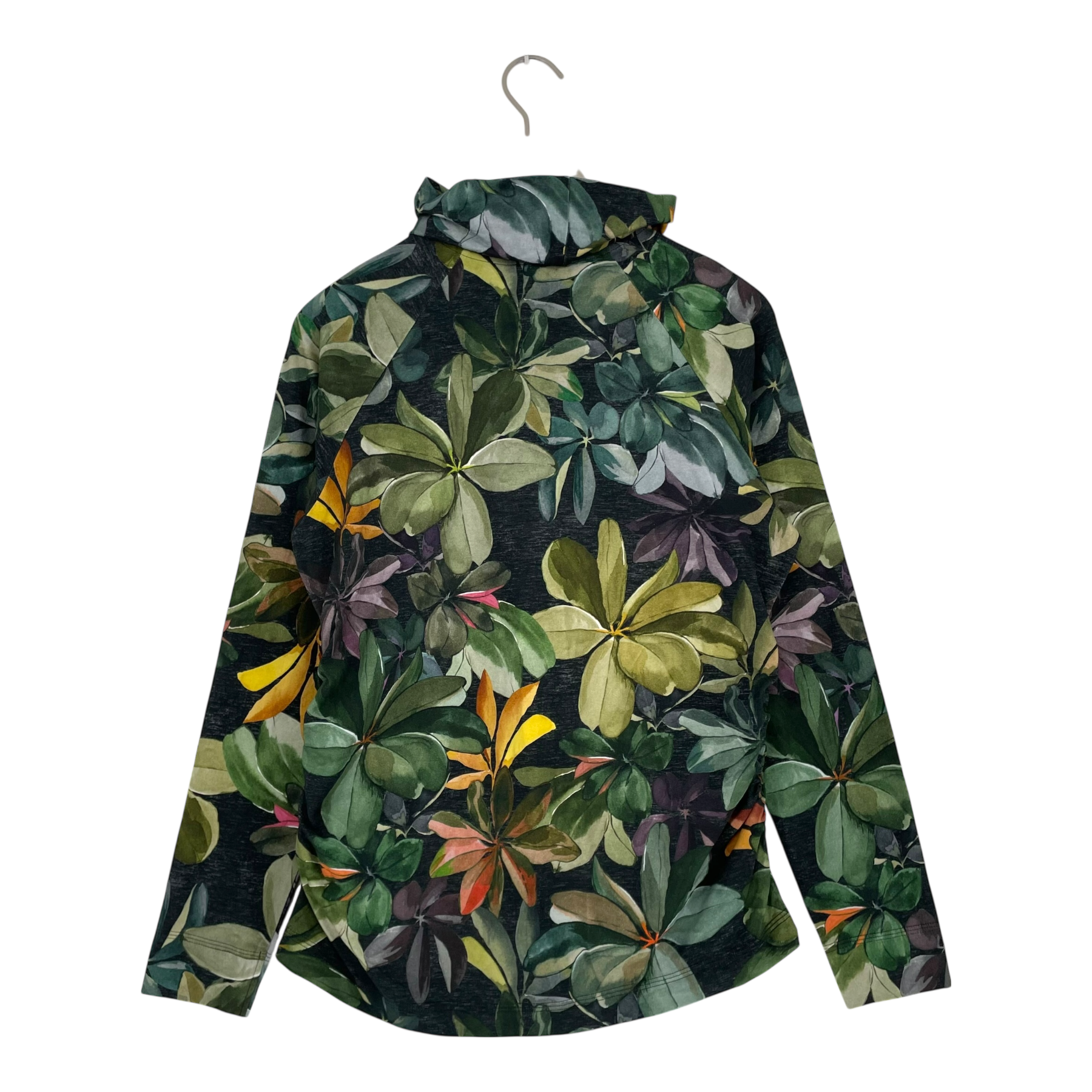 Ommellinen long sleeve "poolopaita" turtleneck shirt with scrunching on the sides in leaf style aralia fruit print.