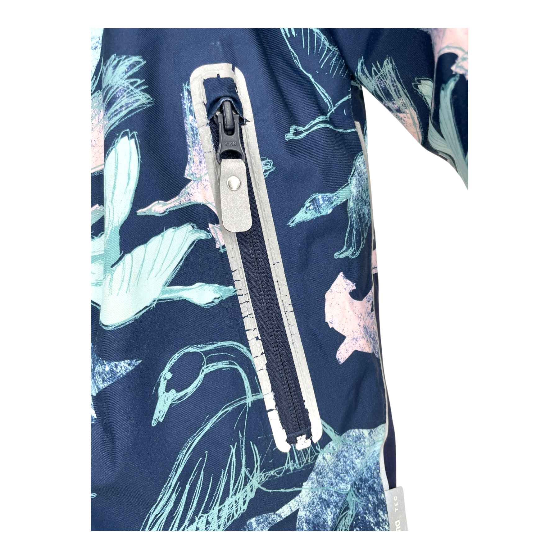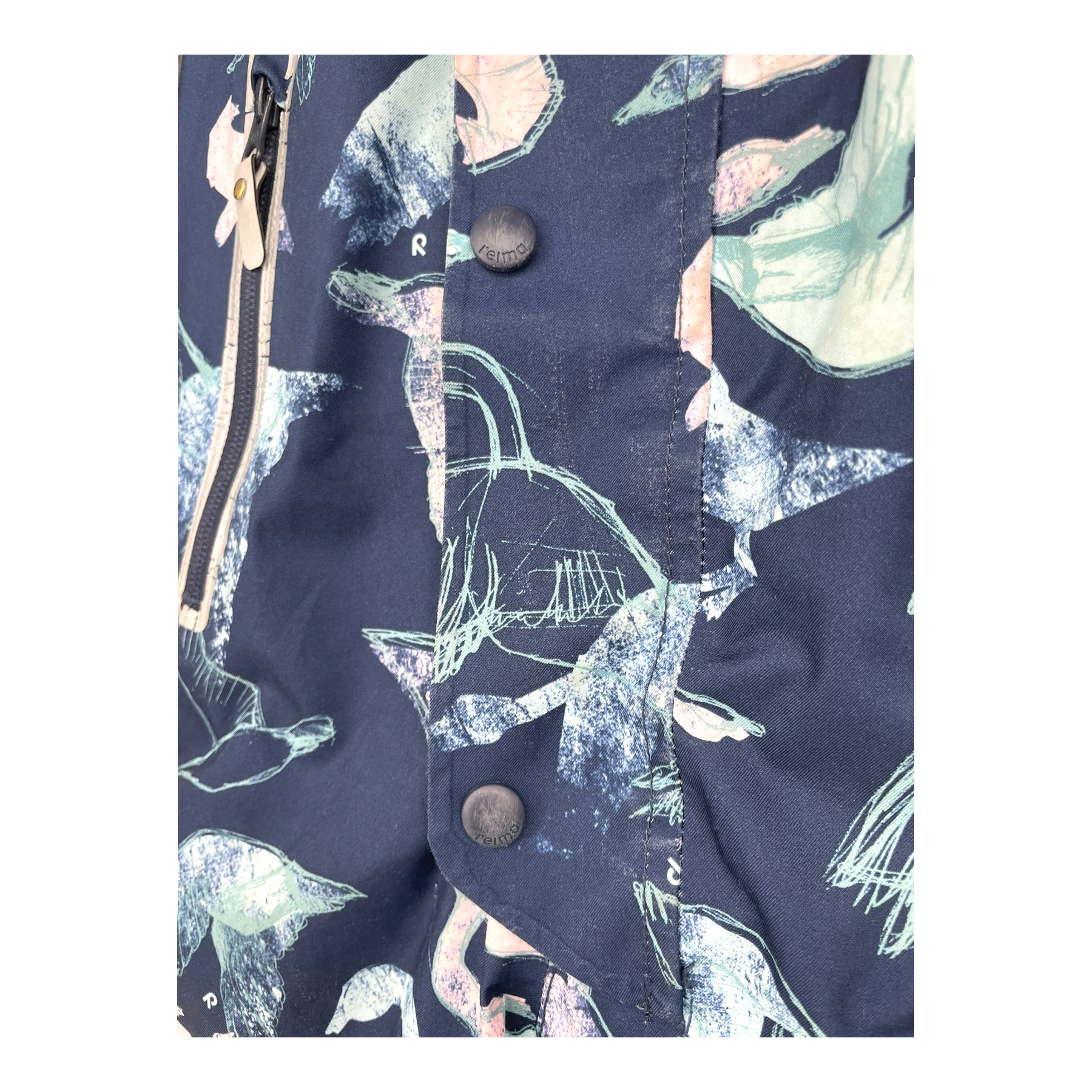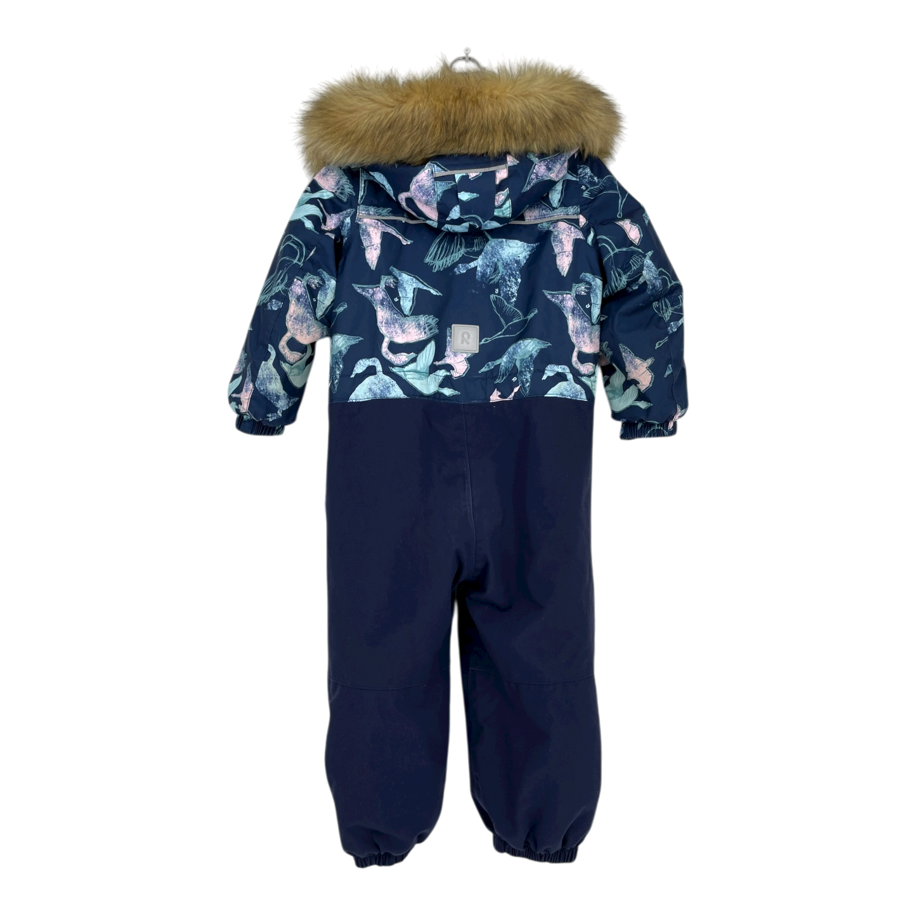 Reima Kipina winter overall with detachable faux fur hood, zip pockets on sides, reflective details, adjustable elastic on the waist, and durable foot loops. The material is originally waterproof up to 10,000mm water column, and the seams are sealed.