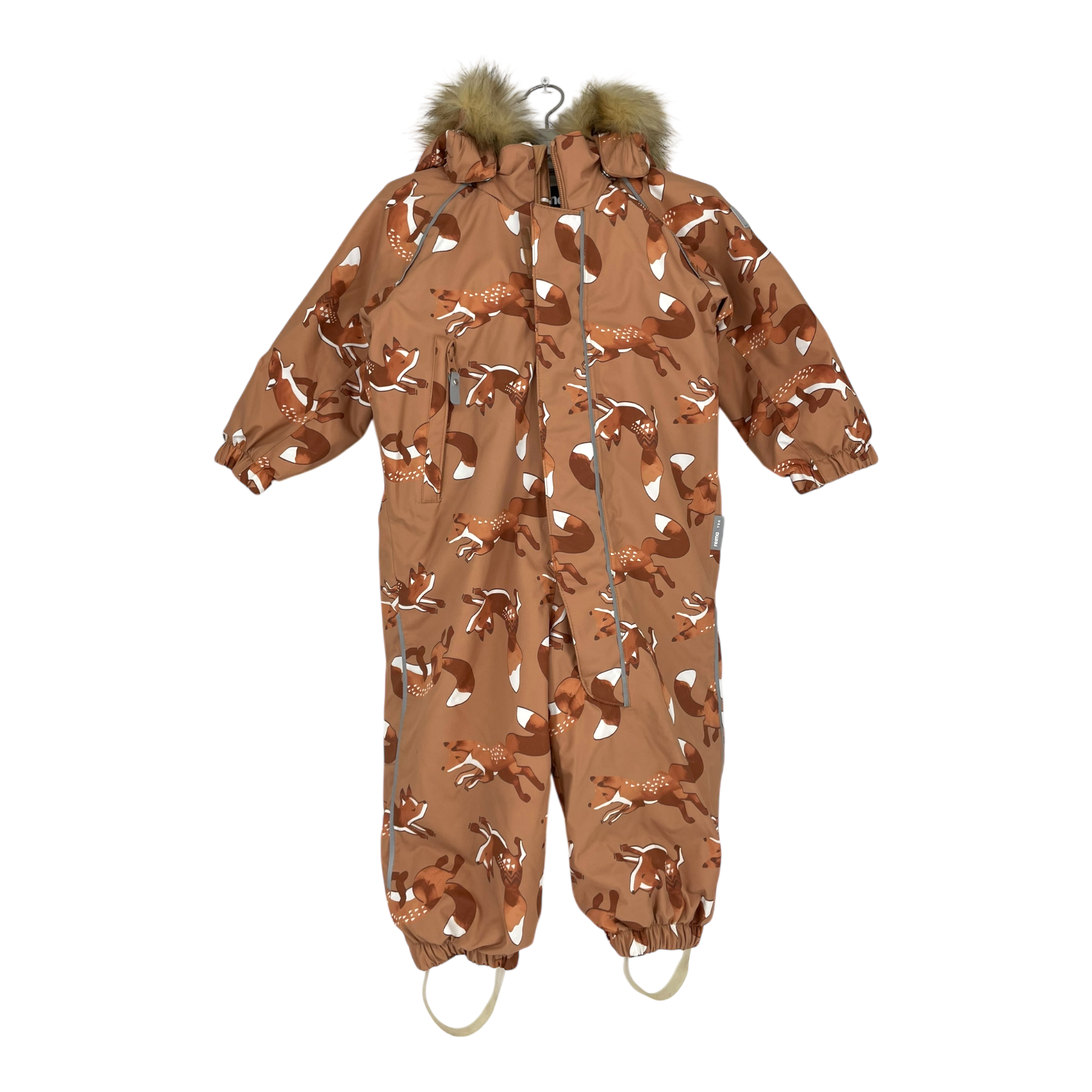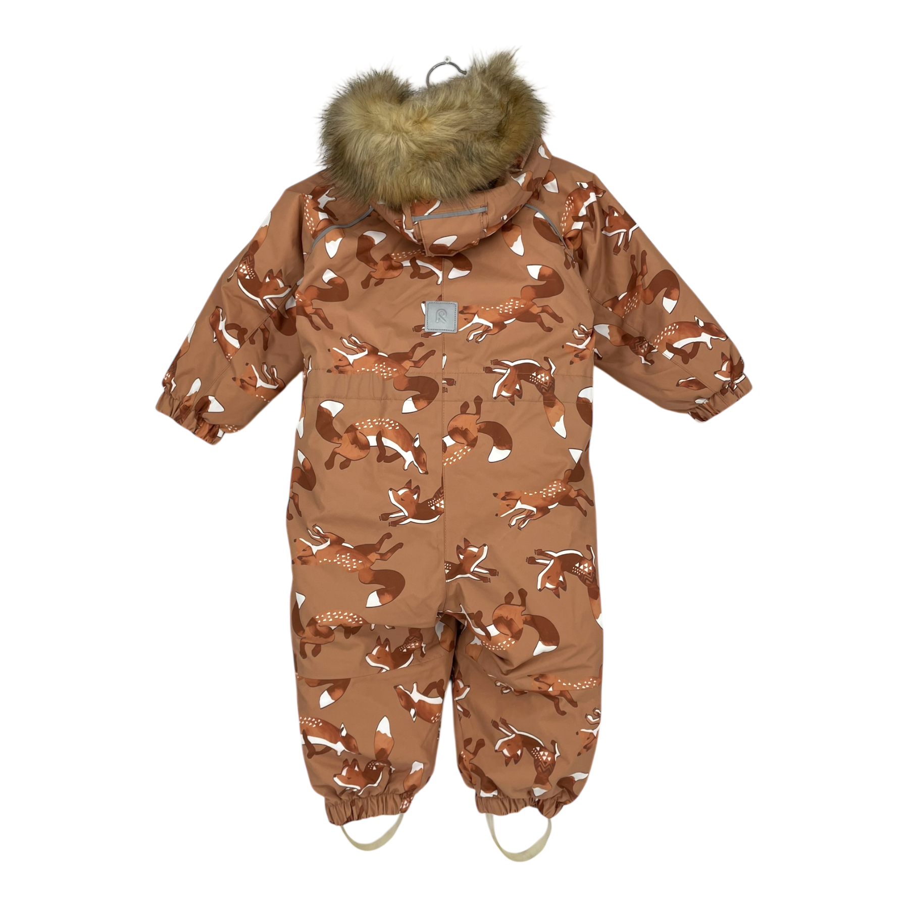 Reima Lappi overall with detachable and adjustable hood, one front pocket, and durable silicone foot loops keep the leg ends in place, protecting ankles from moisture and the cold. The seat is insulated to keep bottoms warm and dry during cold-weather adventures.
