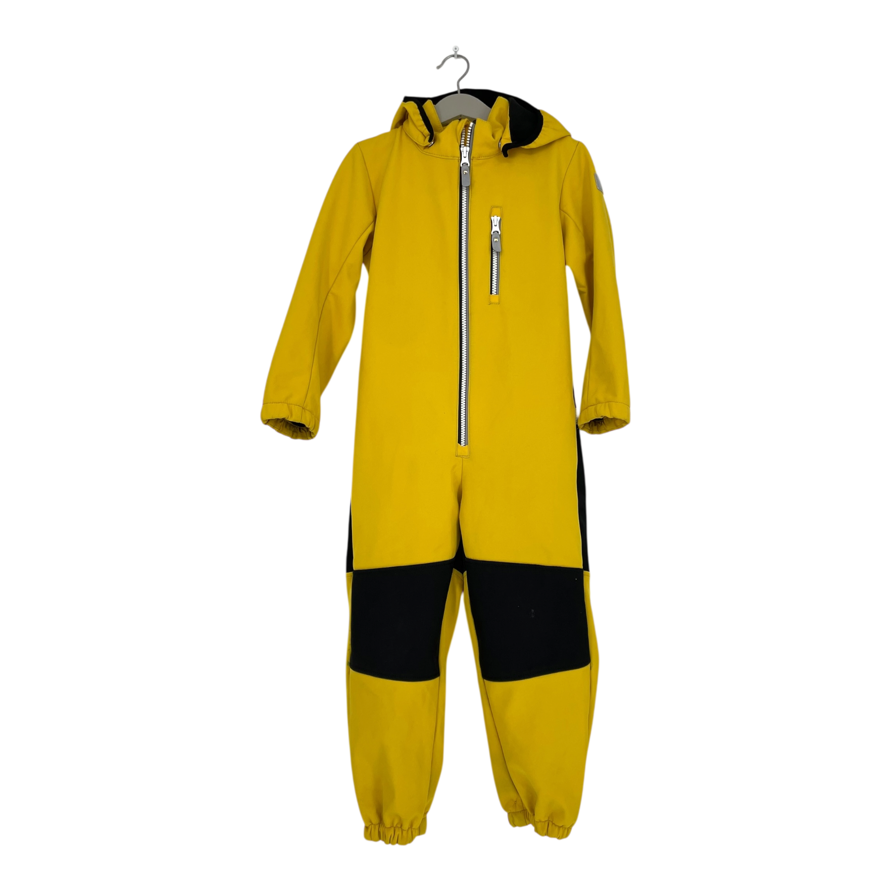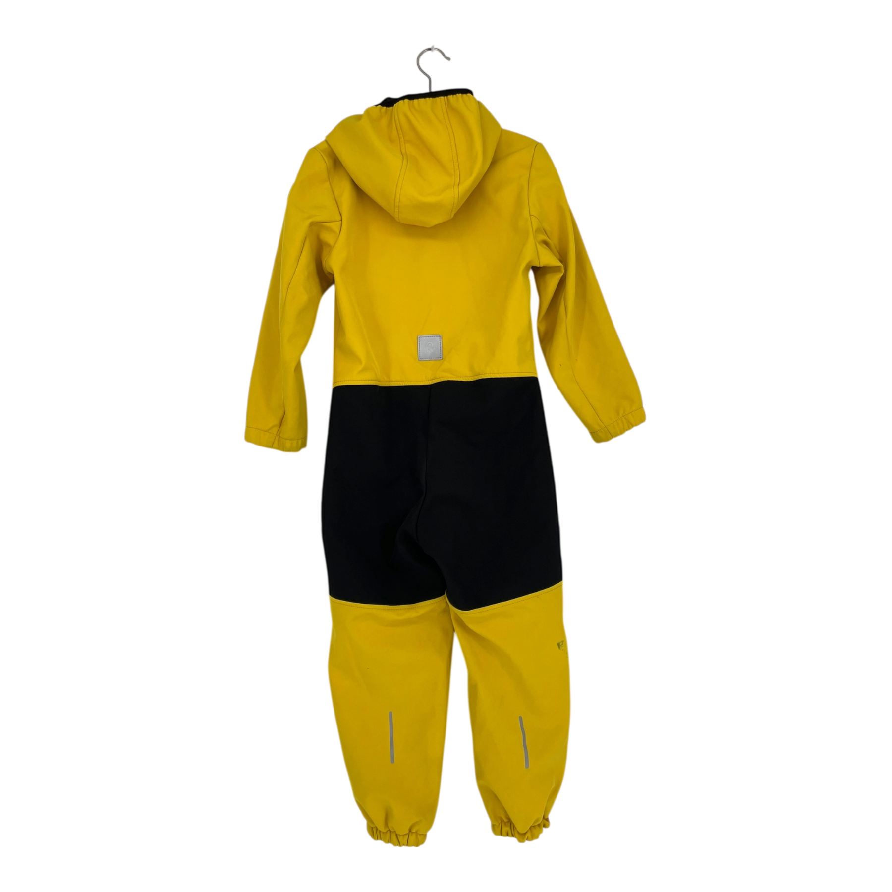 Reima Nurmes softshell midseason overall with durable reinforcements and fleece on reverse. Originally the surface has been treated with water-repellent finish. Elastic cuffs at wrists and leg ends together with the durable, detachable silicone foot loops (in this item the foot loops are missing), detachable hood, a zipper pocket and zipper fastening in the front.