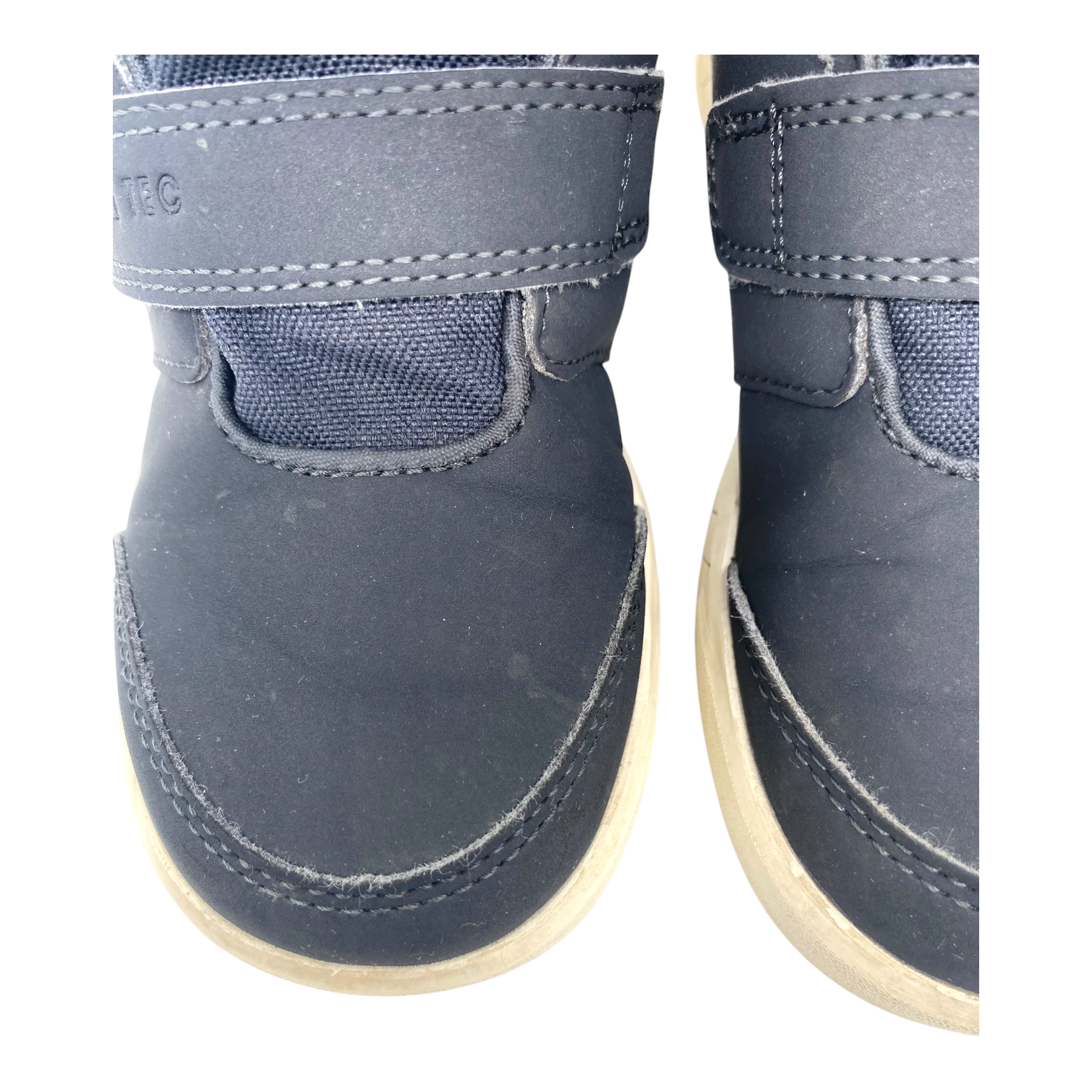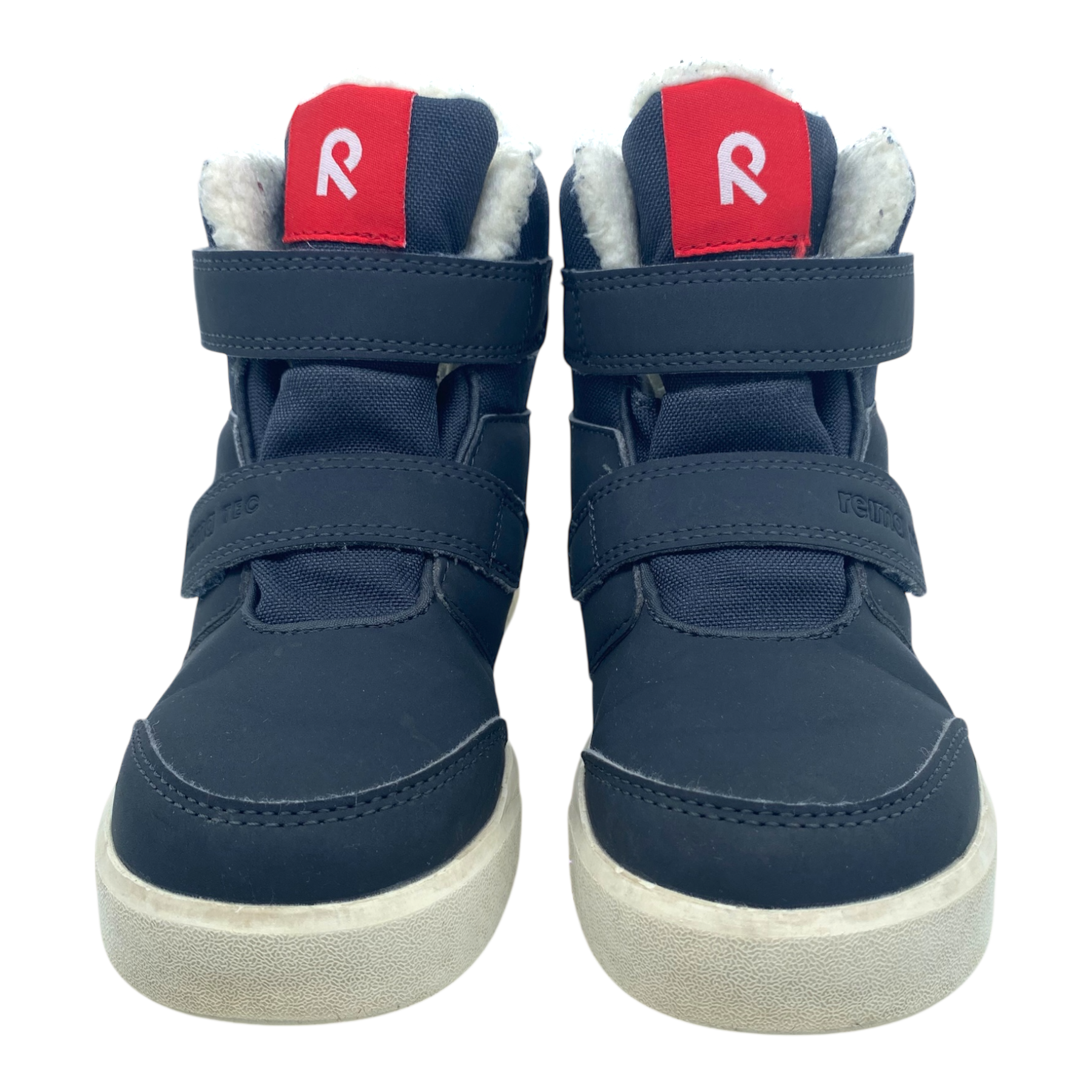 Reima Pyrytys shoes are originally waterproof. Tested for comfort in temperatures down to -20 °C, they’re a wardrobe essential for cold winters. The flexible rubber outsoles gives a proper grip on surfaces. Textile fur lining keeps little feet warm while two hook-and-loop straps ensure a snug and comfy fit. Seam-sealed inserts offer extra protection by preventing rain and slush from seeping in. The boots are 100% vegan and PFAS free and come with removable felt insoles. Reflective details deliver visibility.