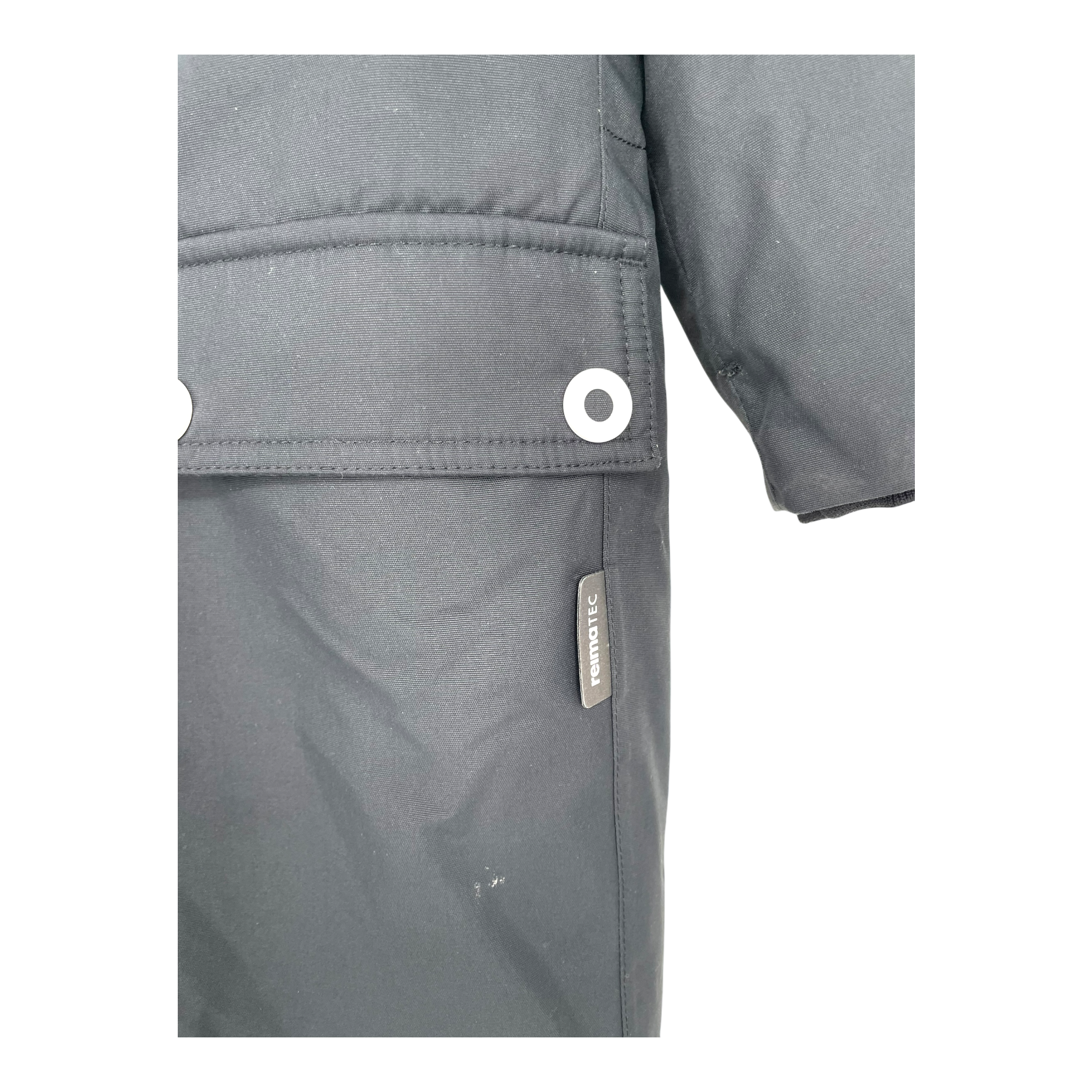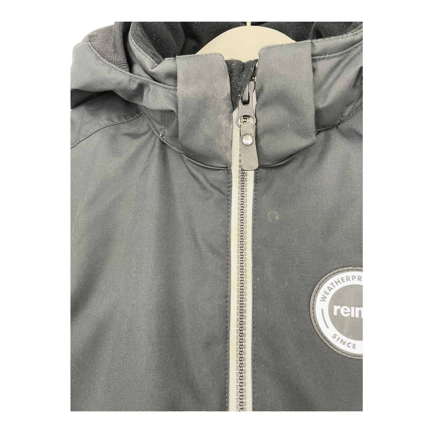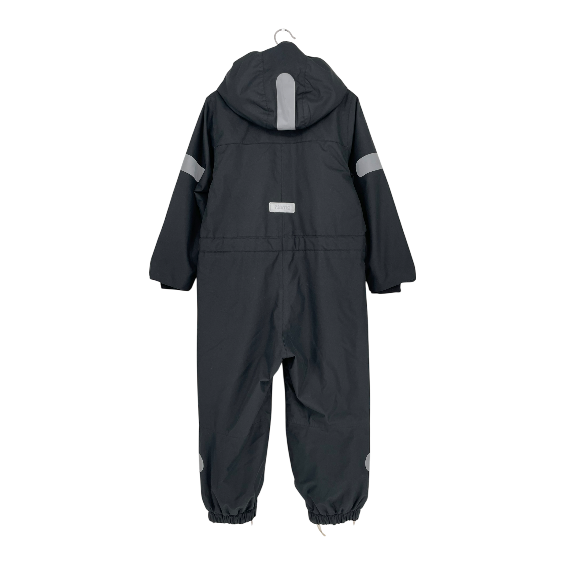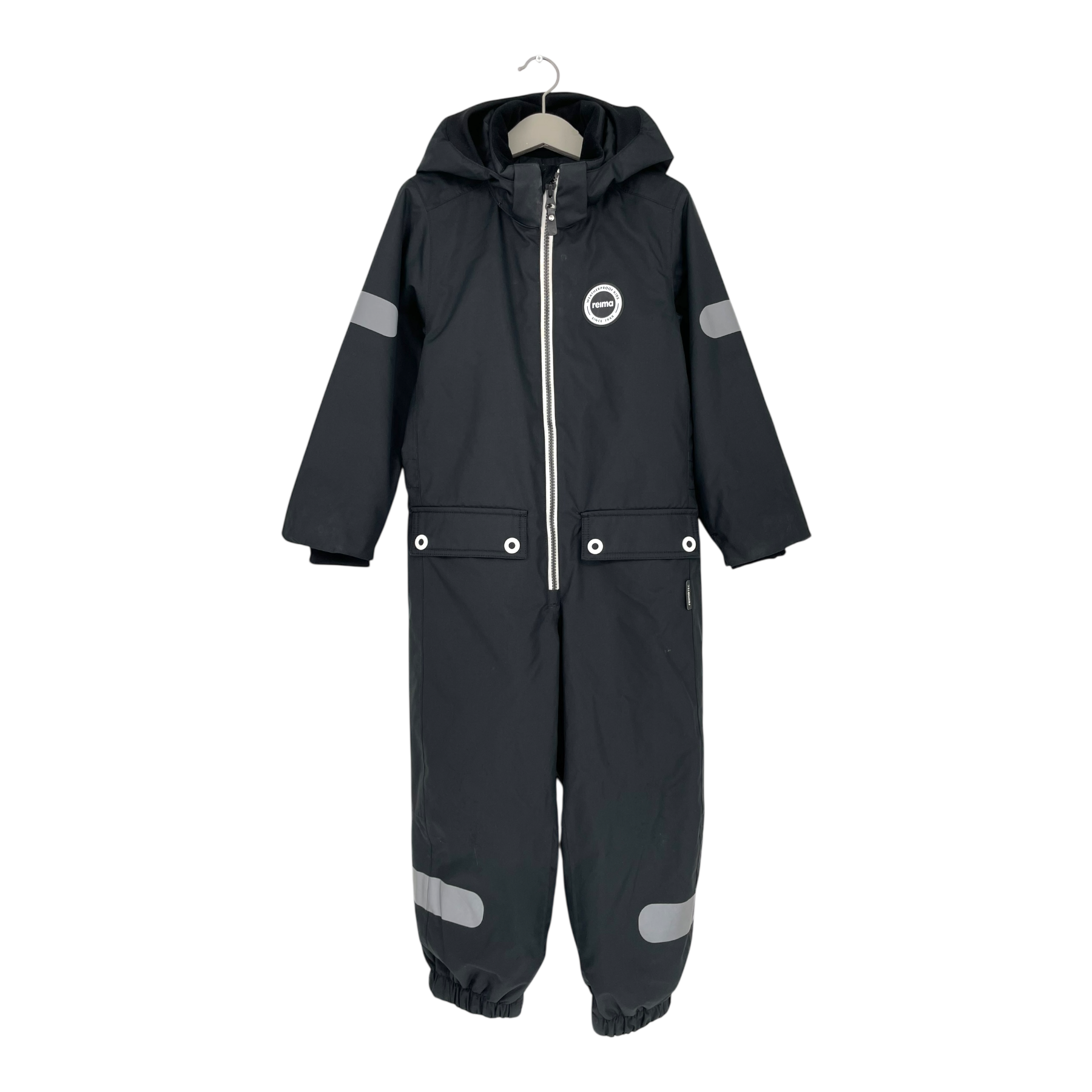 Reima Sevetti midseason overall draws inspiration from Reima's '70s-style collections. Overall has a detachable hood, adjustable elastic on the waist, silicone foot loops, and two flap pockets on the front. The material is originally waterproof up to 8,000mm water column, all seams are sealed, and the material is dirt- and water-repellent.
