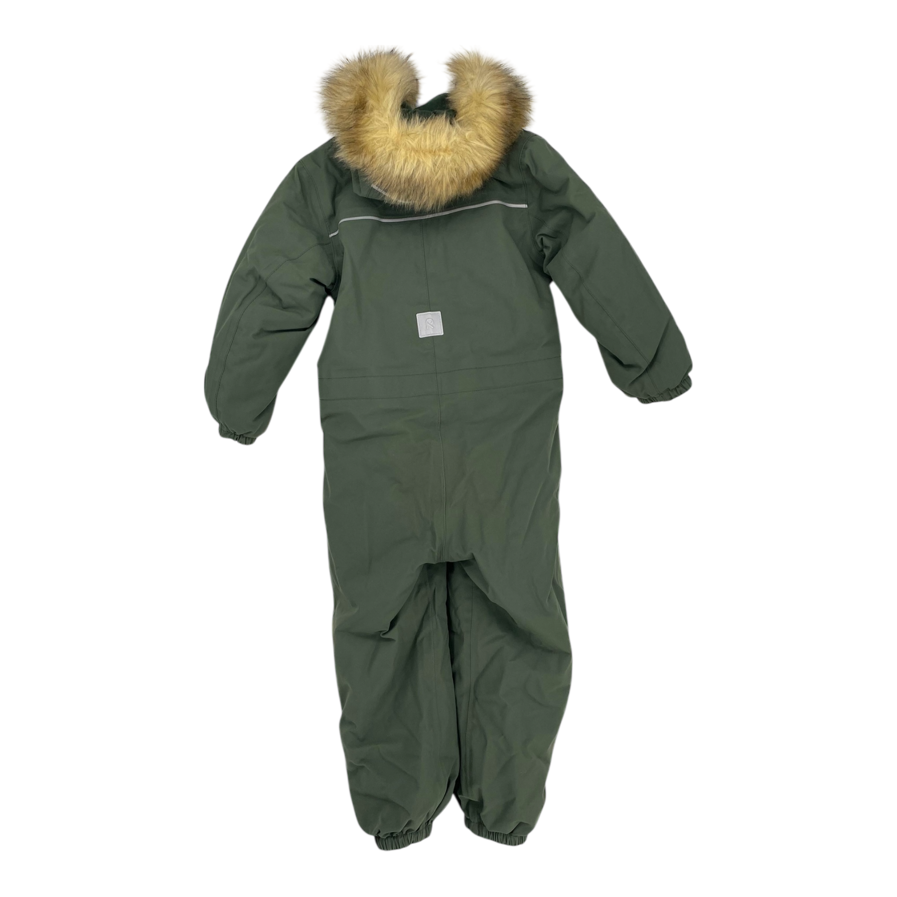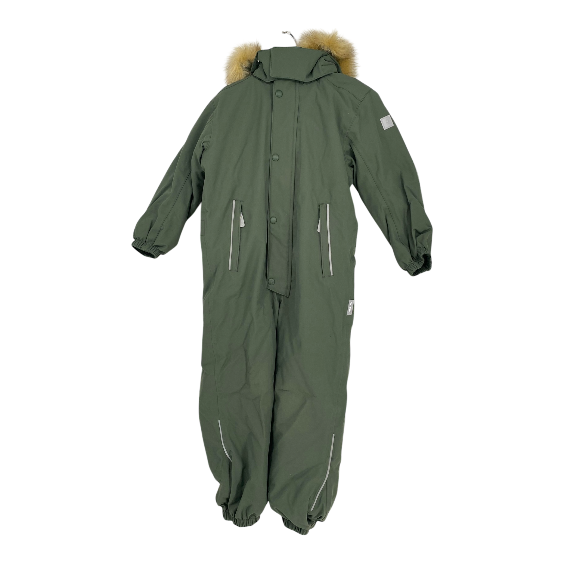 Reima Stavanger winter overall with zip closure, detachable faux fur hood, two zip pockets, reflective details, durable foot loops, and adjustable elastic on the waist. The fabric is strong, waterproof yet breathable material. The material is originally waterproof up to 10,000mm water column, and all the seams are sealed.