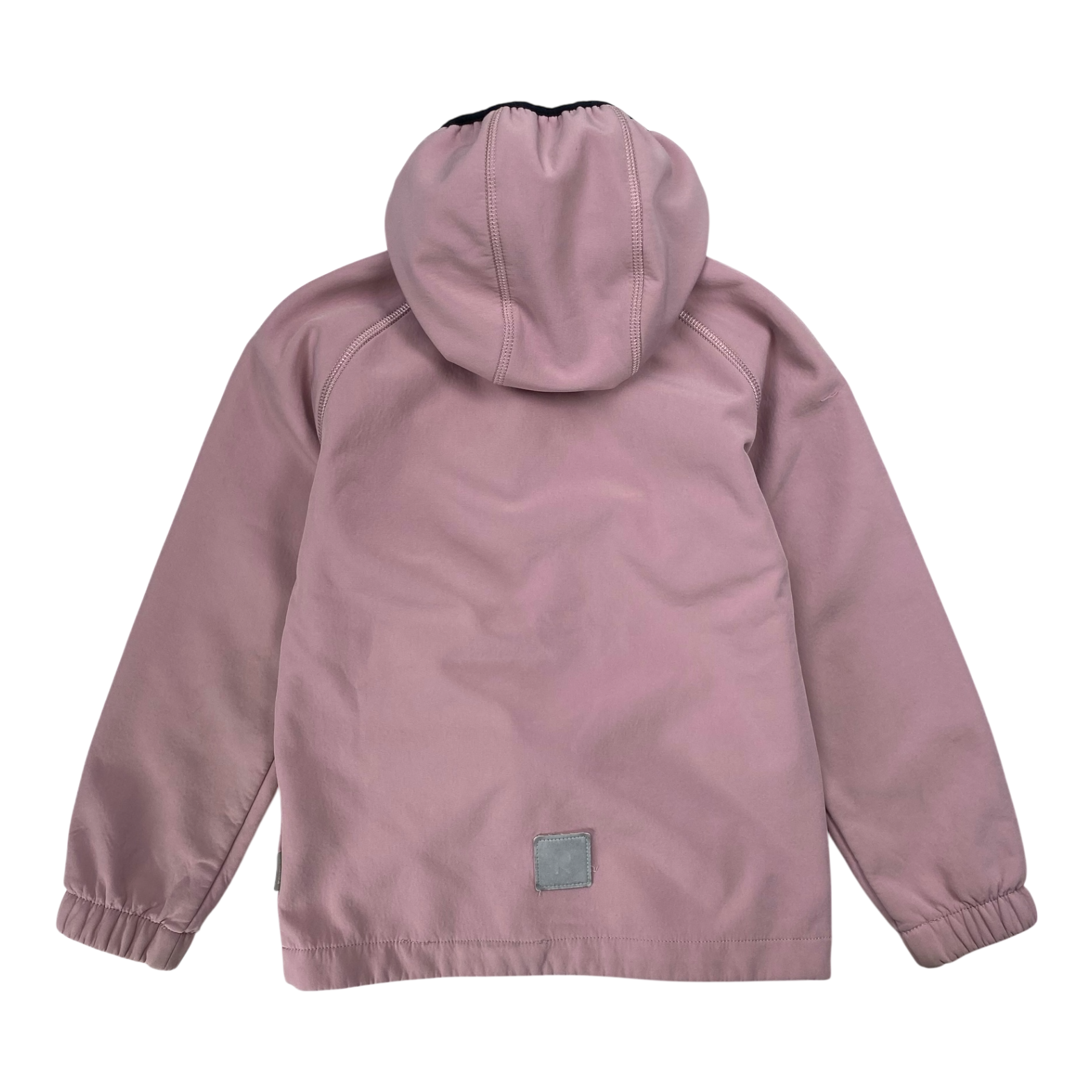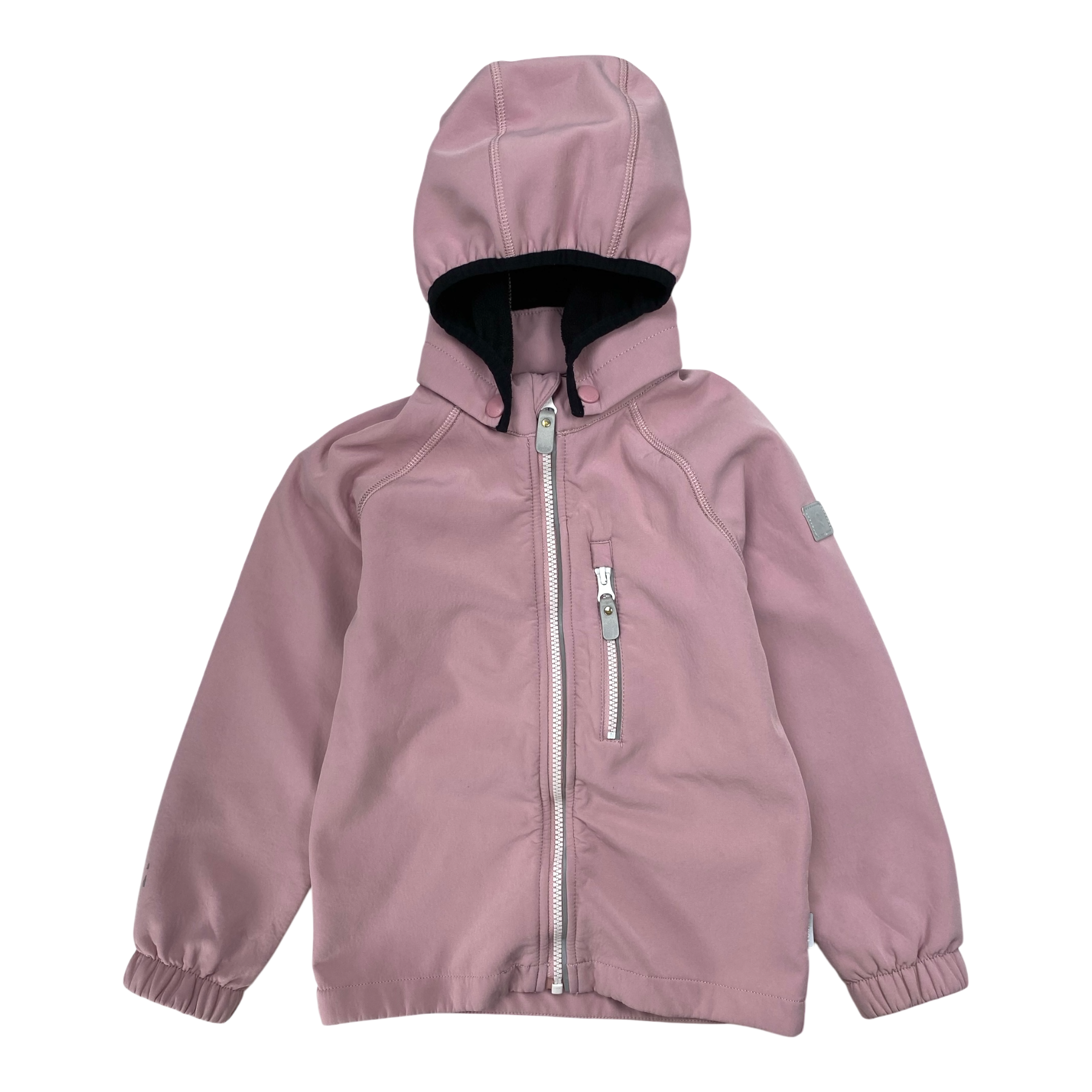 Reima Vantti softshell midseason jacket with detachable hood, zip pocket, and zip closure. The material is originally water- and windproof. The soft fleece on the reverse not only feels nice against the skin but warms too.