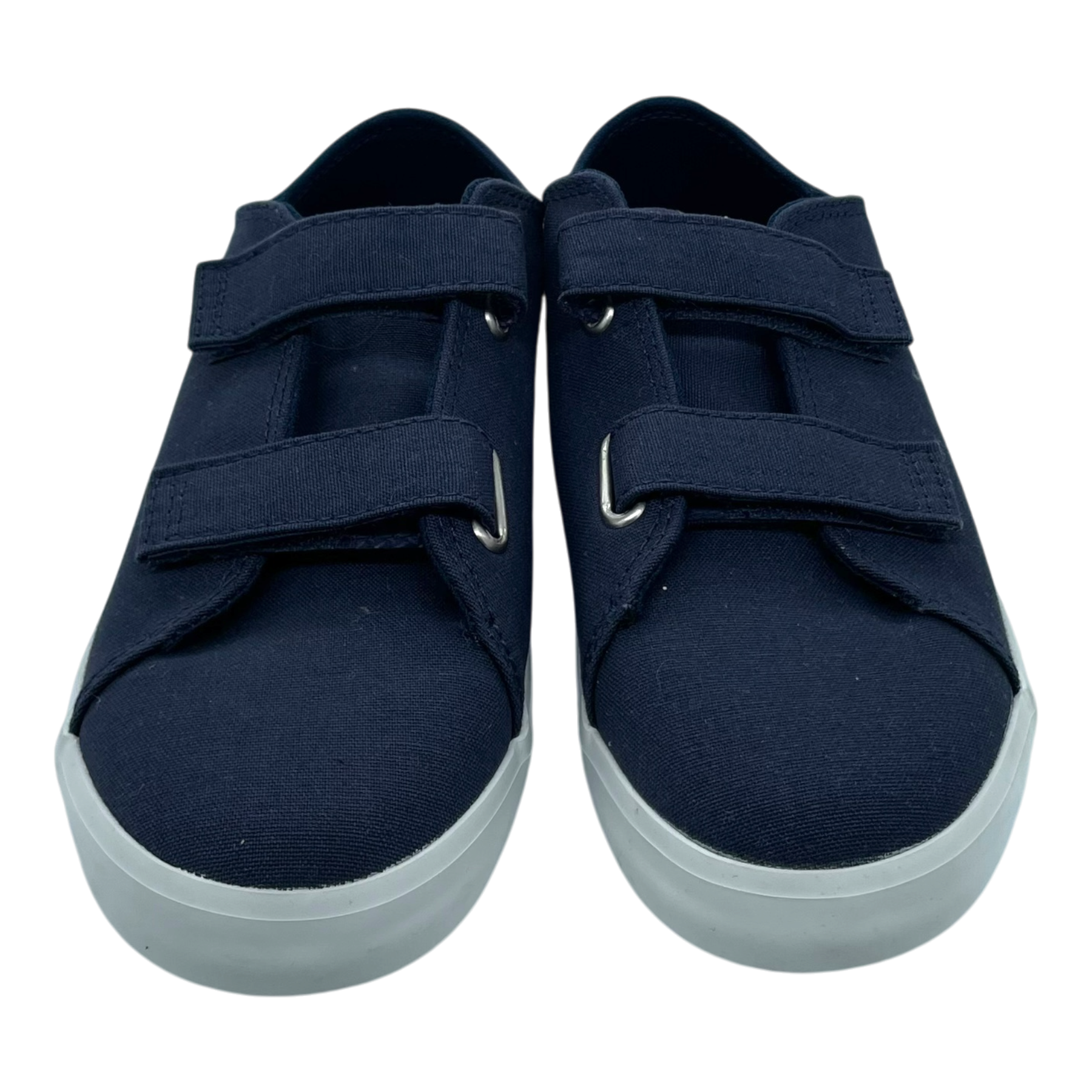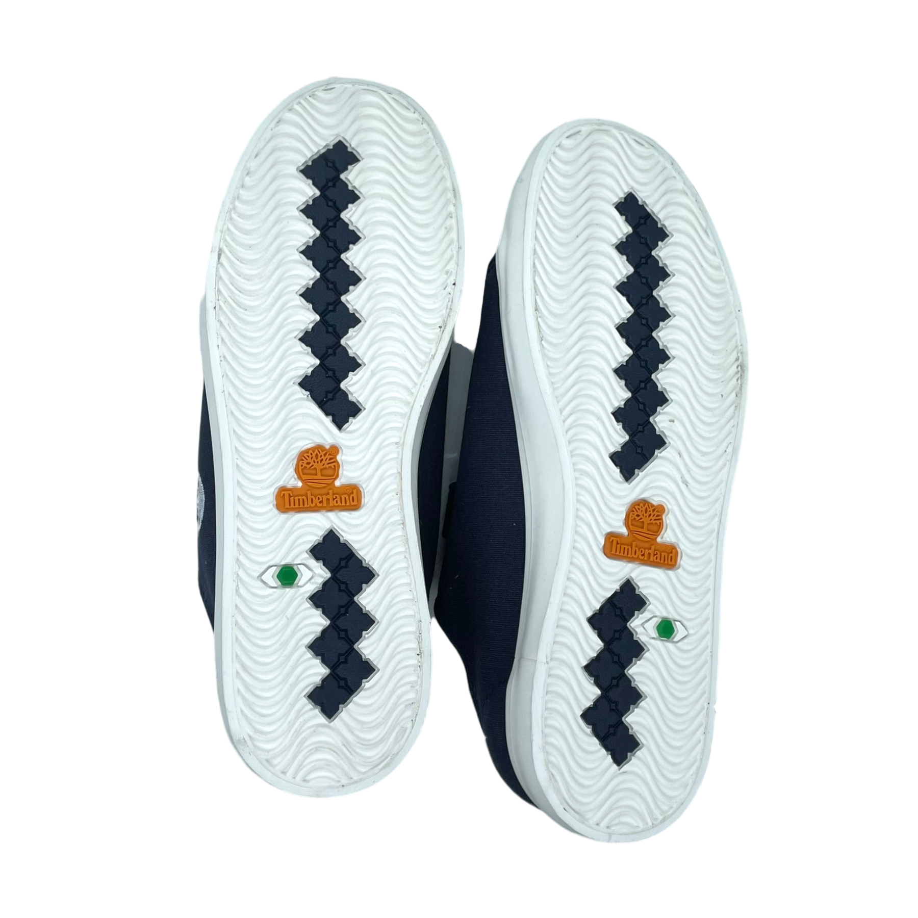 Timberland canvas sneakers in navy blue with white rubber sole. Features velcro strap closure and iconic tree logo on the side. Low-top design with canvas upper.
