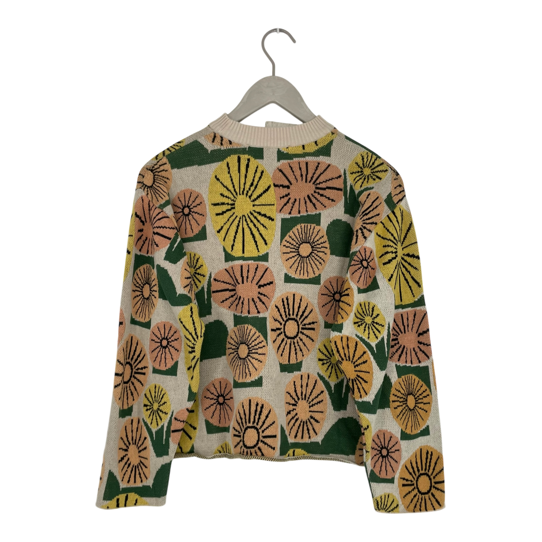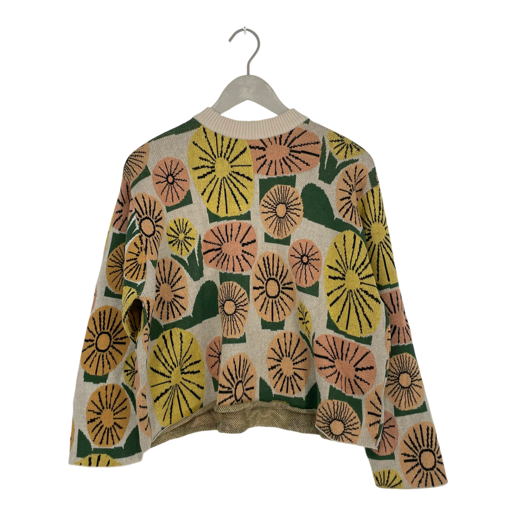 Dedicated cropped knit shirt in a dandelion design. The item has an unfinished rolled hem, round neckline and a slightly oversize fit. There is one loose thread on the item, as shown in the last picture.