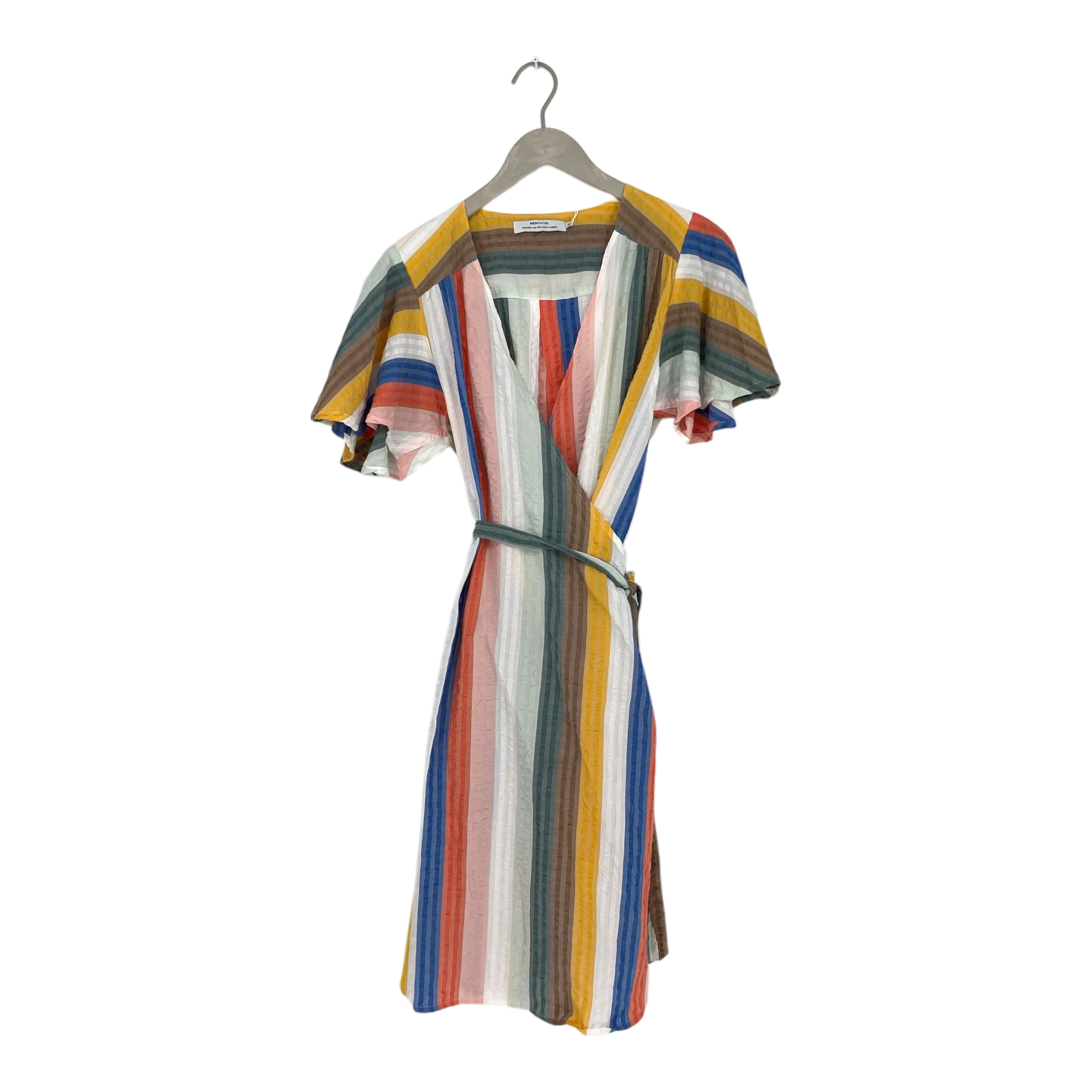 Dedicated woven dress with a v-neck and stripes print. Comes with a removable belt and can be worn with or without it. This item is a sample.