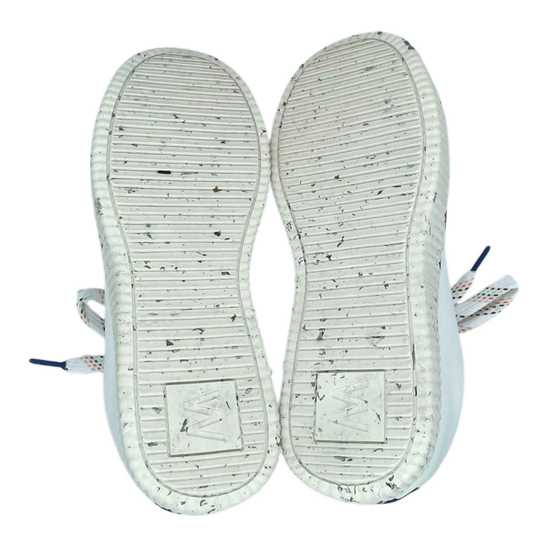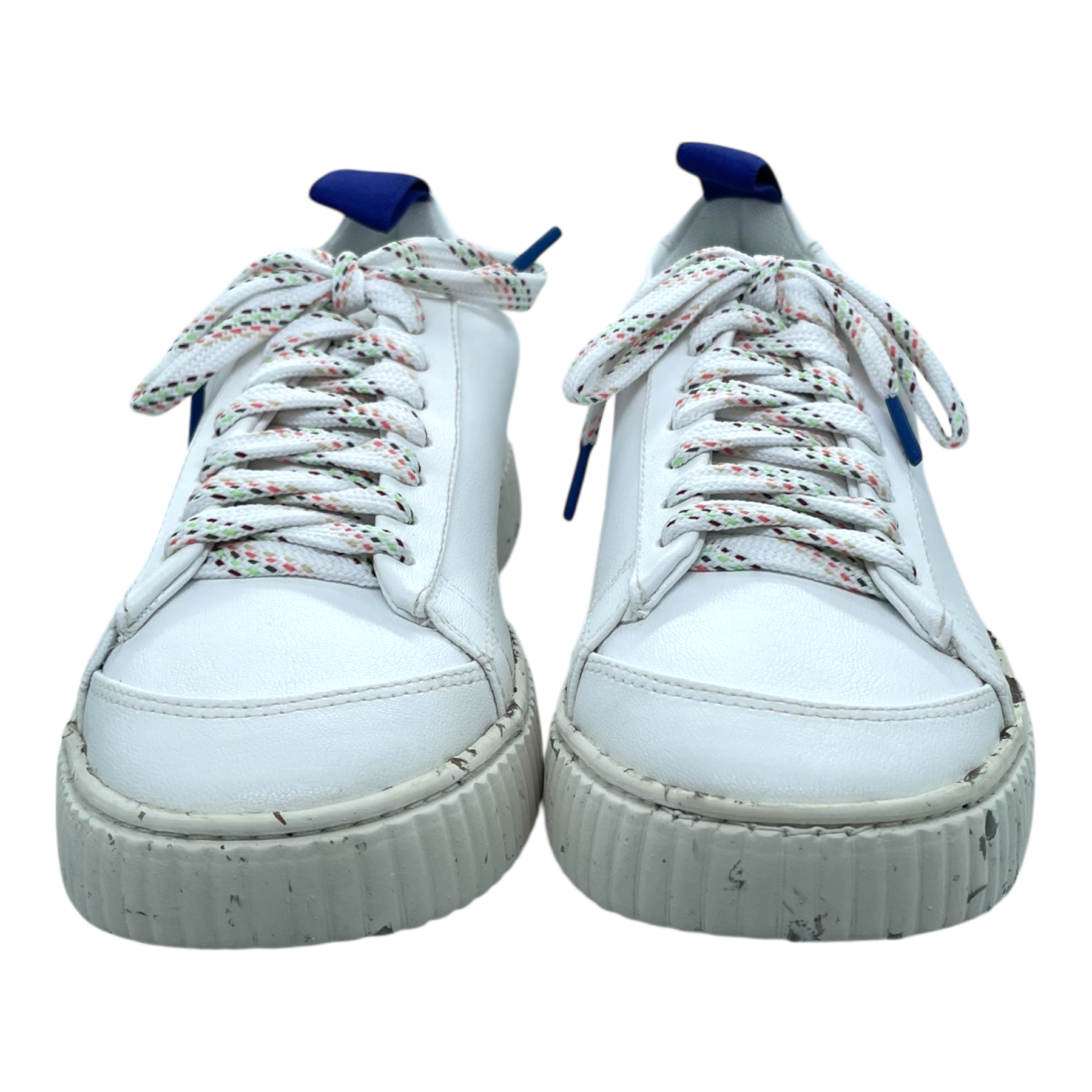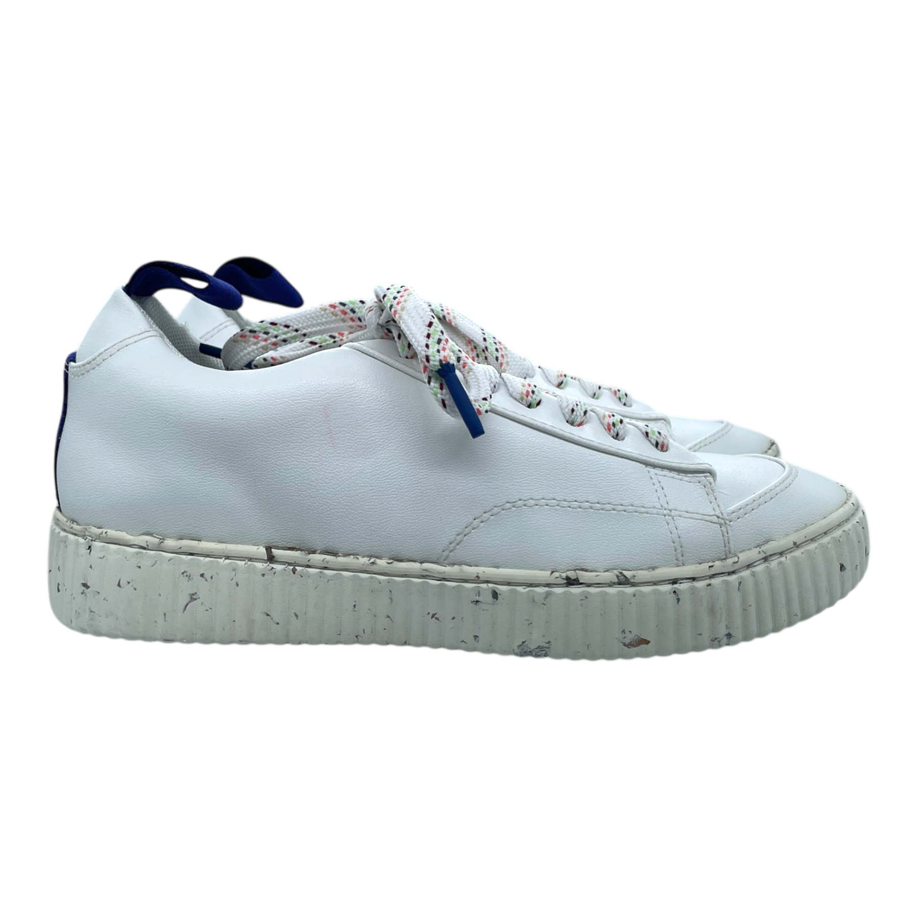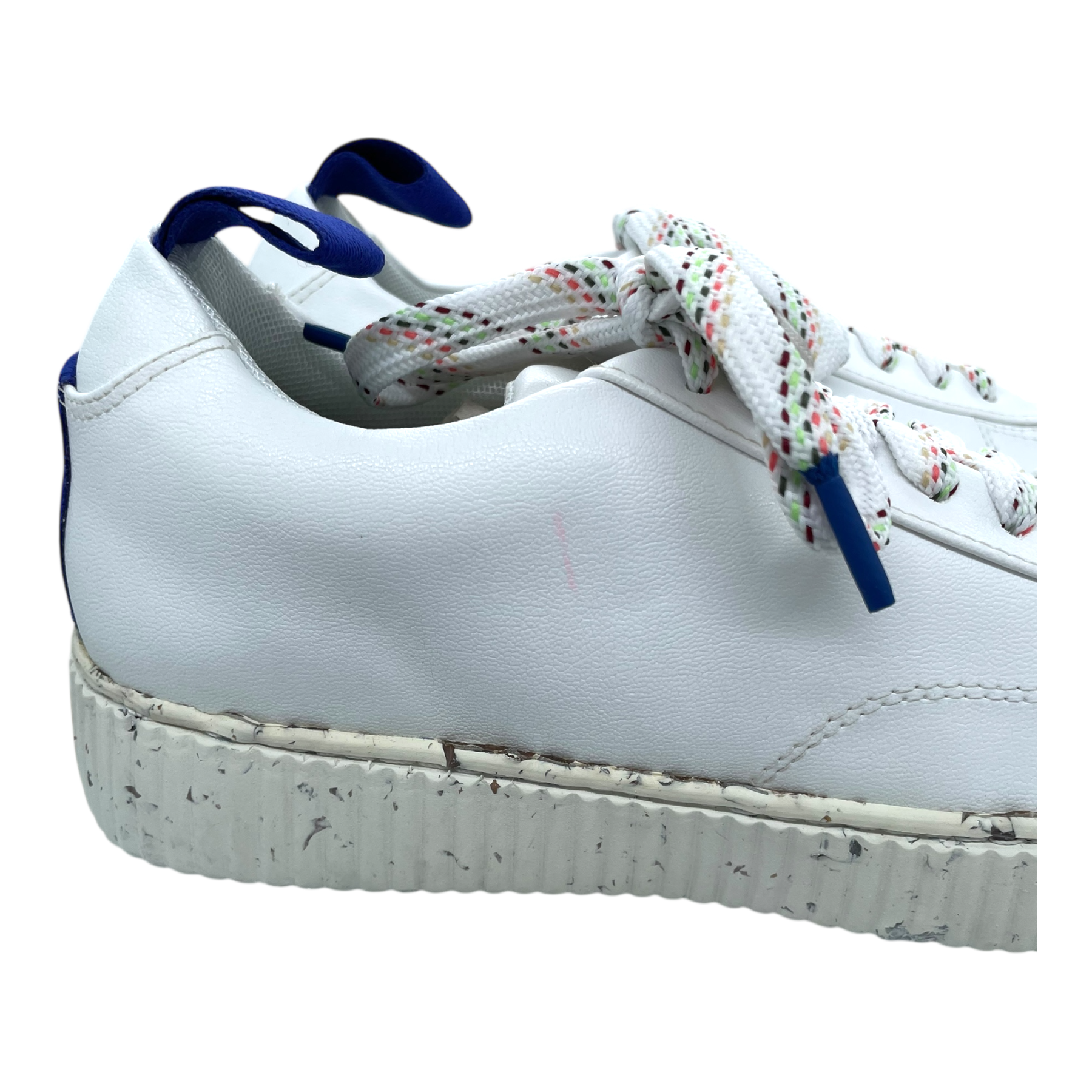 Embassy of Bricks and Logs Bedford sneakers in white vegan leather, a grainy sole and colourful laces, vegan and eco-friendly. Note there is a small pink mark on the right shoe as shown.