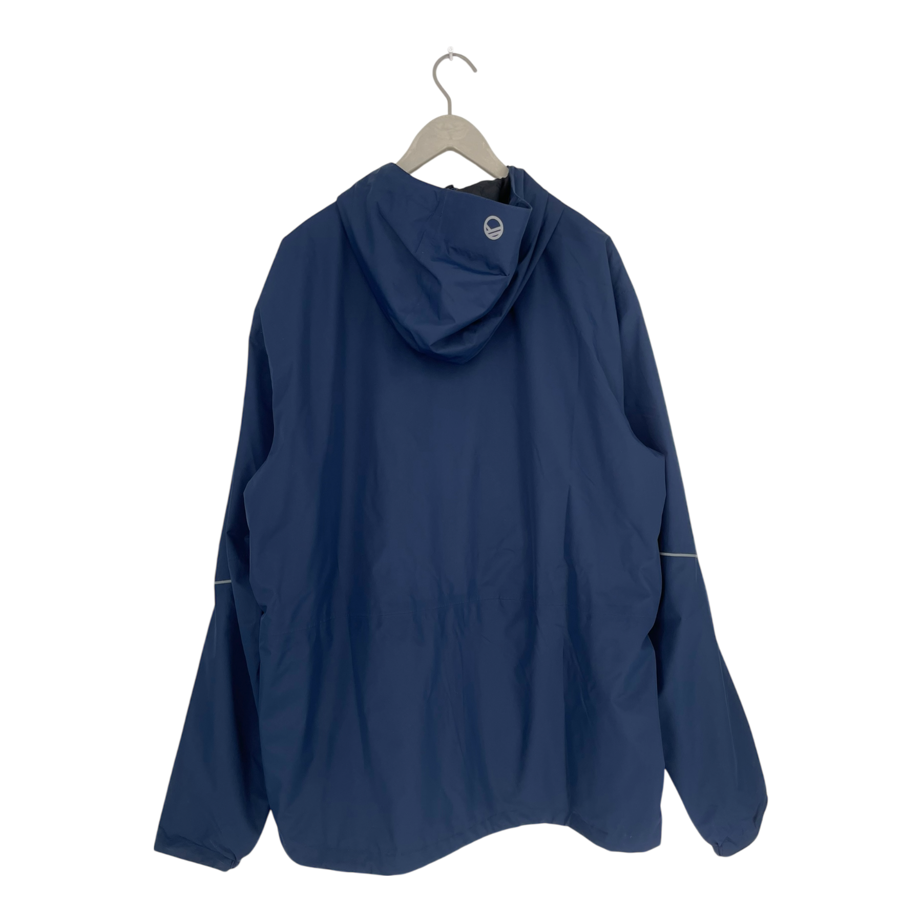 Halti blue shell jacket. The jacket features a waterproof and windproof DrymaxX membrane. It has a full-length zipper closure, an adjustable hood, and two zippered front pockets. The hem is adjustable.