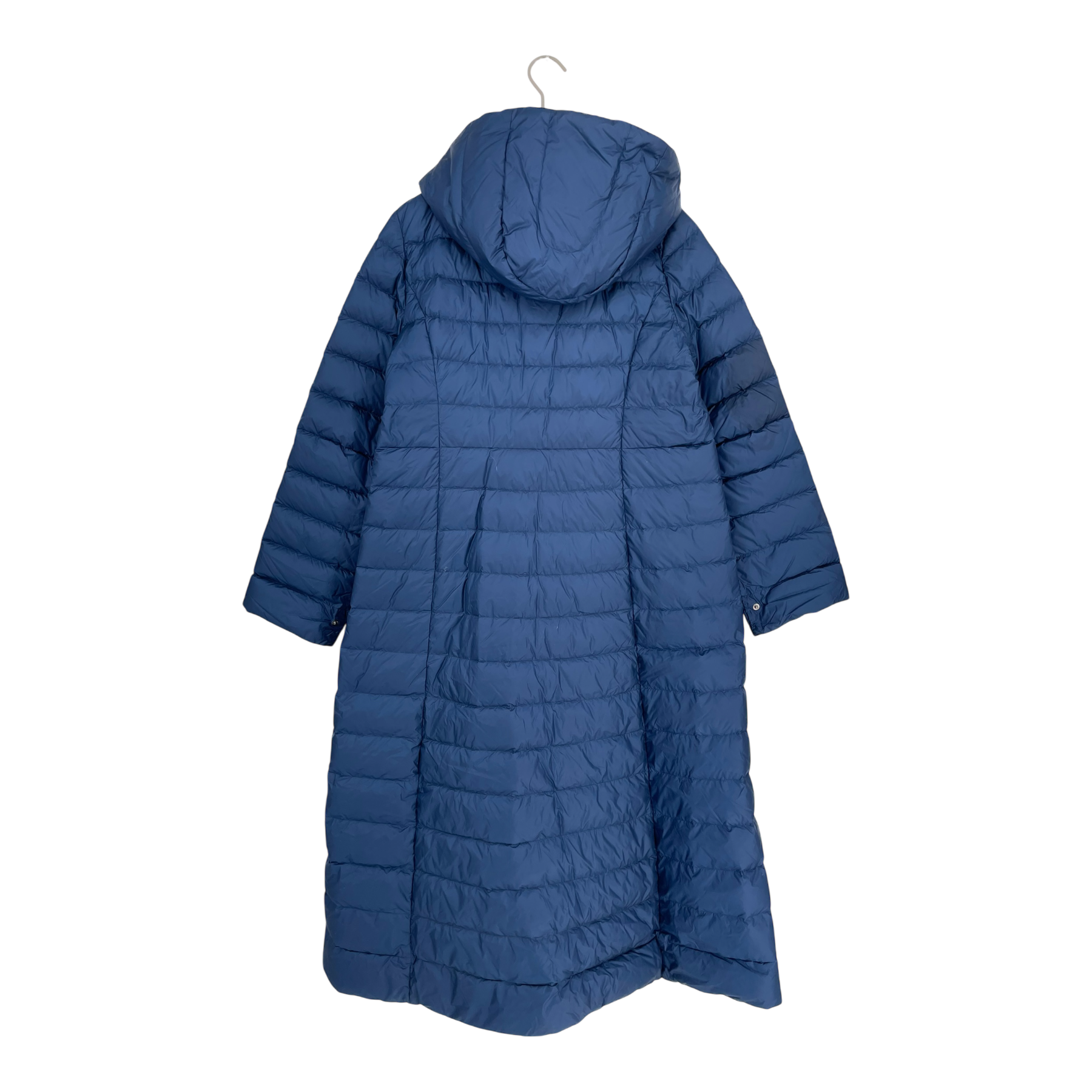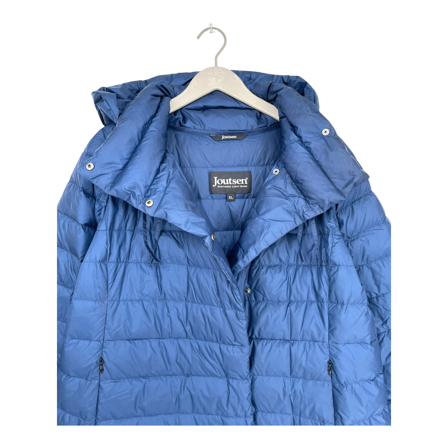 Joutsen Kaarna jacket is a light down jacket with horizontal stitching. The jacket is slim form the upper body and it widens from the waist towards the hem. The hemline can be tightened with an adjustable drawstring for a better fit. The two halves of the coat overlap in the front that which adds to the feeling fo being wrapped in comfortable warmth. There is two sealed side pockets with zippers and a snap button closure in the front. The high collar protects the neck. Tightness of the hood can be adjusted with a drawstring and the hood can be unattached with a zipper.