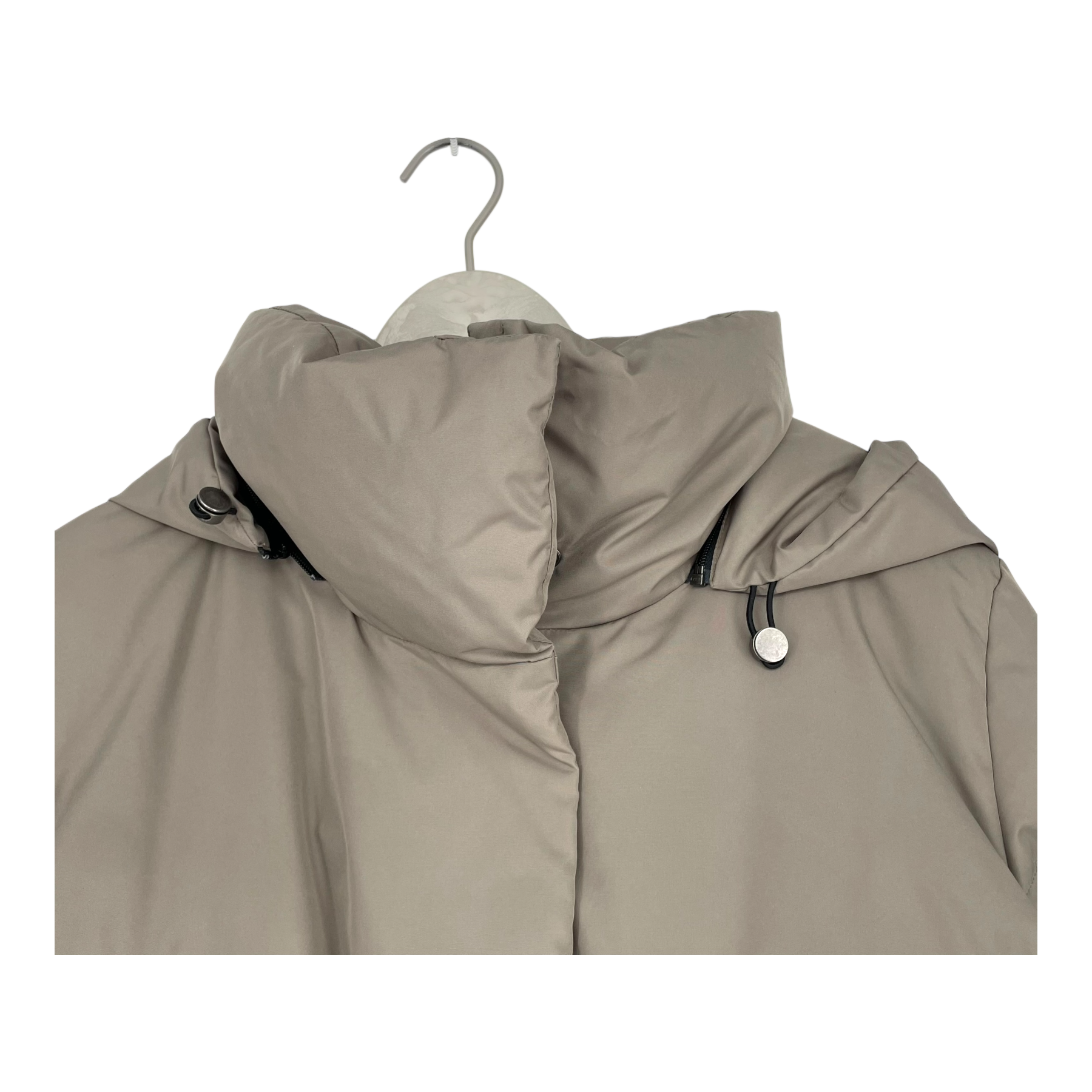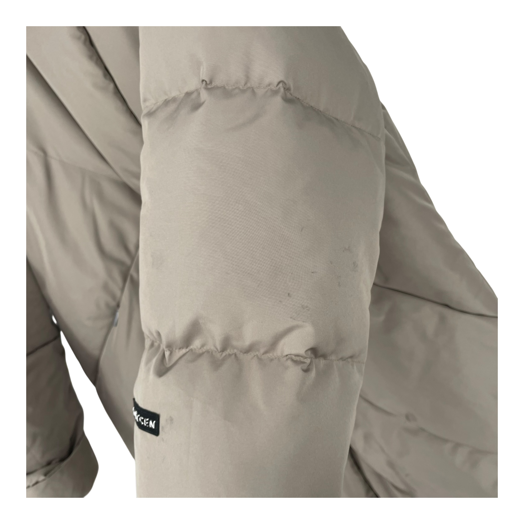 Joutsen Laulu jacket is a down jacket perfect for the colder weathers. There is two pockets with concealed zippers. The snap buttons and the double-slider fastening zipper adds comfortability and daily functionality in the front. There is a large warm hood that that can be adjusted with a drawstring or removed with a zipper. The sleeves can be rolled up for a better fit.