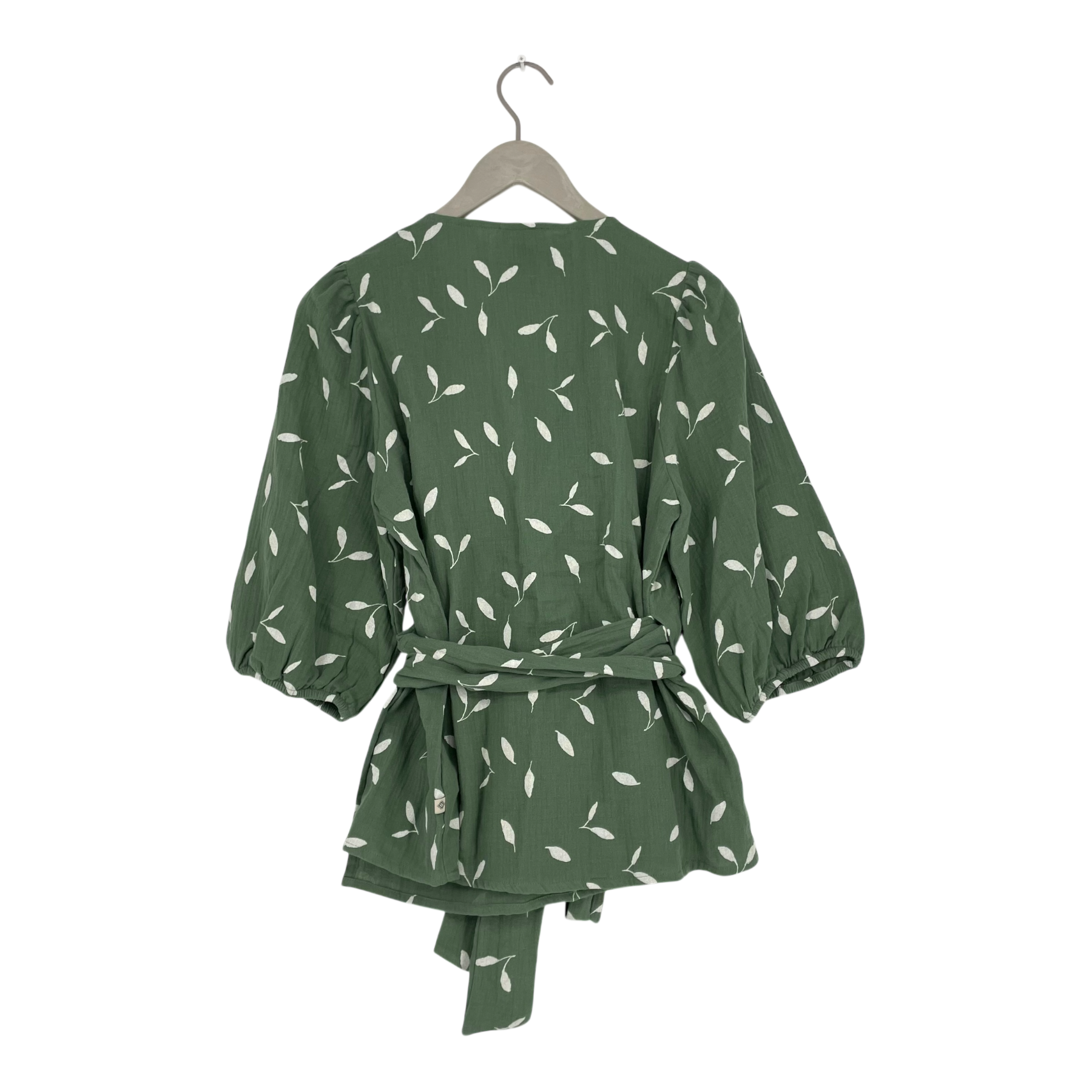 Kaiko wrap blouse has loose half-length balloon-sleeves and ties at the waist with long straps. The cuffs are elasticated, and gathering at the shoulders creates additional volume to the sleeves. Kaiko wrap blouse is made from woven organic cotton muslin with a lively texture.