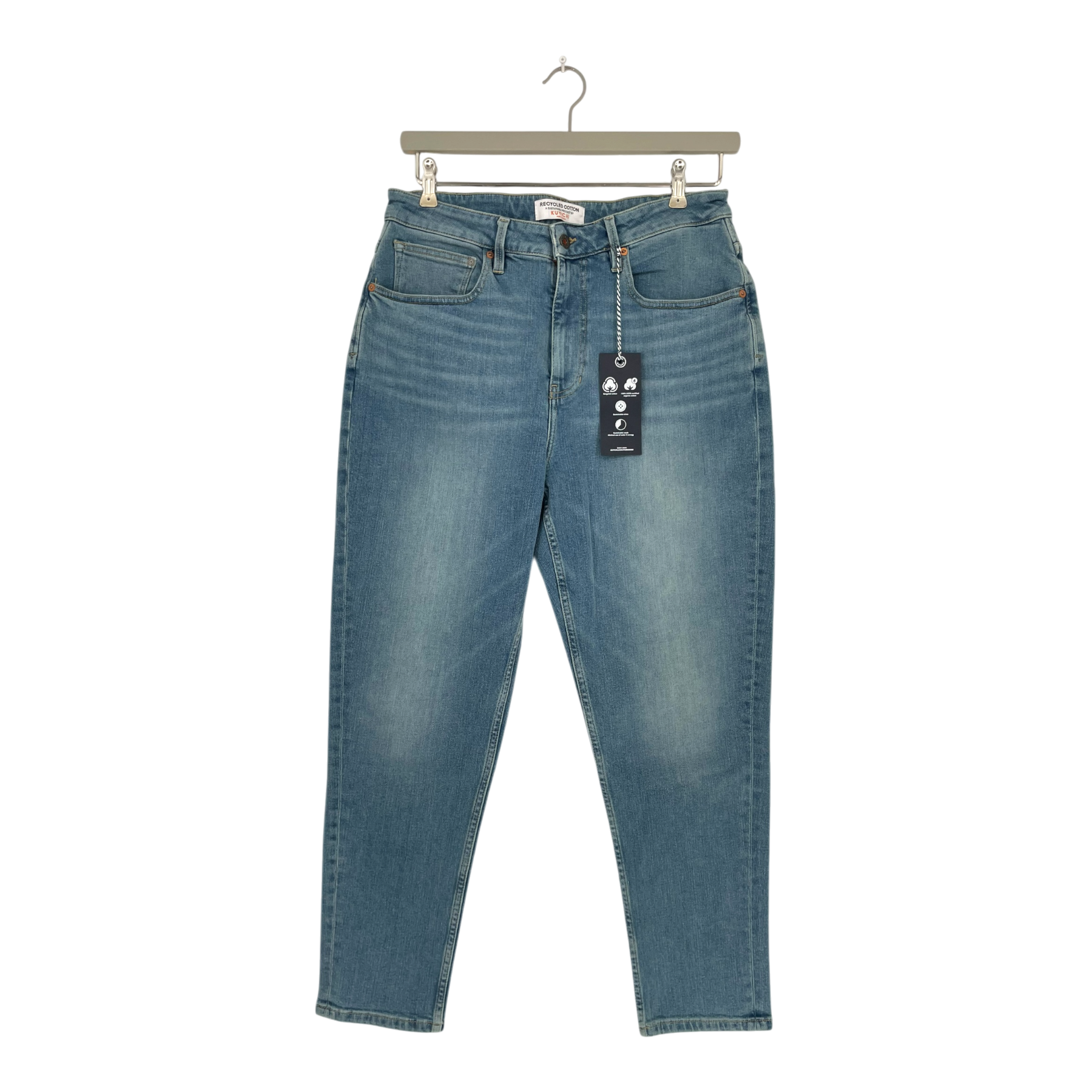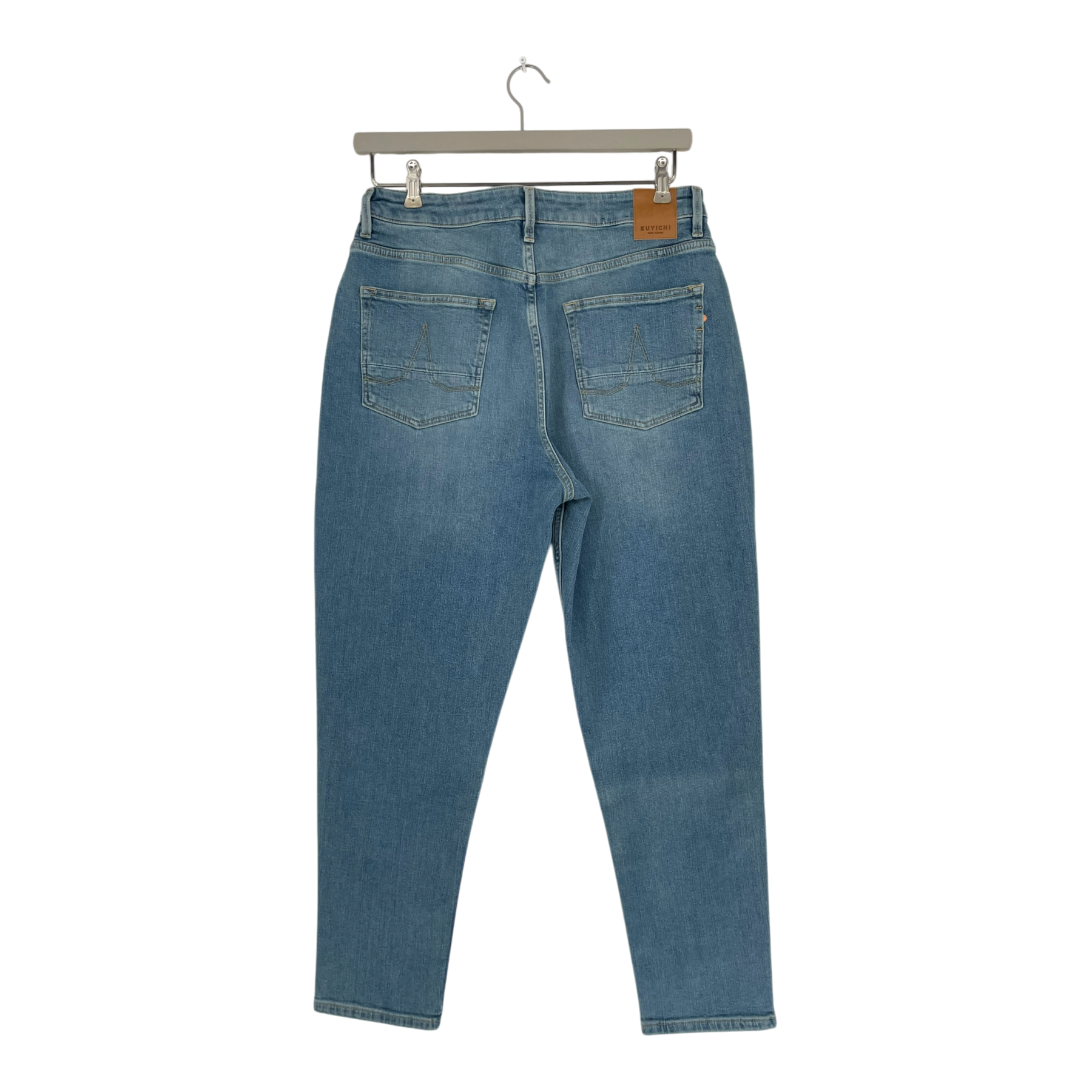 Kuyichi Nora Loose Tapered high-waisted straight-leg jeans in light blue wash. Classic five-pocket styling with button and zip closure.