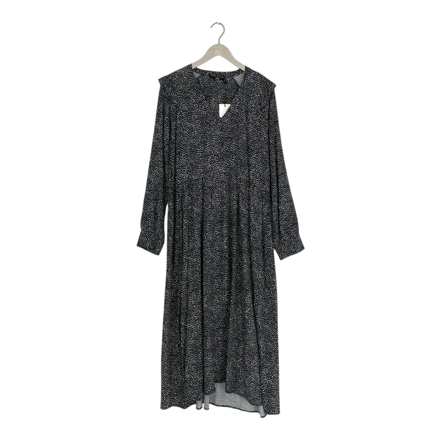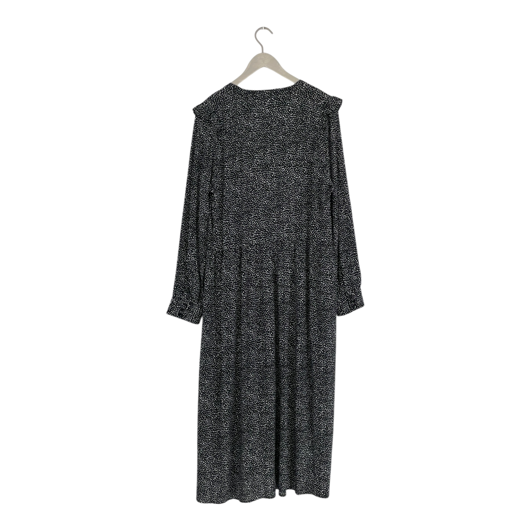 Lanius midi dress in black with small white spotted pattern. Features long sleeves, round neckline with small keyhole detail at front, and relaxed fit through the body. The dress has a flowing silhouette with subtle gathering at the waistline.