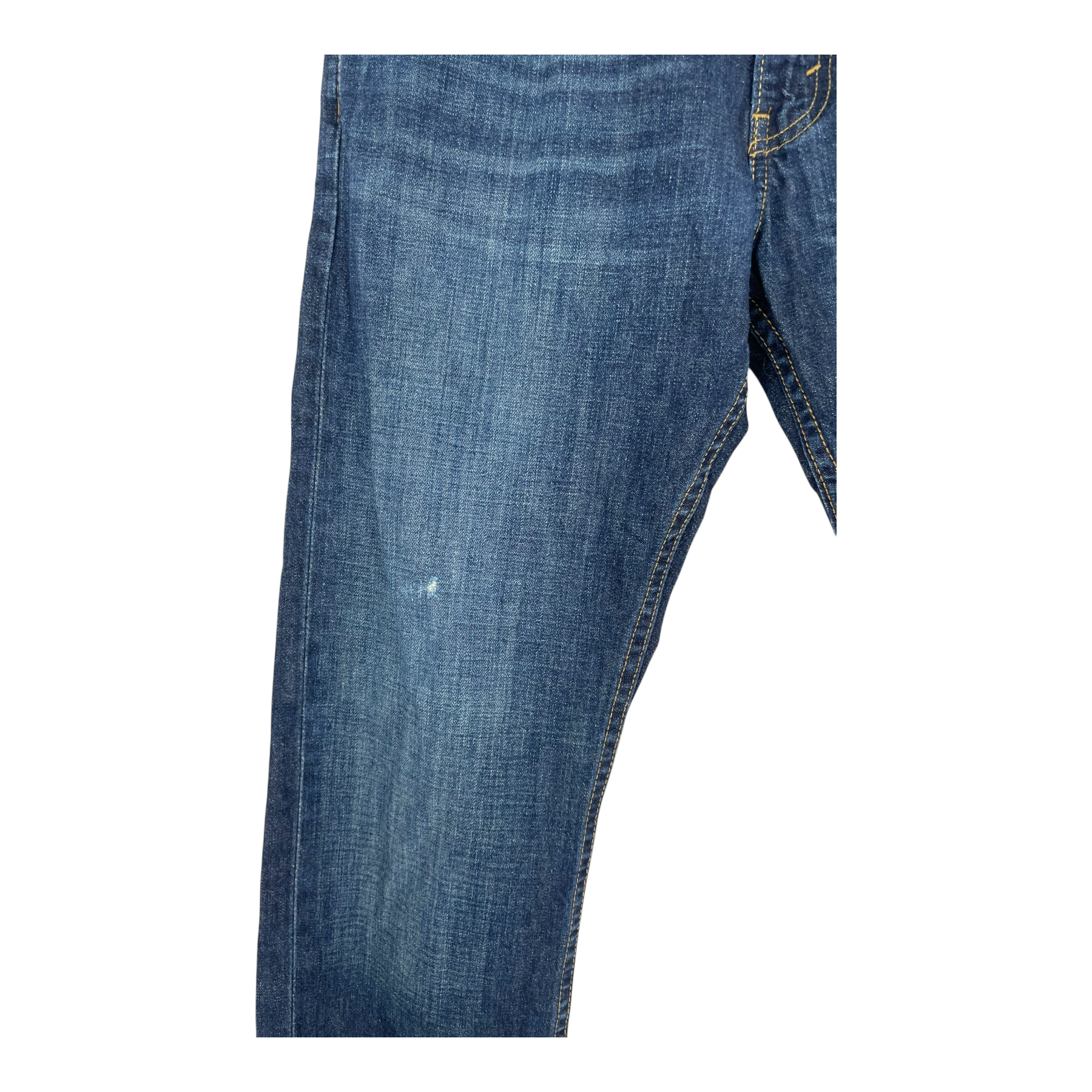 Levi's 514 classic straight jeans in denim blue. The fabric has worn out on the left knee. Zipper fly.