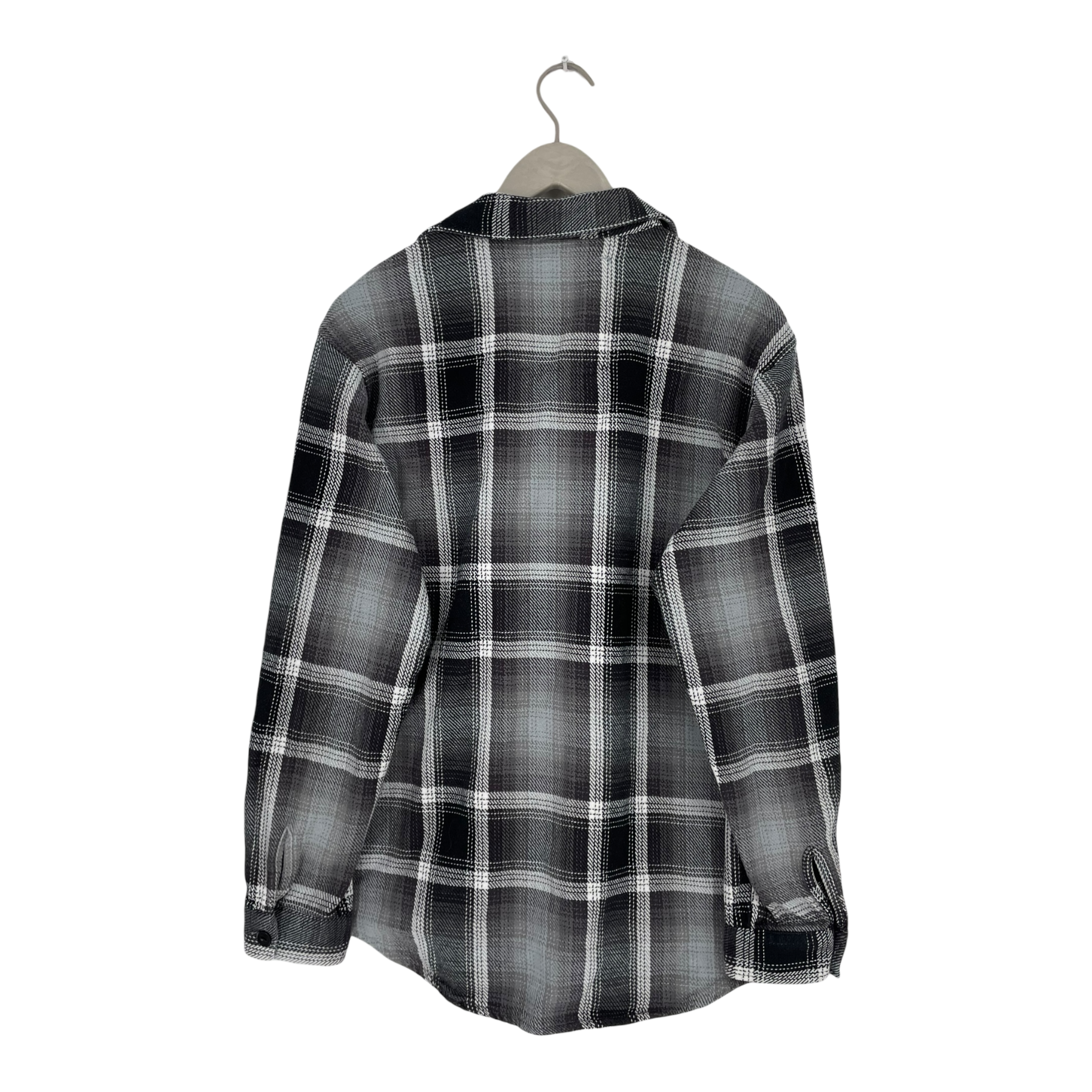 Makia Cabin classic buttoned overshirt from organic, textured cotton with stand up collar and cat eye buttons. Spare button included in the laundry tag. The laundry tag is somewhat worn and the fabric of the shirt is stiff. This might be from the wash or part of the shirts original design.