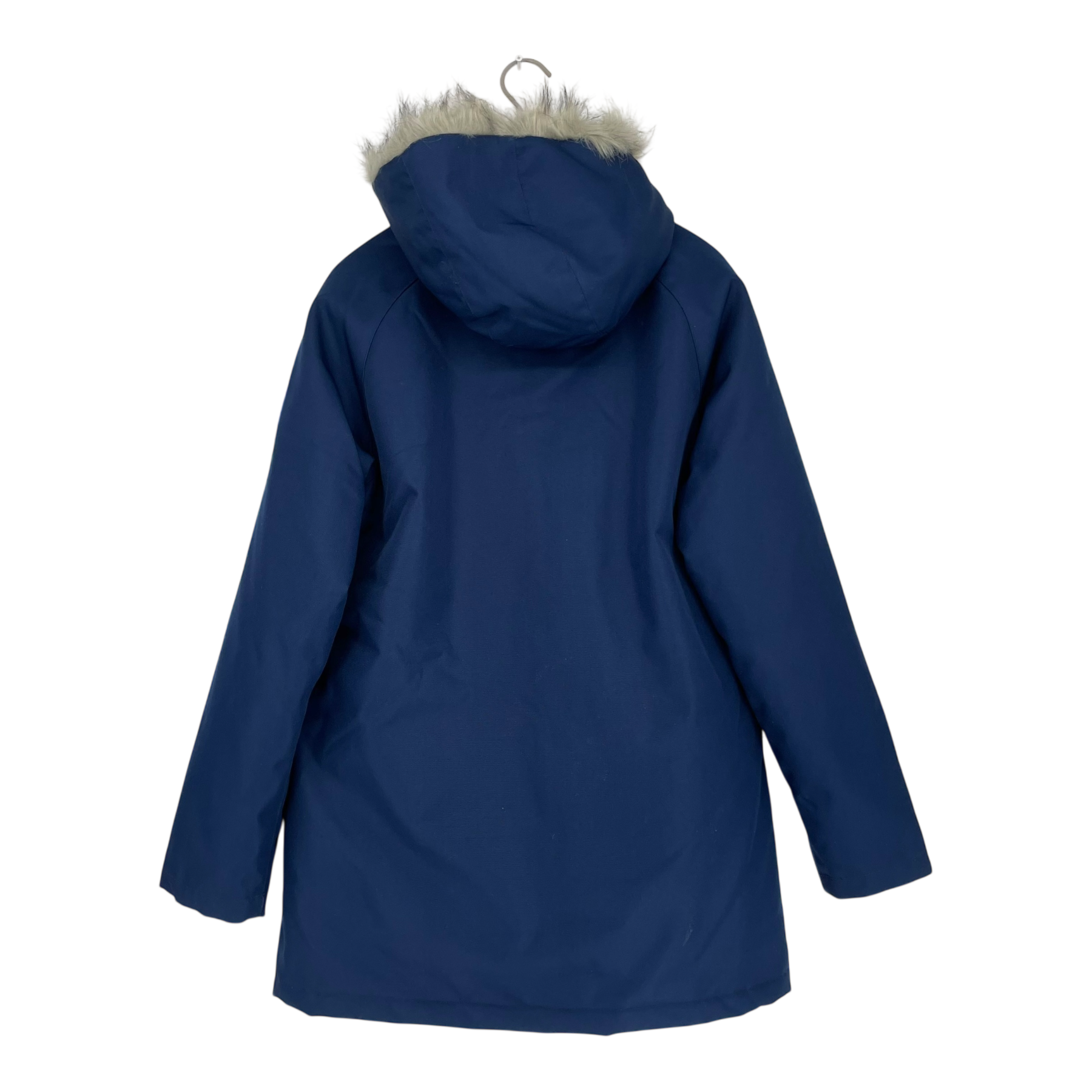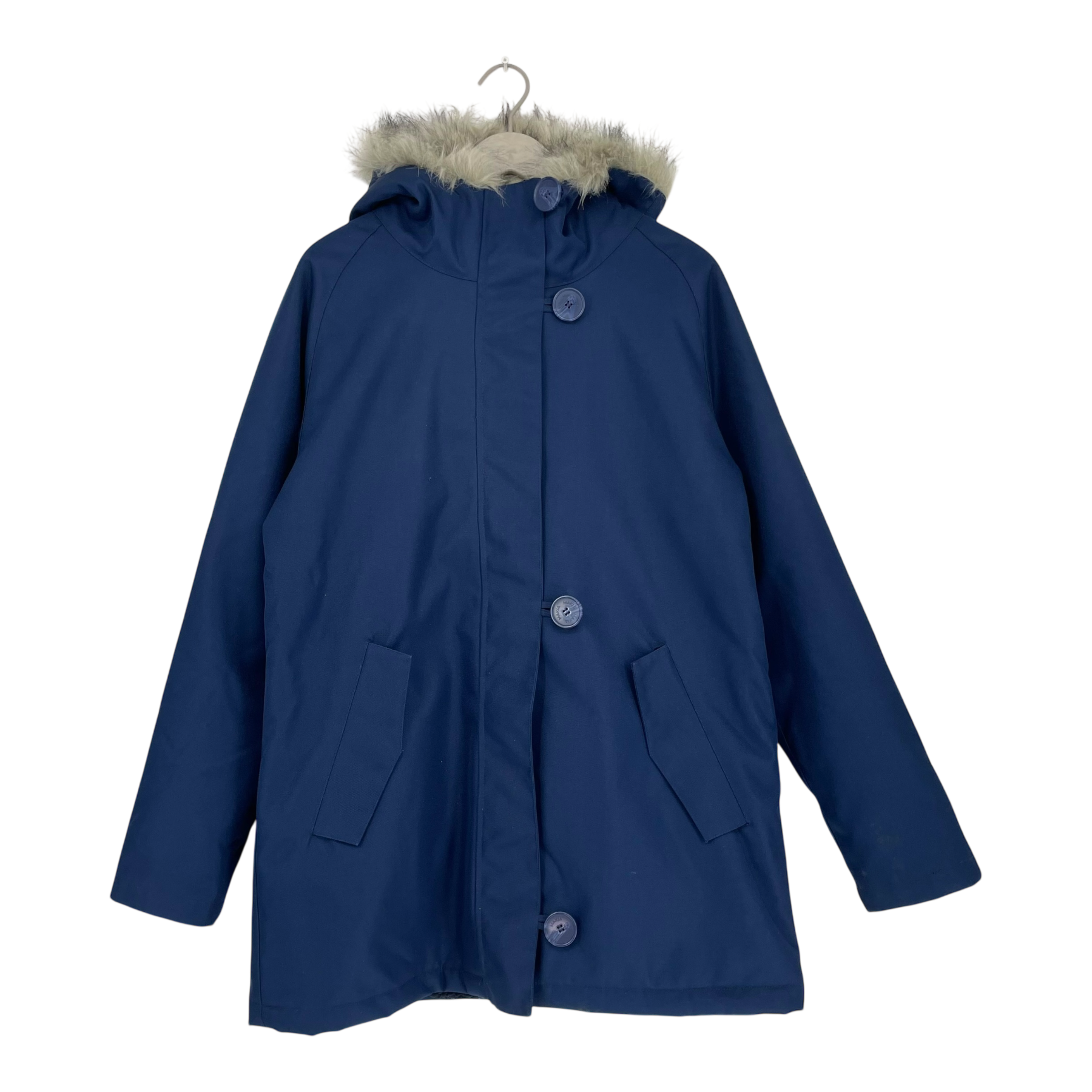 Makia mens winter parka jacket with faux fur lining and large buttons.