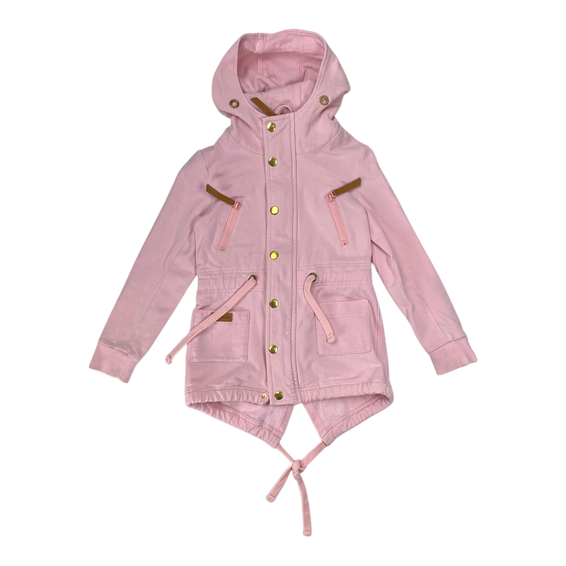 Metsola long sleeved sweat hoodie and zipper and press button fastening in the front and a daw string on the waist and on the hemline, a slit at the back and front pockets. The daw string on the hood is missing. The coat’s buttons are slightly worn.