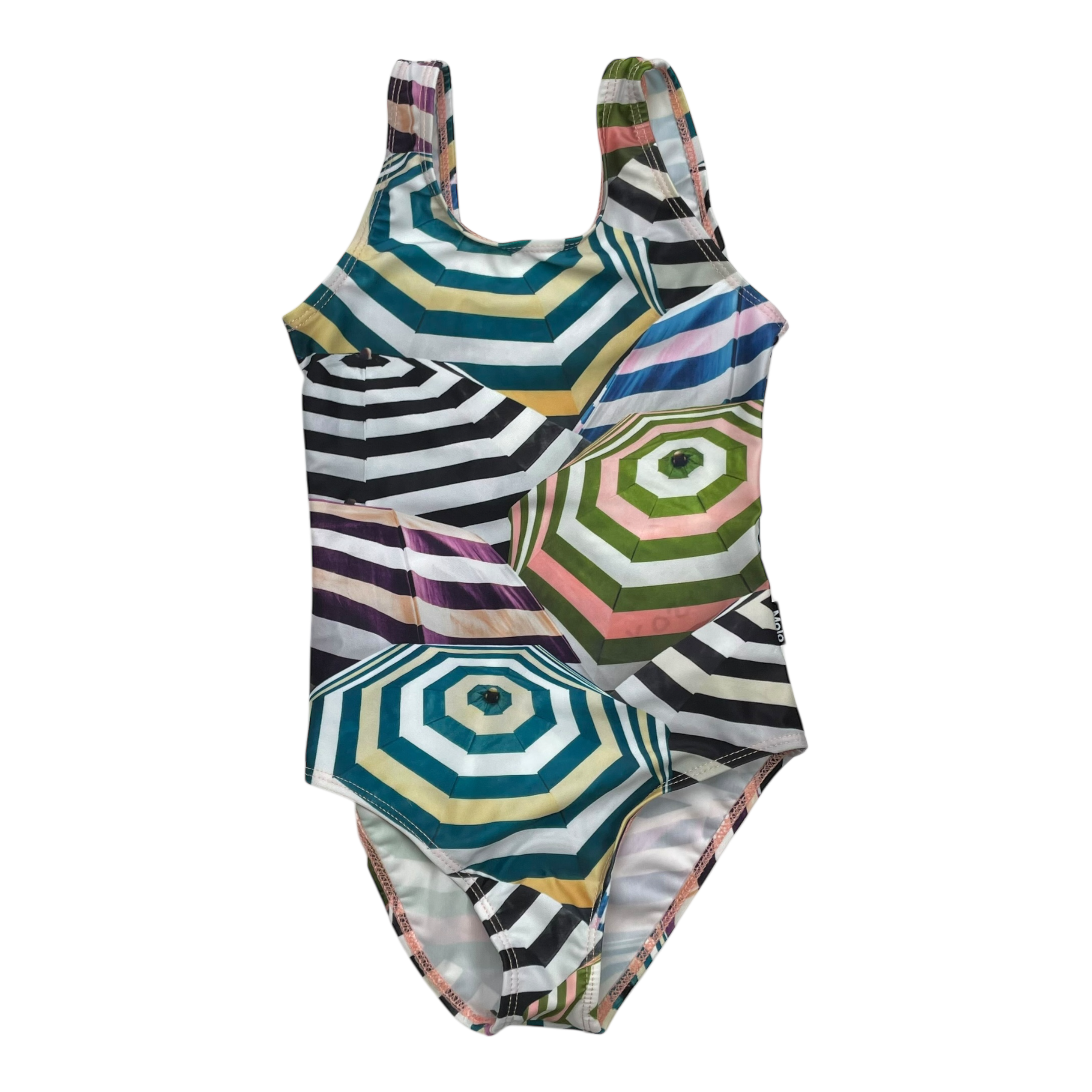 Molo sporty swimsuit for active children in recycled polyester with UV protection 50+. The swimsuit has a regular fit, is fully lined, has wide straps, and a deep back.