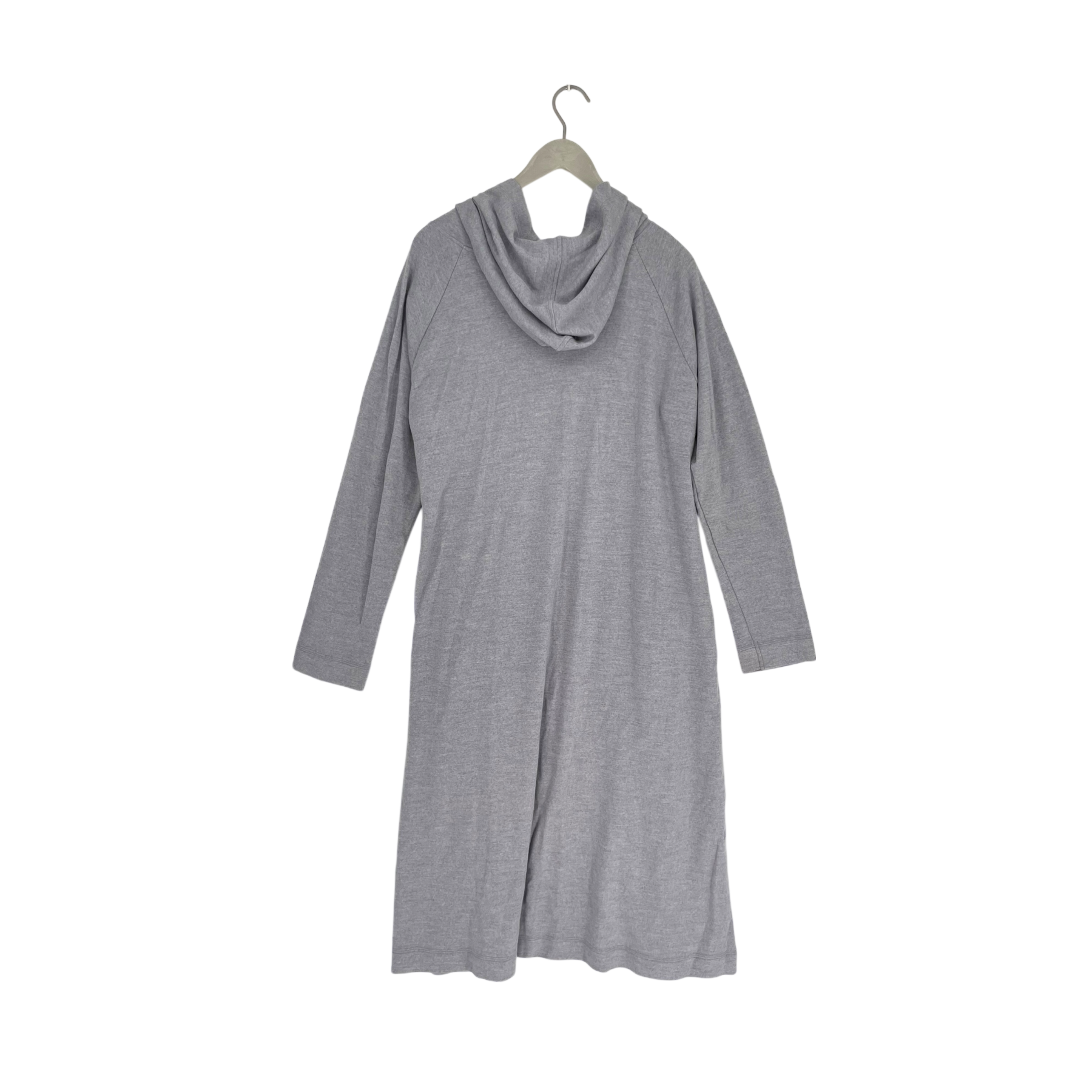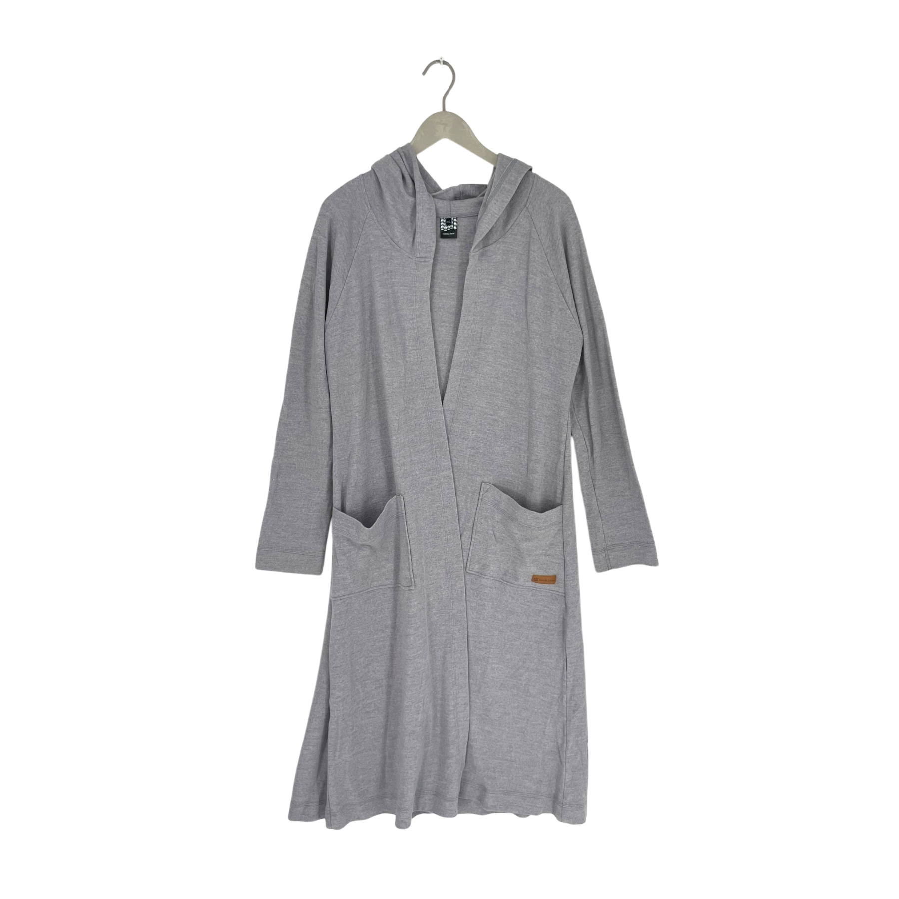 Ommellinen merinowool cardigan. Under the knee-length knit with pockets and a hood. The knitted cardigan has a few small holes in the hood.