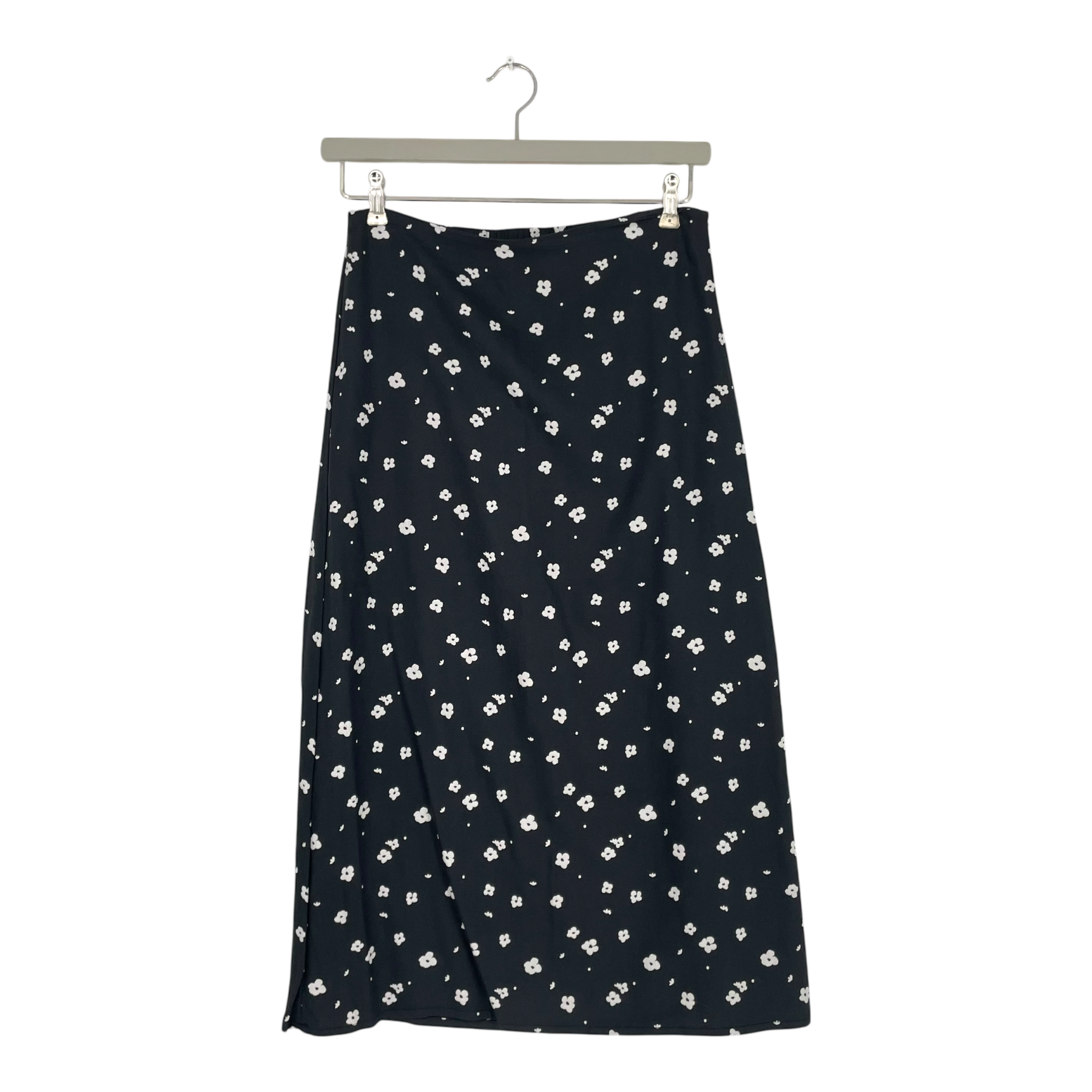 R-Collection skirt in white all-over floral print. The skirt features a midi-length cut, zipper on the side and a stretchy elastic waist band on the back.