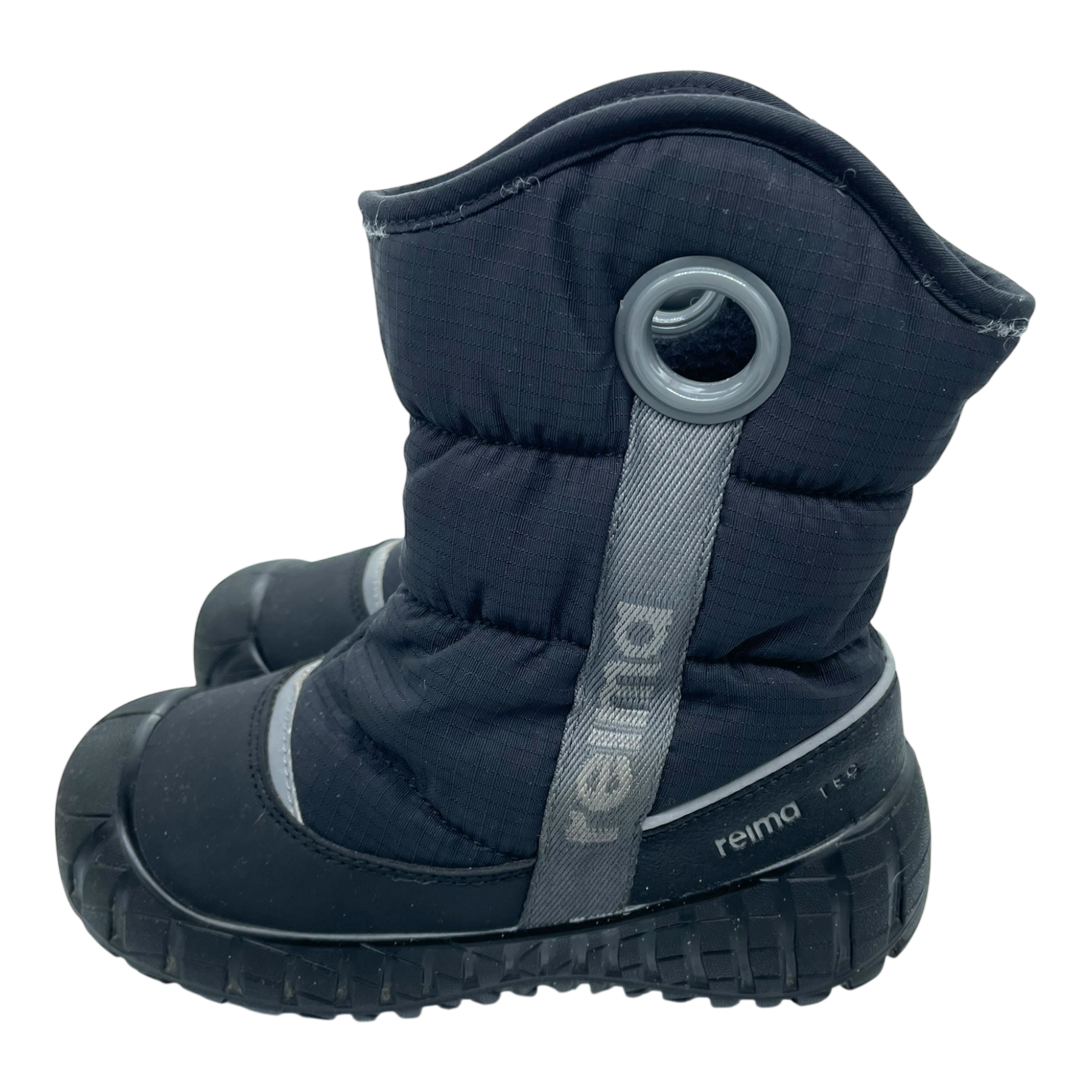 Reima Mega Mini winter boots with a warm 200 g wadding insulation and fleece lining. They're designed with reflective details for increased visibility. Boots are originally waterproof and have a seam-sealed lining with a waterproof membrane, ensuring playtime doesn't have to stop for wet weather.