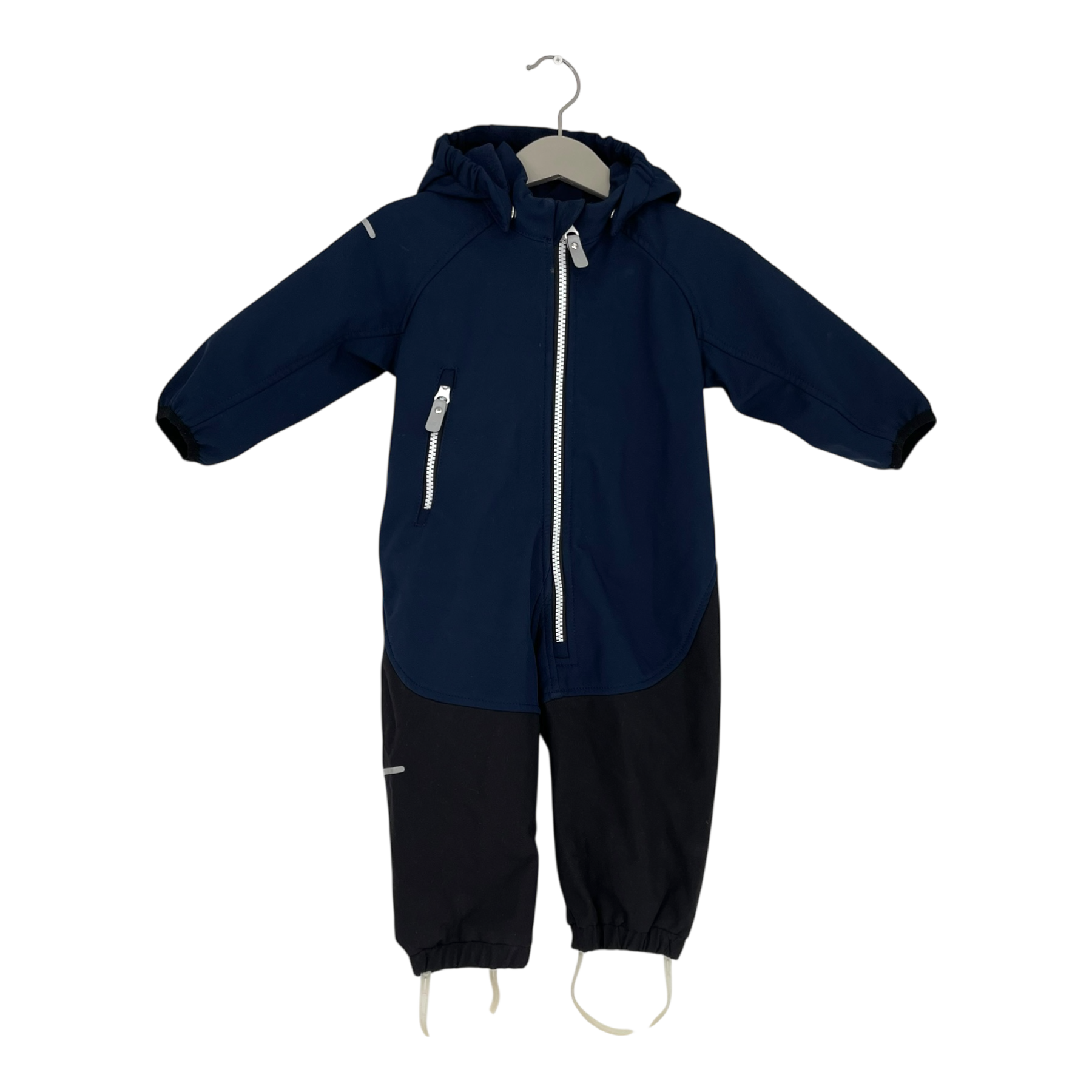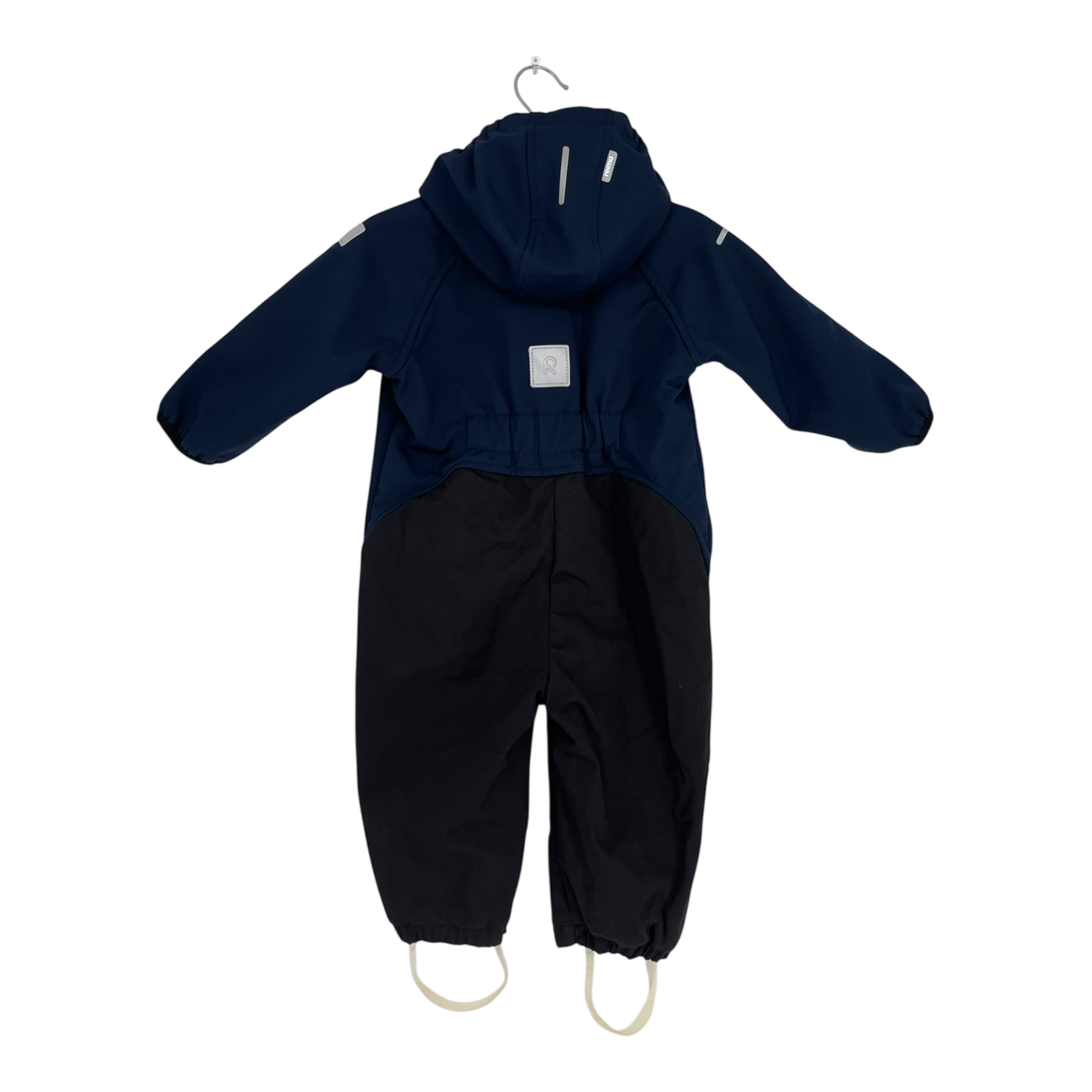 Reima Mjosa softshell midseason overall with detachable hood, one zipper pocket, and detachable foot loops. The material is originally waterproof and the bottom part is very durable.