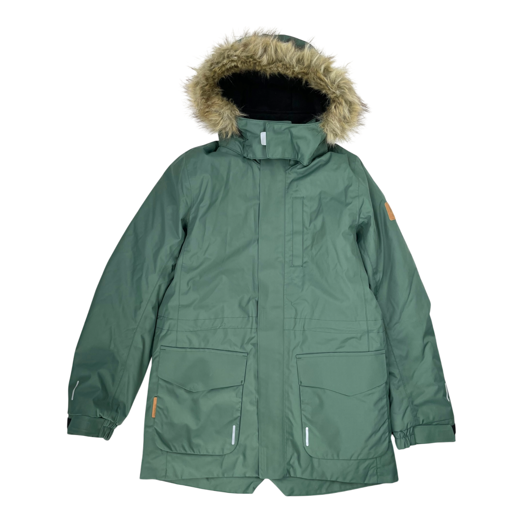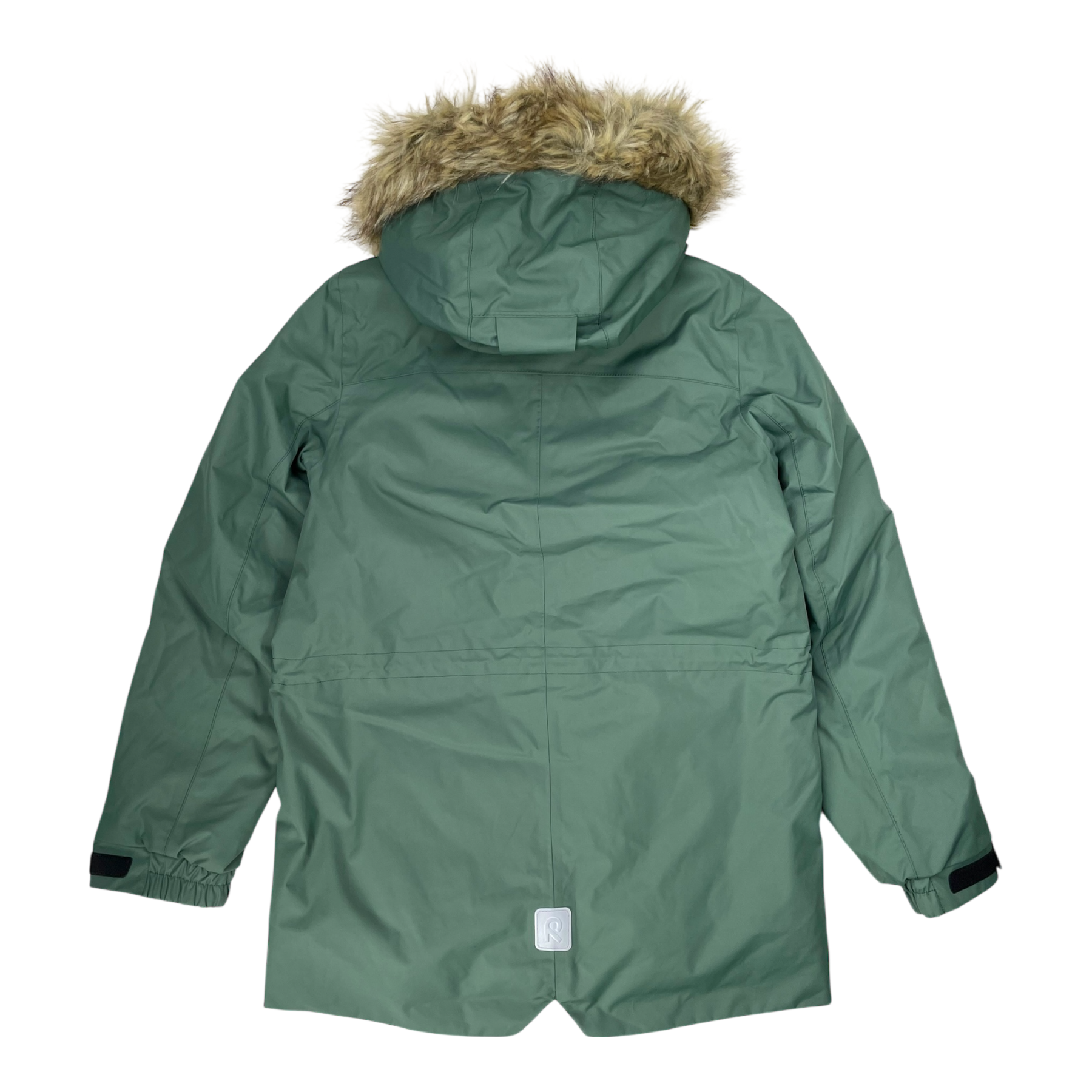 Reima Naapuri winter jacket with detachable faux fur hood, flap pockets, and adjustable waist. Material is originally wind- and waterproof.