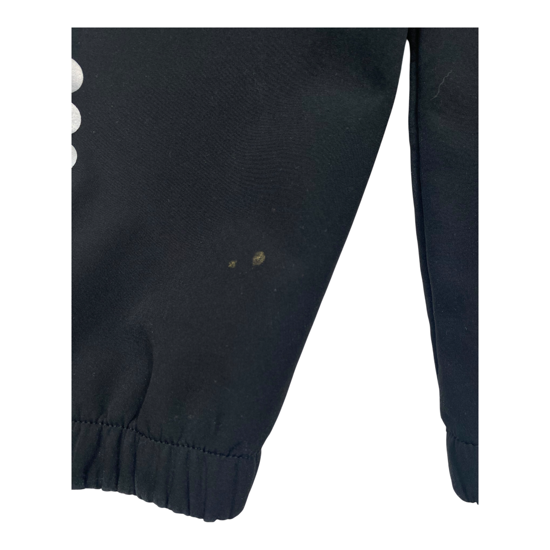 Reima Oikotie kid's outdoor softshell pants has adjustable and elastic waist. Originally waterproof up to 10 000mm water column. The fabric blocks wind outside yet breathes. The item has a small stain.