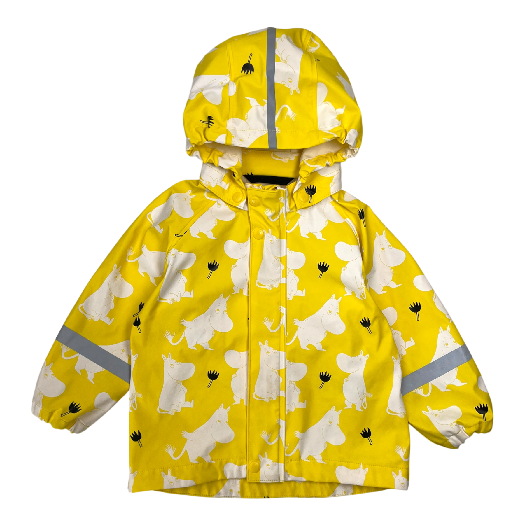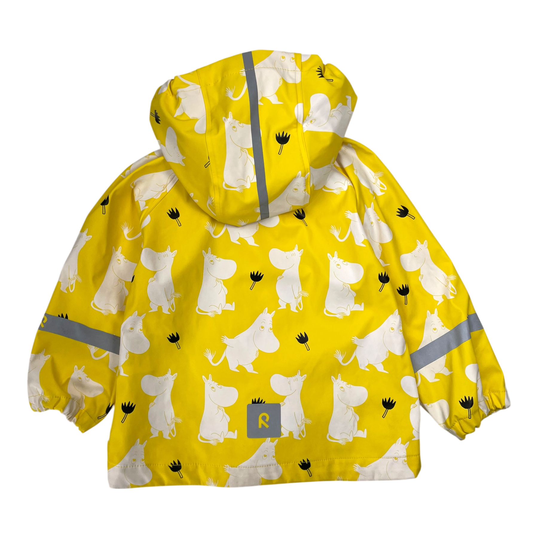 Reima Moomin plask rain jacket for kids with reflective details and a detachable hood.