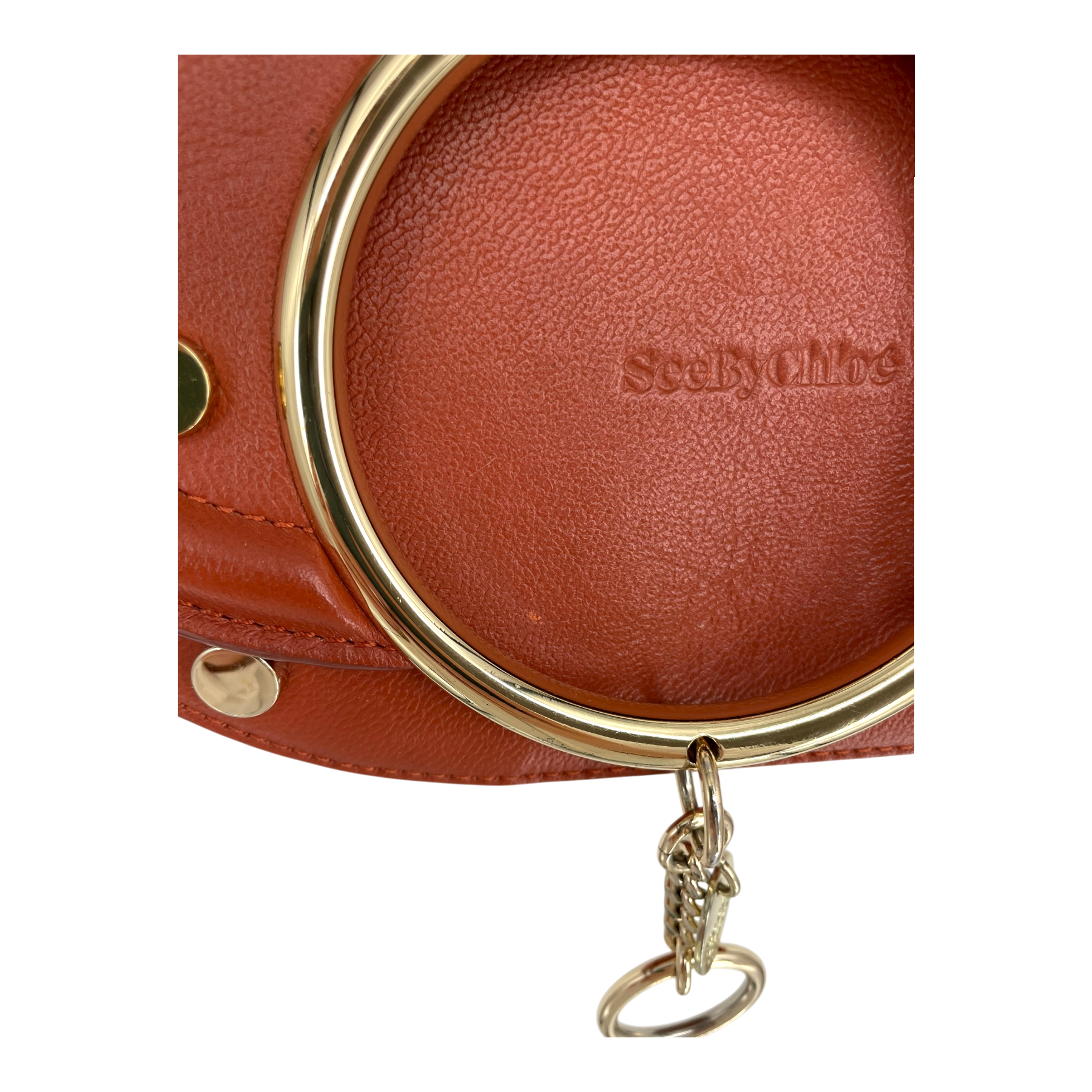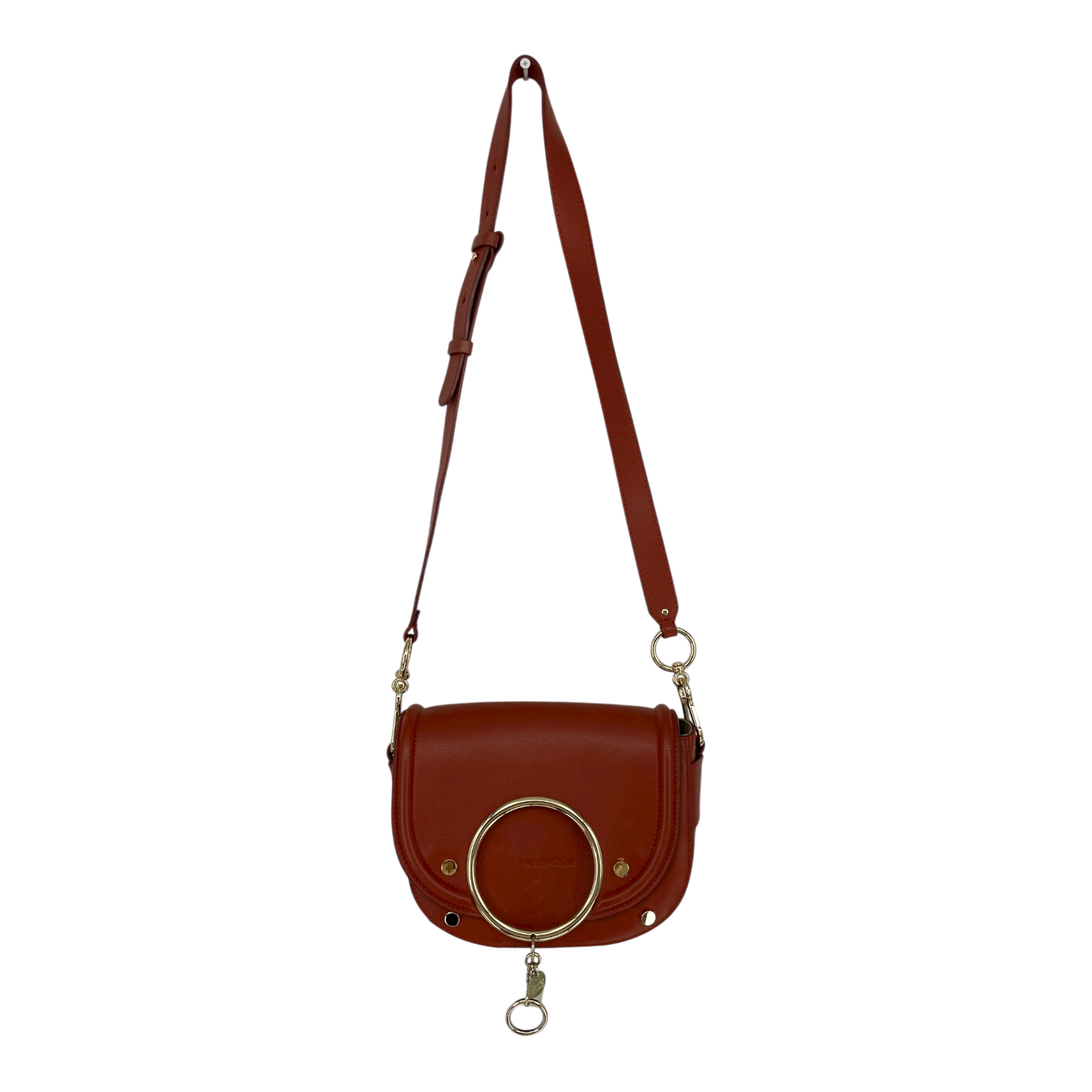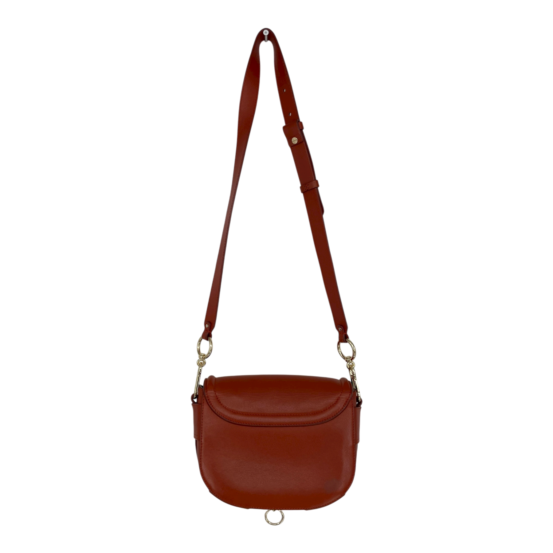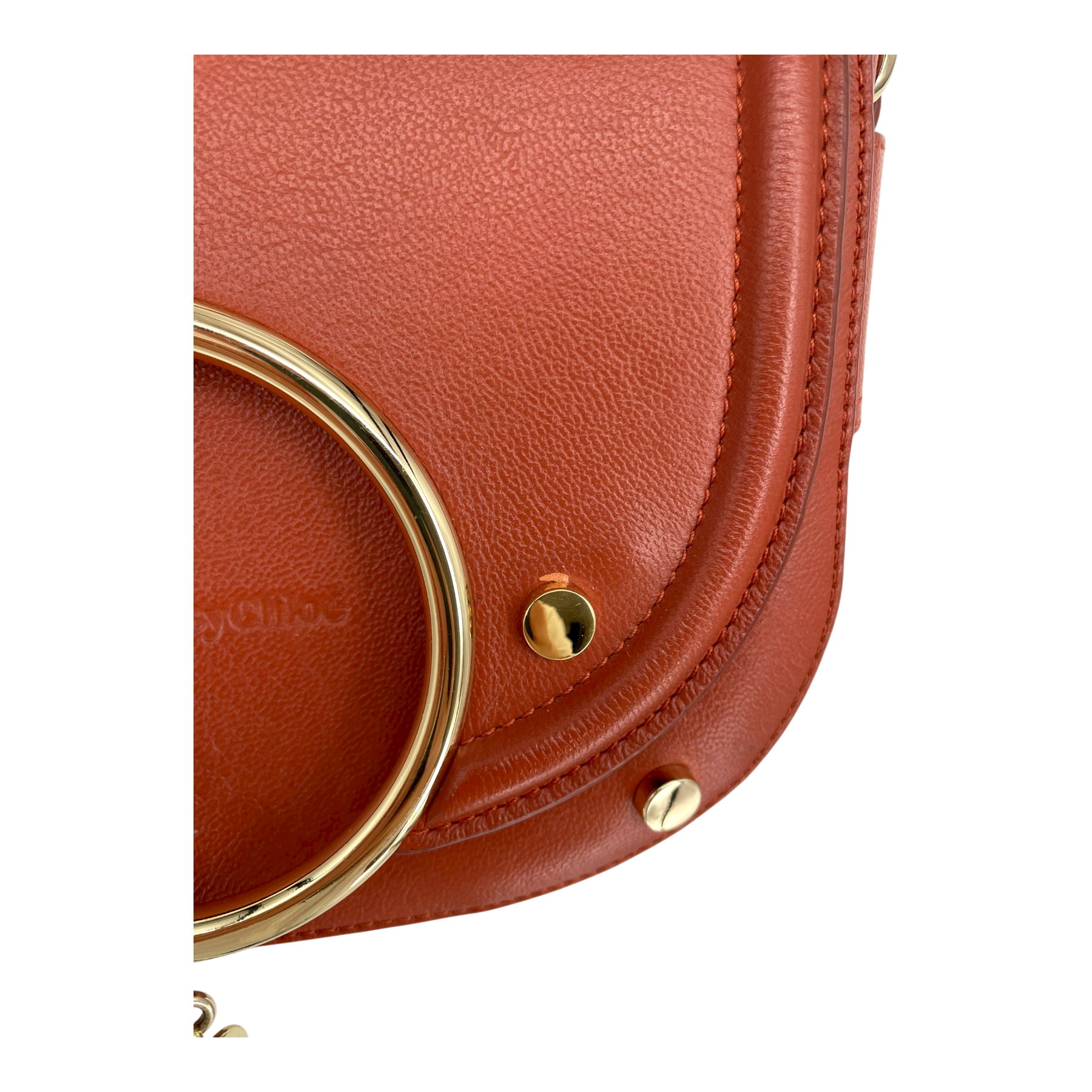 See By Chloé Mara bag in Caramello color. Flap top with magnetic button closure. One main compartment. Interior slip pocket. Front oversized ring with signature See by Chloe logo charms. Embossed "See By Chloe" logo at front. Detachable and adjustable shoulder strap.