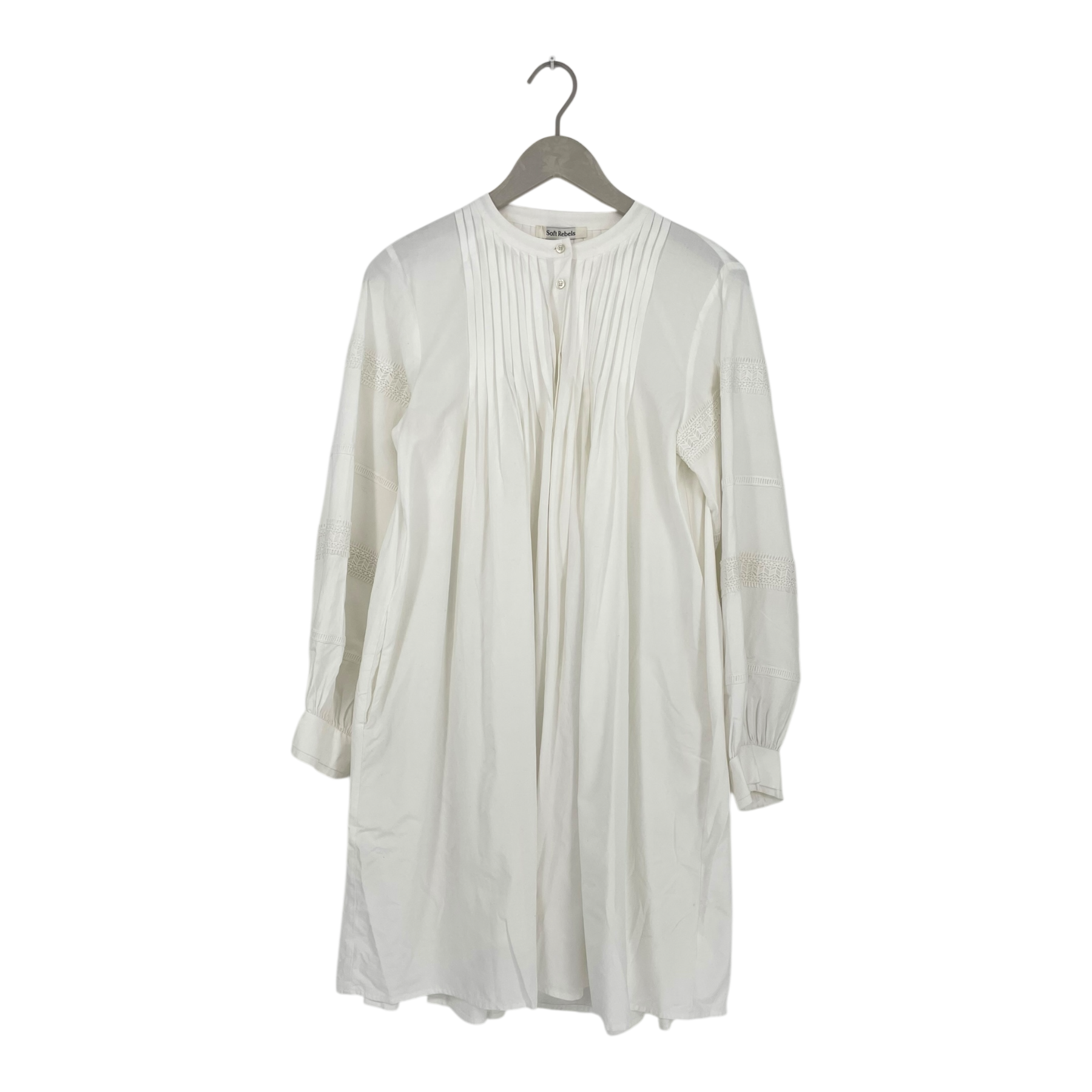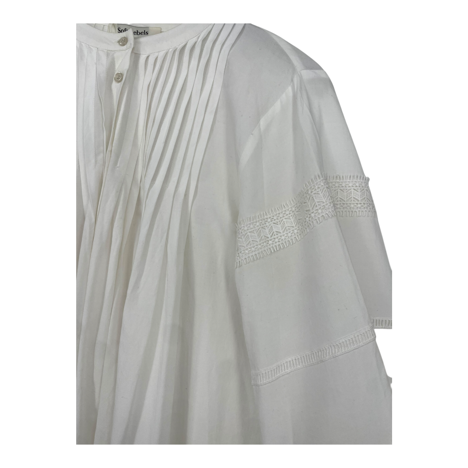 Soft Rebels lace shirt dress with pleat details on the front and back and intricate lace details on the puffy sleeves. The laundry tag is missing.