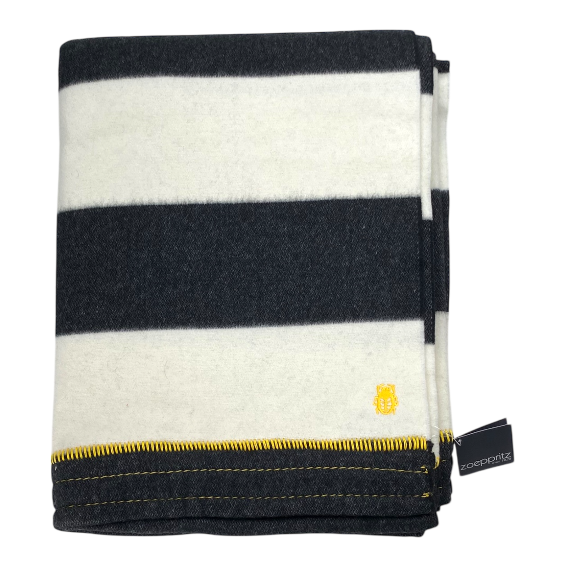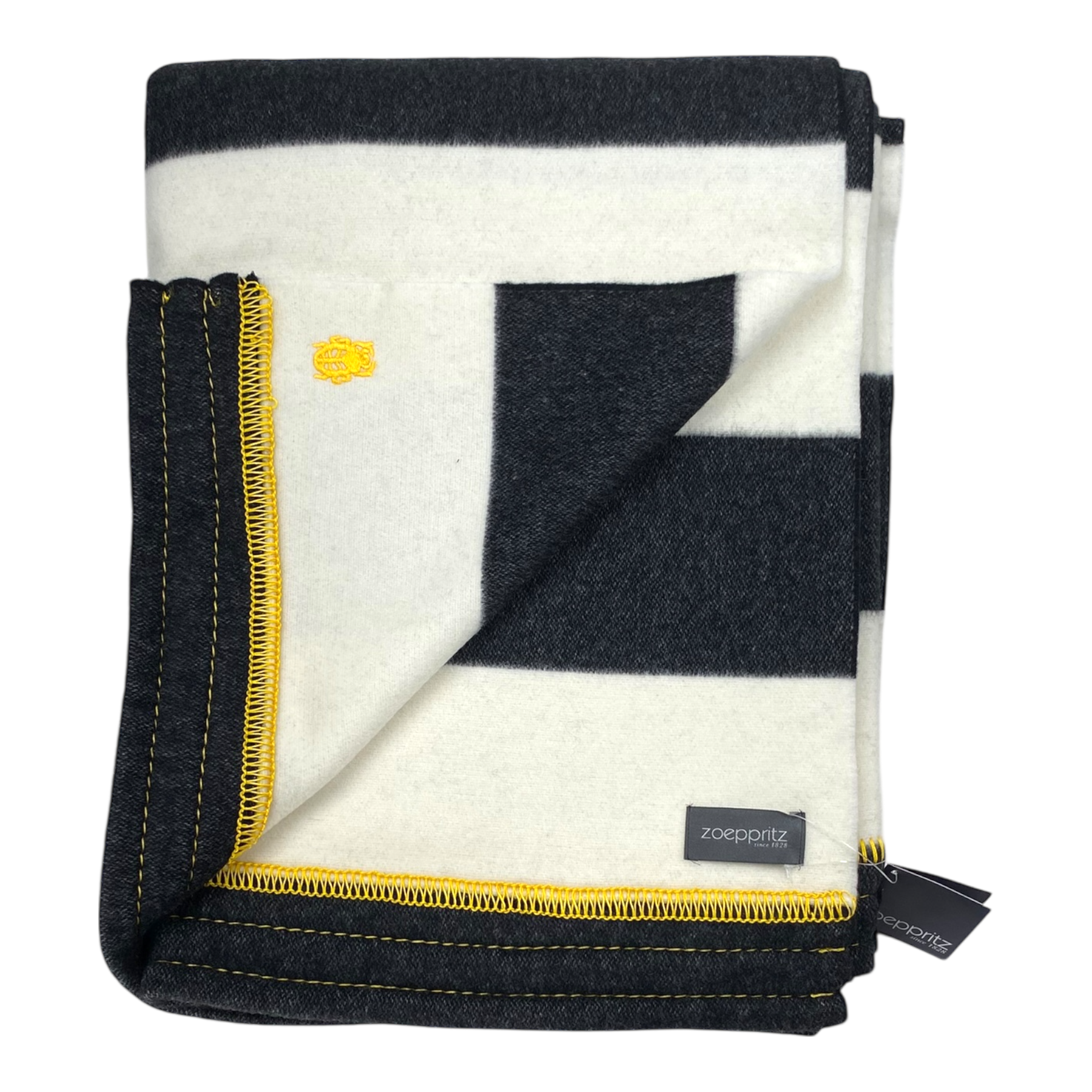 Zoeppritz knitted Trace wool blanket. The blanket has yellow accent stitching along the edges.